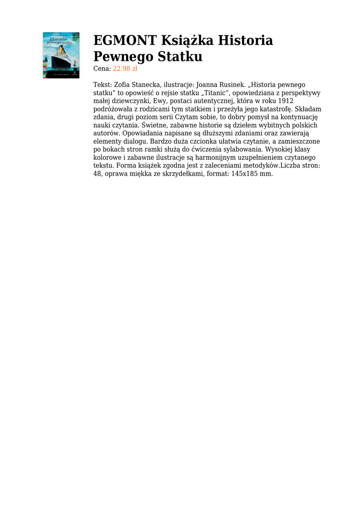 EGMONT Książka Historia Pewnego Statku Cena: 22.98 zł Tekst: Zofia Stanecka, ilustracje: Joanna Rusinek. „Historia pewnego statku” to opowieść o rejsie statku „Titanic”, opowiedziana z perspektywy małej dziewczynki, Ewy, postaci autentycznej, która w roku 1912 podróżowała z rodzicami tym statkiem i przeżyła jego katastrofę. Składam zdania, drugi poziom serii Czytam sobie, to dobry pomysł na kontynuację nauki czytania. Świetne, zabawne historie są dziełem wybitnych polskich autorów. Opowiadania napisane są dłuższymi zdaniami oraz zawierają elementy dialogu. Bardzo duża czcionka ułatwia czytanie, a zamieszczone po bokach stron ramki służą do ćwiczenia sylabowania. Wysokiej klasy kolorowe i zabawne ilustracje są harmonijnym uzupełnieniem czytanego tekstu. Forma książek zgodna jest z zaleceniami metodyków.Liczba stron: 48, oprawa miękka ze skrzydełkami, format: 145x185 mm.