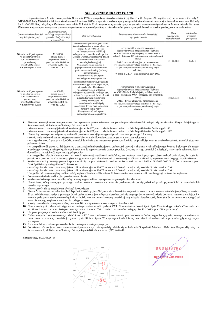 OGŁOSZENIE O PRZETARGACH Na podstawie art. 38 ust. 1 ustawy z dnia 21 sierpnia 1997r. o gospodarce nieruchomościami ( t.j. Dz. U. z 2015r. poz. 1774 z późn. zm.), w związku z Uchwałą Nr VII/67/2015 Rady Miejskiej w Zdzieszowicach z dnia 29 kwietnia 2015r. w sprawie wyrażenia zgody na sprzedaż nieruchomości położonej w Januszkowicach oraz Uchwałą Nr VII/66/2015 Rady Miejskiej w Zdzieszowicach z dnia 29 kwietnia 2015r. w sprawie wyrażenia zgody na sprzedaż nieruchomości położonej w Januszkowicach, Burmistrz Zdzieszowic ogłasza pierwsze przetargi ustne nieograniczone na sprzedaż poniższych nieruchomości gruntowych, położonych w obrębie geodezyjnym Januszkowice: Oznaczenie nieruchoOznaczenie nieruchomości mości wg. danych ewidencji wg. księgi wieczystej gruntów i budynków i jej powierzchnia Nieruchomość jest zapisana w księdze wieczystej OP1K/00035503/1 prowadzonej przez Sąd Rejonowy w Kędzierzynie-Koźlu Nieruchomość jest zapisana w księdze wieczystej OP1K/00035503/1 prowadzonej przez Sąd Rejonowy w Kędzierzynie-Koźlu 1. 2. 3. 4. 5. 6. 7. 8. 9. 10. 11. 12. 13. 14. Opis nieruchomości Przeznaczenie nieruchomości i sposób jej zagospodarowania Cena wywoławcza nieruchomości Minimalna wysokość postąpienia Nr 108/70, arkusz mapy 2, obręb Januszkowice, powierzchnia 0,0481 ha, w tym Bz-0,0481 ha, jedn. rej. G.531 Nieruchomość gruntowa, położna na terenie rekreacyjno-wypoczynkowym, nieopodal ulicy Działkowca w Januszkowicach, w bliskiej odległości od zbiornika wodnego tzw. Jeziora Dużego, w sąsiedztwie działki niezabudowane i zabudowane o funkcji rekreacyjnej. Na nieruchomości znajdują się pojedyncze drzewa oraz zabudowa parterowa w stanie ruiny (po byłej kawiarni-barze). Uzbrojenie: sieć elektryczna i wodociągowa, droga gruntowa. Nieruchomość w miejscowym planie zagospodarowania przestrzennego (Uchwała Nr XXXI/208/96 Rady Miejskiej w Zdzieszowicach z dnia 14 listopada 1996r.) oznaczona jest symbolami planu: 20 RL - tereny rekreacyjne przeznaczone do wypoczynku krótkotrwałego sobotnio-niedzielnego, w tym tereny chronione w południowej części sołectwa, w części 172 KD – ulica dojazdowa klasy D ½. 18.121,84 zł 190,00 zł Nr 108/72, arkusz mapy 2, obręb Januszkowice, powierzchnia 0,0438 ha, w tym Bz-0,0438 ha, jedn. rej. G.531 Nieruchomość gruntowa, położna na terenie rekreacyjno-wypoczynkowym, nieopodal ulicy Działkowca w Januszkowicach, w bliskiej odległości od zbiornika wodnego tzw. Jeziora Dużego, w sąsiedztwie działki niezabudowane i zabudowane o funkcji rekreacyjnej. Na nieruchomości znajdują się pojedyncze drzewa oraz naniesienia tarasu w stanie ruiny. Uzbrojenie: sieć elektryczna i wodociągowa, droga gruntowa. Nieruchomość w miejscowym planie zagospodarowania przestrzennego (Uchwała Nr XXXI/208/96 Rady Miejskiej w Zdzieszowicach z dnia 14 listopada 1996r.) oznaczona jest symbolem planu: 20 RL - tereny rekreacyjne przeznaczone do wypoczynku krótkotrwałego sobotnio-niedzielnego, w tym tereny chronione w południowej części sołectwa. 18.897,55 zł 190,00 zł Pierwsze przetargi ustne nieograniczone dot. sprzedaży prawa własności do powyższych nieruchomości, odbędą się w siedzibie Urzędu Miejskiego w Zdzieszowicach, ul. Bolesława Chrobrego 34, w sali nr B-112: - nieruchomości oznaczonej jako działka ewidencyjna nr 108/70, a.m. 2, obręb Januszkowice - dnia 26 października 2016r. o godz. 900 - nieruchomości oznaczonej jako działka ewidencyjna nr 108/72, a.m. 2, obręb Januszkowice - dnia 26 października 2016r. o godz. 1100 Uczestnicy przetargu zobowiązani są posiadać i przedłożyć komisji przetargowej przed otwarciem przetargu dokumenty: - dowód wniesienia wadium na zakup nieruchomości w terminie i kwocie wyznaczonym w niniejszym ogłoszeniu - w przypadku osób fizycznych – dowód tożsamości. Jeżeli oferenta reprezentuje pełnomocnik winien on przedłożyć wraz ze swoim dowodem tożsamości, stosowne pełnomocnictwo - w przypadku osób prawnych lub jednostek organizacyjnych nie posiadających osobowości prawnej – aktualny wypis z Krajowego Rejestru Sądowego lub innego właściwego rejestru, z którego będzie wynikało prawo do reprezentowania danego podmiotu (wydany w ciągu ostatnich 3 miesięcy), właściwych pełnomocnictw, dowodów tożsamości osób reprezentujących podmiot - w przypadku nabycia nieruchomości w ramach ustawowej wspólności małżeńskiej, do przetargu winni przystąpić oboje małżonkowie chyba, że zostanie przedłożona przez uczestnika przetargu pisemna zgoda na nabycie nieruchomości do ustawowej wspólności małżeńskiej wyrażona przez drugiego współmałżonka. Wadium uczestnicy przetargu powinni wpłacić w pieniądzu, przez dokonanie przelewu na konto bankowe nr: 17 8883 1015 2002 0010 5910 0002 prowadzone przez Bank Spółdzielczy w Gogolinie o/Zdzieszowice: - na zakup nieruchomości oznaczonej jako działka ewidencyjna nr 108/70 w kwocie 1.800,00 zł - najpóźniej do dnia 20 października 2016r. - na zakup nieruchomości oznaczonej jako działka ewidencyjna nr 108/72 w kwocie 2.000,00 zł - najpóźniej do dnia 20 października 2016r. Uwaga: Na dokumencie wpłaty wadium należy wpisać - Wadium – Nieruchomość Januszkowice oraz numer działki ewidencyjnej, na którą jest wpłacane. Dowodem wniesienia wadium jest potwierdzenie z banku. Wadium wniesione przez uczestnika, który przetarg wygrał zalicza się na poczet ceny nabycia nieruchomości. Uczestnikom, którzy nie wygrali przetargu, wadium zostanie zwrócone niezwłocznie przelewem, nie później jednak niż przed upływem 3 dni od zamknięcia lub odwołania przetargu. Nieruchomości nie są przedmiotem obciążeń i zobowiązań. Gmina Zdzieszowice zawiadomi osobę lub podmiot ustalony, jako Nabywca nieruchomości o miejscu i terminie zawarcia umowy notarialnej najpóźniej w terminie 21 dni od dnia rozstrzygnięcia przetargu. Jeżeli osoba ustalona jako nabywca ni