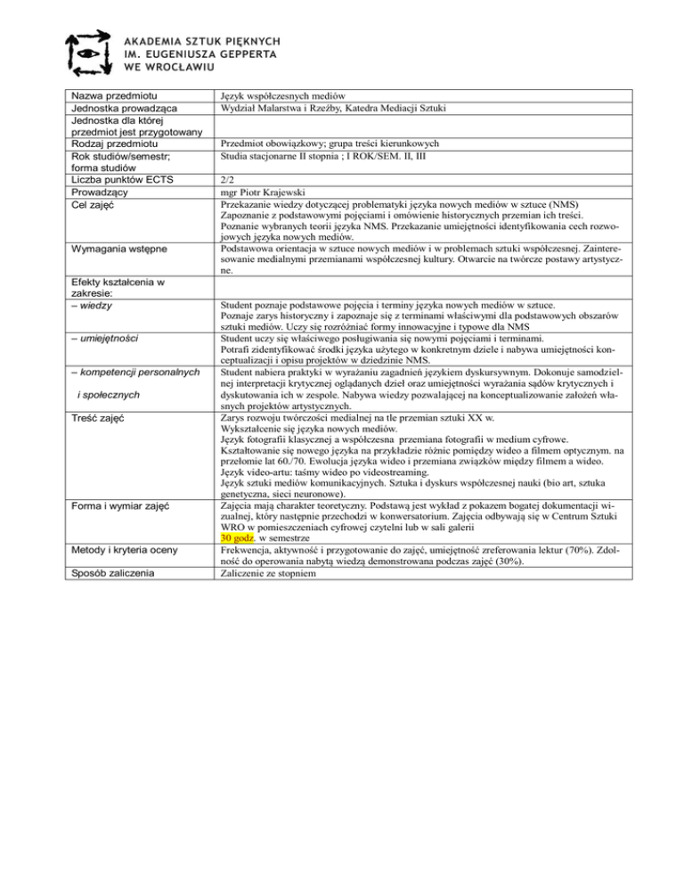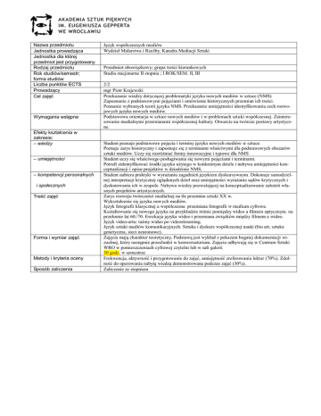 Nazwa przedmiotu Jednostka prowadząca Jednostka dla której przedmiot jest przygotowany Rodzaj przedmiotu Rok studiów/semestr; forma studiów Liczba punktów ECTS Prowadzący Cel zajęć Wymagania wstępne Efekty kształcenia w zakresie: – wiedzy – umiejętności – kompetencji personalnych i społecznych Treść zajęć Forma i wymiar zajęć Metody i kryteria oceny Sposób zaliczenia Język współczesnych mediów Wydział Malarstwa i Rzeźby, Katedra Mediacji Sztuki Przedmiot obowiązkowy; grupa treści kierunkowych Studia stacjonarne II stopnia ; I ROK/SEM. II, III 2/2 mgr Piotr Krajewski Przekazanie wiedzy dotyczącej problematyki języka nowych mediów w sztuce (NMS) Zapoznanie z podstawowymi pojęciami i omówienie historycznych przemian ich treści. Poznanie wybranych teorii języka NMS. Przekazanie umiejętności identyfikowania cech rozwojowych języka nowych mediów. Podstawowa orientacja w sztuce nowych mediów i w problemach sztuki współczesnej. Zainteresowanie medialnymi przemianami współczesnej kultury. Otwarcie na twórcze postawy artystyczne. Student poznaje podstawowe pojęcia i terminy języka nowych mediów w sztuce. Poznaje zarys historyczny i zapoznaje się z terminami właściwymi dla podstawowych obszarów sztuki mediów. Uczy się rozróżniać formy innowacyjne i typowe dla NMS Student uczy się właściwego posługiwania się nowymi pojęciami i terminami. Potrafi zidentyfikować środki języka użytego w konkretnym dziele i nabywa umiejętności konceptualizacji i opisu projektów w dziedzinie NMS. Student nabiera praktyki w wyrażaniu zagadnień językiem dyskursywnym. Dokonuje samodzielnej interpretacji krytycznej oglądanych dzieł oraz umiejętności wyrażania sądów krytycznych i dyskutowania ich w zespole. Nabywa wiedzy pozwalającej na konceptualizowanie założeń własnych projektów artystycznych. Zarys rozwoju twórczości medialnej na tle przemian sztuki XX w. Wykształcenie się języka nowych mediów. Język fotografii klasycznej a współczesna przemiana fotografii w medium cyfrowe. Kształtowanie się nowego języka na przykładzie różnic pomiędzy wideo a filmem optycznym. na przełomie lat 60./70. Ewolucja języka wideo i przemiana związków między filmem a wideo. Język video-artu: taśmy wideo po videostreaming. Język sztuki mediów komunikacyjnych. Sztuka i dyskurs współczesnej nauki (bio art, sztuka genetyczna, sieci neuronowe). Zajęcia mają charakter teoretyczny. Podstawą jest wykład z pokazem bogatej dokumentacji wizualnej, który następnie przechodzi w konwersatorium. Zajęcia odbywają się w Centrum Sztuki WRO w pomieszczeniach cyfrowej czytelni lub w sali galerii 30 godz. w semestrze Frekwencja, aktywność i przygotowanie do zajęć, umiejętność zreferowania lektur (70%). Zdolność do operowania nabytą wiedzą demonstrowana podczas zajęć (30%). Zaliczenie ze stopniem Literatura Marshall McLuhan, Przekaźnik jest przekazem, Przekaźniki „zimne” i „gorące” [w:] tegoż, Zrozumieć media. Przedłużenia człowieka, Warszawa 2007; Lev Manovich, Język nowych mediów, Warszawa 2006; Ewa Wójtowicz, Od info-estetyki do teorii software.Koncepcje Lva Manowicha wobec projektów net-artu. <http://www.scribd.com/doc/53099274/Od-info-estetyki-do-teorii-softwareKoncepcje-Lva-Manovicha-wobec-projektow-net-artu> ; Hans Magnus Enzensberger, Klocki do teorii mediów - o nowoczesnych technikach środków masowej komunikacji, [w:] Kino, nr 9, 1971; Piotr Krajewski, Wprowadzenie do Traktatu o obrazie, [w:] Zbigniew Rybczyński, Traktat o obrazie, Poznań 2009; Piotr Krajewski, Od Monumentu do marketu. Świat przekodowany [w:] Działania artystyczne w przestrzeni publicznej. Aspekty estetyczne i społeczne. Wydawnictwo posympozjalne, Gdańsk 2007; Wojciech Chyła, Ekran. Zasłona obecności, [w:] Wiek ekranów. Przestrzenie kultury widzenia, (red.) A. Gwóźdź, P. Zawojski, Kraków 2002 Lev Manovich, Ku archeologii ekranu komputerowego, przeł. Artur Piskorz [w:] Widzieć, myśleć, być. Technologie mediów, red. Andrzej Gwóźdź, Universitas, Kraków 2001; Piotr Krajewski, Violetta Kutlubasis-Krajewska [red.], Ukryta Dekada. Polska sztuka wideo 1985 -1995, 350 str + 4 płyty DVD, Wrocław 2010; Edward Shanken, Art and Electronic Media, Phaidon Press, 2009; Uwagi Język wykładowy Zajęcia odbywają się w centrum sztuki WRO, wykorzystują infrastrukturę medialną, komunikacyjną oraz dostępne na miejscu zasoby cyfrowe i zbiory. Język zajęć: Polski. Literatura w języku polskim i angielskim (sporadycznie język niemiecki i język francuski, jeśli w grupie są studenci deklarujący taką możliwość)
