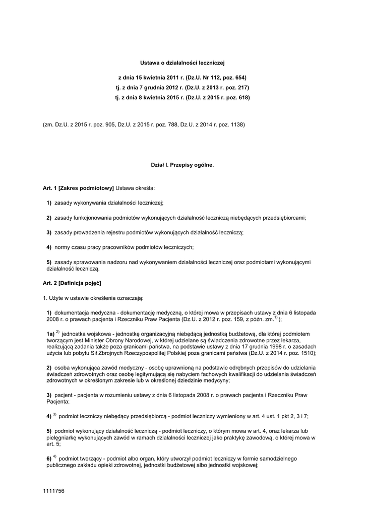 Ustawa o działalności leczniczej z dnia 15 kwietnia 2011 r. (Dz.U. Nr 112, poz. 654) tj. z dnia 7 grudnia 2012 r. (Dz.U. z 2013 r. poz. 217) tj. z dnia 8 kwietnia 2015 r. (Dz.U. z 2015 r. poz. 618) (zm. Dz.U. z 2015 r. poz. 905, Dz.U. z 2015 r. poz. 788, Dz.U. z 2014 r. poz. 1138) Dział I. Przepisy ogólne. Art. 1 [Zakres podmiotowy] Ustawa określa: 1) zasady wykonywania działalności leczniczej; 2) zasady funkcjonowania podmiotów wykonujących działalność leczniczą niebędących przedsiębiorcami; 3) zasady prowadzenia rejestru podmiotów wykonujących działalność leczniczą; 4) normy czasu pracy pracowników podmiotów leczniczych; 5) zasady sprawowania nadzoru nad wykonywaniem działalności leczniczej oraz podmiotami wykonującymi działalność leczniczą. Art. 2 [Definicja pojęć] 1. Użyte w ustawie określenia oznaczają: 1) dokumentacja medyczna - dokumentację medyczną, o której mowa w przepisach ustawy z dnia 6 listopada 1) 2008 r. o prawach pacjenta i Rzeczniku Praw Pacjenta (Dz.U. z 2012 r. poz. 159, z późn. zm. ); 2) 1a) jednostka wojskowa - jednostkę organizacyjną niebędącą jednostką budżetową, dla której podmiotem tworzącym jest Minister Obrony Narodowej, w której udzielane są świadczenia zdrowotne przez lekarza, realizującą zadania także poza granicami państwa, na podstawie ustawy z dnia 17 grudnia 1998 r. o zasadach użycia lub pobytu Sił Zbrojnych Rzeczypospolitej Polskiej poza granicami państwa (Dz.U. z 2014 r. poz. 1510); 2) osoba wykonująca zawód medyczny - osobę uprawnioną na podstawie odrębnych przepisów do udzielania świadczeń zdrowotnych oraz osobę legitymującą się nabyciem fachowych kwalifikacji do udzielania świadczeń zdrowotnych w określonym zakresie lub w określonej dziedzinie medycyny; 3) pacjent - pacjenta w rozumieniu ustawy z dnia 6 listopada 2008 r. o prawach pacjenta i Rzeczniku Praw Pacjenta; 4) 3) podmiot leczniczy niebędący przedsiębiorcą - podmiot leczniczy wymieniony w art. 4 ust. 1 pkt 2, 3 i 7; 5) podmiot wykonujący działalność leczniczą - podmiot leczniczy, o którym mowa w art. 4, oraz lekarza lub pielęgniarkę wykonujących zawód w ramach działalności leczniczej jako praktykę zawodową, o której mowa w art. 5; 4) 6) podmiot tworzący - podmiot albo organ, który utworzył podmiot leczniczy w formie samodzielnego publicznego zakładu opieki zdrowotnej, jednostki budżetowej albo jednostki wojskowej; 1111756 7) promocja zdrowia - działania umożliwiające poszczególnym osobom i społeczności zwiększenie kontroli nad czynnikami warunkującymi stan zdrowia i przez to jego poprawę, promowanie zdrowego stylu życia oraz środowiskowych i indywidualnych czynników sprzyjających zdrowiu; 8) przedsiębiorstwo - zespół składników majątkowych, za pomocą którego podmiot leczniczy wykonuje określony rodzaj działalności leczniczej; 9) szpital - przedsiębiorstwo podmiotu leczniczego, w którym podmiot ten wykonuje działalność leczniczą w rodzaju świadczenia szpitalne; 10) świadczenie zdrowotne - działania służące zachowaniu, ratowaniu, przywracaniu lub poprawie zdrowia oraz inne działania medyczne wynikające z procesu leczenia lub przepisów odrębnych regulujących zasady ich wykonywania; 11) świadczenie szpitalne - wykonywane całą dobę kompleksowe świadczenia zdrowotne polegające na diagnozowaniu, leczeniu, pielęgnacji i rehabilitacji, które nie mogą być realizowane w ramach innych stacjonarnych i całodobowych świadczeń zdrowotnych lub ambulatoryjnych świadczeń zdrowotnych; świadczeniami szpitalnymi są także świadczenia udzielane z zamiarem zakończenia ich udzielania w okresie nieprzekraczającym 24 godzin; 12) stacjonarne i całodobowe świadczenie zdrowotne inne niż świadczenie szpitalne - świadczenia opiekuńcze, pielęgnacyjne, paliatywne, hospicyjne, świadczenia z zakresu opieki długoterminowej, rehabilitacji leczniczej, leczenia uzależnień, psychiatrycznej opieki zdrowotnej oraz lecznictwa uzdrowiskowego, udzielane pacjentom, których stan zdrowia wymaga udzielania całodobowych lub całodziennych świadczeń zdrowotnych w odpowiednio urządzonych, stałych pomieszczeniach; 13) uczelnia medyczna - publiczną uczelnię medyczną albo publiczną uczelnię prowadzącą działalność dydaktyczną i badawczą w dziedzinie nauk medycznych oraz Centrum Medyczne Kształcenia Podyplomowego. 2. Ilekroć w ustawie jest mowa o: 1) kierowniku bez bliższego określenia - rozumie się przez to także zarząd spółki kapitałowej, a w przypadku innych podmiotów wykonujących działalność leczniczą - osobę uprawnioną do kierowania tymi podmiotami i ich reprezentowania na zewnątrz, jeżeli przepisy ustawy nie stanowią inaczej; 2) działalności leczniczej w rodzaju stacjonarne i całodobowe świadczenia zdrowotne bez bliższego określenia rozumie się przez to działalność leczniczą w rodzaju świadczenia szpitalne, jak i działalność leczniczą w rodzaju stacjonarne i całodobowe świadczenia zdrowotne inne niż szpitalne; 3) pielęgniarce - rozumie się przez to także położną; 4) lekarzu - rozumie się przez to także lekarza dentystę. 3. Przedsiębiorstwo podmiotu leczniczego jest jednostką lokalną w rozumieniu przepisów o statystyce publicznej, dla której nie sporządza się odrębnego bilansu, chyba że podmiot leczniczy postanowi inaczej w regulaminie organizacyjnym, o którym mowa w art. 24. Art. 3 [Działalność lecznicza] 1. Działalność lecznicza polega na udzielaniu świadczeń zdrowotnych. 2. Działalność lecznicza może również polegać na: 1) promocji zdrowia lub 2) realizacji zadań dydaktycznych i badawczych w powiązaniu z udzielaniem świadczeń zdrowotnych i promocją zdrowia, w tym wdrażaniem nowych technologii medycznych oraz metod leczenia. 3. Podmiot wykonujący działalność leczniczą może uczestniczyć, a podmiot wykonujący działalność leczniczą w zakresie, o którym mowa w ust. 