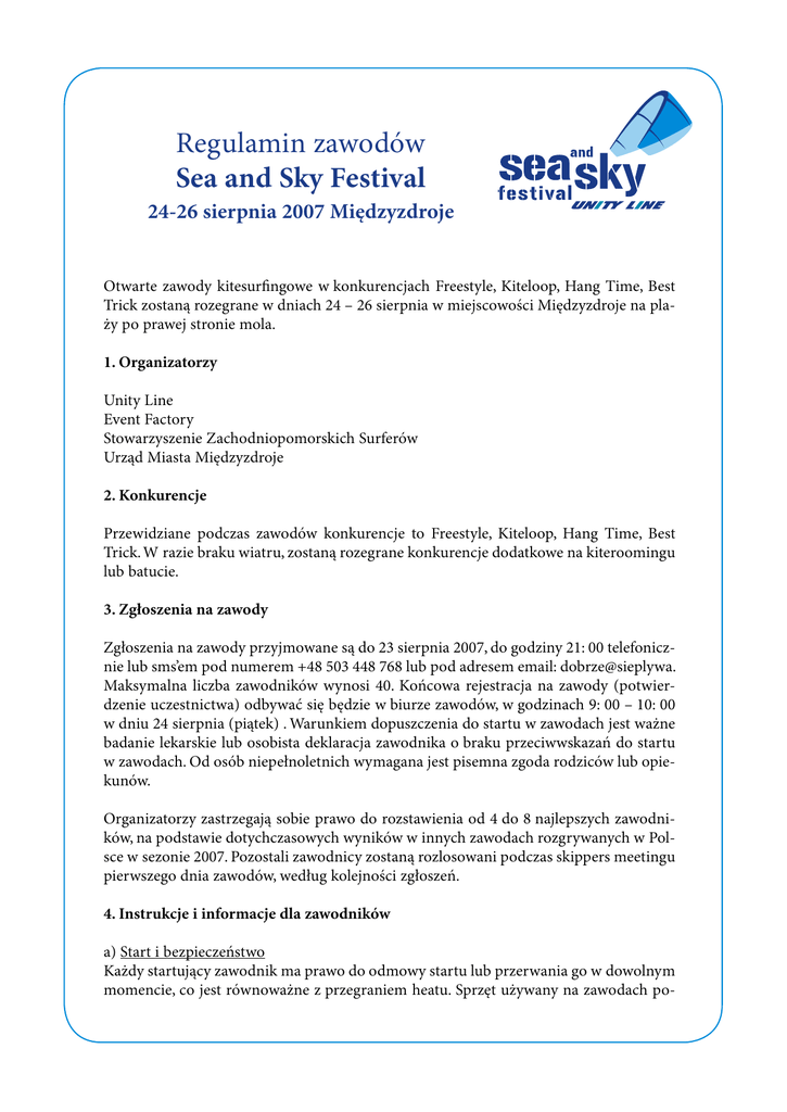 Regulamin zawodów Sea and Sky Festival 24-26 sierpnia 2007 Międzyzdroje Otwarte zawody kitesurfingowe w konkurencjach Freestyle, Kiteloop, Hang Time, Best Trick zostaną rozegrane w dniach 24 – 26 sierpnia w miejscowości Międzyzdroje na plaży po prawej stronie mola. 1. Organizatorzy Unity Line Event Factory Stowarzyszenie Zachodniopomorskich Surferów Urząd Miasta Międzyzdroje 2. Konkurencje Przewidziane podczas zawodów konkurencje to Freestyle, Kiteloop, Hang Time, Best Trick. W razie braku wiatru, zostaną rozegrane konkurencje dodatkowe na kiteroomingu lub batucie. 3. Zgłoszenia na zawody Zgłoszenia na zawody przyjmowane są do 23 sierpnia 2007, do godziny 21: 00 telefonicznie lub sms’em pod numerem +48 503 448 768 lub pod adresem email: dobrze@sieplywa. Maksymalna liczba zawodników wynosi 40. Końcowa rejestracja na zawody (potwierdzenie uczestnictwa) odbywać się będzie w biurze zawodów, w godzinach 9: 00 – 10: 00 w dniu 24 sierpnia (piątek) . Warunkiem dopuszczenia do startu w zawodach jest ważne badanie lekarskie lub osobista deklaracja zawodnika o braku przeciwwskazań do startu w zawodach. Od osób niepełnoletnich wymagana jest pisemna zgoda rodziców lub opiekunów. Organizatorzy zastrzegają sobie prawo do rozstawienia od 4 do 8 najlepszych zawodników, na podstawie dotychczasowych wyników w innych zawodach rozgrywanych w Polsce w sezonie 2007. Pozostali zawodnicy zostaną rozlosowani podczas skippers meetingu pierwszego dnia zawodów, według kolejności zgłoszeń. 4. Instrukcje i informacje dla zawodników a) Start i bezpieczeństwo Każdy startujący zawodnik ma prawo do odmowy startu lub przerwania go w dowolnym momencie, co jest równoważne z przegraniem heatu. Sprzęt używany na zawodach po- winien posiadać sprawny system bezpieczeństwa i nie zagrażać innym uczestnika oraz publiczności która przybędzie na zawody. Należy dobierać rozmiar latawca odpowiednio do warunków panujących na akwenie i umiejętności aby nie stwarzać zagrożenia. Organizatorzy nie odpowiadają za żadne uszkodzenia i zniszczenia sprzętu zawodnika, jak i także za szkody wyrządzone osobom postronnym przez zawodników, dlatego zaleca się posiadanie ubezpieczenia OC. Organizatorzy nie biorą także odpowiedzialności za utratę zdrowia lub życia przez zawodników podczas zawodów. Dyrektor Zawodów, Sędziowie lub Beach Marshall mogą uznać, że zawodnik potrzebuje pomocy, co zobowiązuje zawodnika do bezwarunkowego jej przyjęcia i stosowania się do instrukcji ww. osób lub ekipy ratunkowej. Zawodnicy nie przestrzegający podstawowych zasad bezpieczeństwa na brzegu a także na wodzie zostaną w pierwszej kolejności ostrzeżenie, a następnie dyskwalifikację. W razie rażących zachować Dyrektor Zawodów może zdyskwalifikować zawodnika bez ostrzeżenia, lub nawet wykluczyć z całych zawodów. b) ONB – Oficjalna Tabilca Ogłoszeń (Official Notice Board) Oficjalna Tablica Ogłoszeń (Official Notice Board) wywieszona zostanie na ścianie biura zawodów. Na ONB w dniu zawodów zostaną wywieszone kryteria sędziowania. Na ONB zamieszczane będą wszystkie informacje i komunikaty dotyczące zawodów i zawodników wydawane przez organizatorów. Obowiązkiem zawodnika jest regularne sprawdzanie komunikatów wywieszonych na ONB. c) Oficjalny Maszt Flagowy (Official Flag Pole OFP) Oficjalny Maszt Flagowy umieszczony będzie z pobliżu wieży sędziowskiej. Sygnałami startowymi. 1. Sygnał ostrzeżenia: pozostało 2 minuty do startu, czerwona flaga 2. Sygnał przygotowania: pozostała 1 minuta do startu, żółta flaga 3. Sygnał startowy: start heatu, wywieszona zielona flaga. Flaga zielona schodzi z masztu na minutę przed końcem heatu. ICF „N” Niebiesko/białe kwadraty - sygnalizuje przerwanie rozgrywanego „heat’u” ICF „AP” Biało/czerwone pasy - sygnalizuje opóźnienie kolejnego „heatu” bądź przerwę w zawodach. Flaga zielona sygnalizująca start sygnalizowana jest dodatkowo jednym długim sygnałem. d) Strefa startu latawców Jest to jedyne miejsce przeznaczone do startowania i lądowania latawców podczas zawodów, usytuowane będzie „pod wiatr” względem obszaru zawodów. e) Obszar zawodów Obszar zawodów będzie oznaczony bojami oraz tablicami na plaży. Jest to jedyne miejsce, w którym zawodnicy wykonujący triki są punktowani przez sędziów. Trik wykonany w strefie zawodów, ale lądowany po za strefą jest uważany za ważny. f) Kary dla zawodników Zawodnik może dostać ostrzeżenie lub zostać zdyskwalifikowany jeśli: Pływa bądź trzyma latawiec w obszarze zawodów podczas rozgrywania konkurencji poza startem w swoim „heat’cie”. Nie zakłada „vestu” zawodów podczas rozgrywania zawodów i sesji treningowej, nie używa właściwego koloru „vestu” startowego podczas swojego heatu. Nie stosuje się do poleceń Dyrektora Zawodów, Sędziego Głównego lub Beach Marshalla. Jeśli Sędziowie lub Dyrektor Zawodów zdecydują o ostrzeżeniu lub dyskwalifikacji w wyniku zaistniałych okoliczności. 5. Wpisowe Wpisowe na zawody wynosi 30 zł. 6. Zasady i protesty Najważniejszym wyznacznikiem zasad jest niniejszy Regulamin Zawodów. W trakcie trwania zawodów Dyrektor Zawodów może wyznaczyć dodatkowe zasady, o których poinformować musi niezwłocznie zawodników po przez ustny przekaz lub wywieszenie informacji na ONB. W trakcie trwania zawodów nie rozpatrywane będą żadne protesty i roszczenia, a w kwestiach spornych decydując słowo należy do Dyrektora Zawodów Dyrektor Zawodów: Magda Ziemann email: [email protected] tel. +48 503 448 768 Sędziowie: Sebastian Rogasiński, Grzegorz Wlazłowski i Rafal Maćkowiak