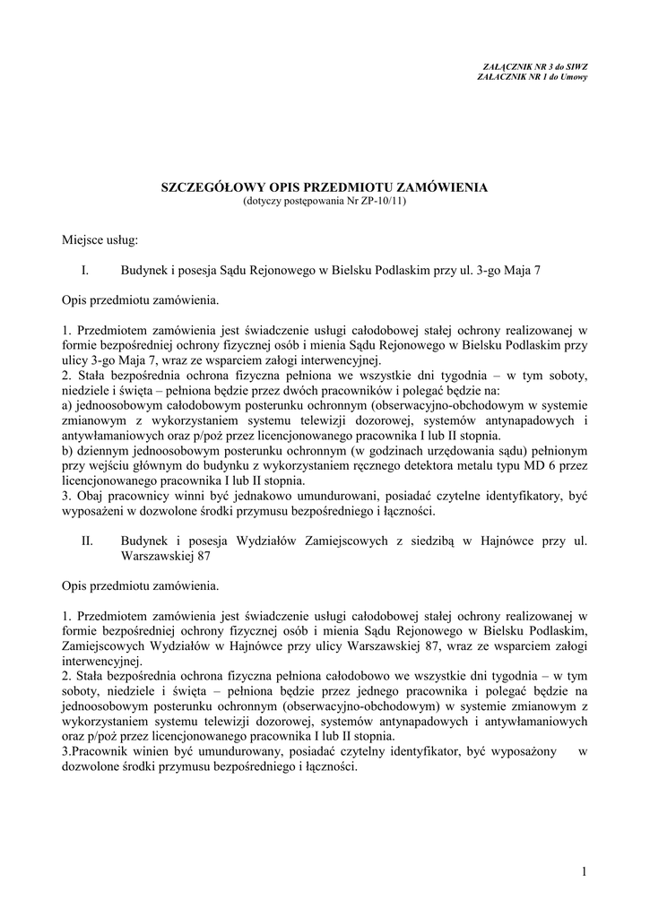 ZAŁĄCZNIK NR 3 do SIWZ ZAŁACZNIK NR 1 do Umowy SZCZEGÓŁOWY OPIS PRZEDMIOTU ZAMÓWIENIA (dotyczy postępowania Nr ZP-10/11) Miejsce usług: I. Budynek i posesja Sądu Rejonowego w Bielsku Podlaskim przy ul. 3-go Maja 7 Opis przedmiotu zamówienia. 1. Przedmiotem zamówienia jest świadczenie usługi całodobowej stałej ochrony realizowanej w formie bezpośredniej ochrony fizycznej osób i mienia Sądu Rejonowego w Bielsku Podlaskim przy ulicy 3-go Maja 7, wraz ze wsparciem załogi interwencyjnej. 2. Stała bezpośrednia ochrona fizyczna pełniona we wszystkie dni tygodnia – w tym soboty, niedziele i święta – pełniona będzie przez dwóch pracowników i polegać będzie na: a) jednoosobowym całodobowym posterunku ochronnym (obserwacyjno-obchodowym w systemie zmianowym z wykorzystaniem systemu telewizji dozorowej, systemów antynapadowych i antywłamaniowych oraz p/poŜ przez licencjonowanego pracownika I lub II stopnia. b) dziennym jednoosobowym posterunku ochronnym (w godzinach urzędowania sądu) pełnionym przy wejściu głównym do budynku z wykorzystaniem ręcznego detektora metalu typu MD 6 przez licencjonowanego pracownika I lub II stopnia. 3. Obaj pracownicy winni być jednakowo umundurowani, posiadać czytelne identyfikatory, być wyposaŜeni w dozwolone środki przymusu bezpośredniego i łączności. II. Budynek i posesja Wydziałów Zamiejscowych z siedzibą w Hajnówce przy ul. Warszawskiej 87 Opis przedmiotu zamówienia. 1. Przedmiotem zamówienia jest świadczenie usługi całodobowej stałej ochrony realizowanej w formie bezpośredniej ochrony fizycznej osób i mienia Sądu Rejonowego w Bielsku Podlaskim, Zamiejscowych Wydziałów w Hajnówce przy ulicy Warszawskiej 87, wraz ze wsparciem załogi interwencyjnej. 2. Stała bezpośrednia ochrona fizyczna pełniona całodobowo we wszystkie dni tygodnia – w tym soboty, niedziele i święta – pełniona będzie przez jednego pracownika i polegać będzie na jednoosobowym posterunku ochronnym (obserwacyjno-obchodowym) w systemie zmianowym z wykorzystaniem systemu telewizji dozorowej, systemów antynapadowych i antywłamaniowych oraz p/poŜ przez licencjonowanego pracownika I lub II stopnia. 3.Pracownik winien być umundurowany, posiadać czytelny identyfikator, być wyposaŜony w dozwolone środki przymusu bezpośredniego i łączności. 1 III. Budynek i posesja Wydziałów Zamiejscowych z siedzibą w Siemiatyczach przy ul. Górnej 61 Opis przedmiotu zamówienia. 1. Przedmiotem zamówienia jest świadczenie usługi całodobowej stałej ochrony realizowanej w formie bezpośredniej ochrony fizycznej osób i mienia Sądu Rejonowego w Bielsku Podlaskim, Zamiejscowych Wydziałów w Siemiatyczach przy ul. Górnej 61, wraz ze wsparciem załogi interwencyjnej. 2. Stała bezpośrednia ochrona fizyczna pełniona całodobowo we wszystkie dni tygodnia – w tym soboty, niedziele i święta – pełniona będzie przez jednego pracownika i polegać będzie na jednoosobowym posterunku ochronnym (obserwacyjno-obchodowym) w systemie zmianowym z wykorzystaniem systemu telewizji dozorowej, systemów antynapadowych i antywłamaniowych oraz p/poŜ przez licencjonowanego pracownika I lub II stopnia. 3. Pracownik winien być umundurowany, posiadać czytelny identyfikator, być wyposaŜony w dozwolone środki przymusu bezpośredniego i łączności. IV. Wszystkie lokalizacje naleŜy podłączyć z całodobową stacją monitorowania Wykonawcy (WSZELKIE KOSZTY PODŁĄCZENIA PONOSI WYKONAWCA). Nadajnik powinien zostać zamontowany w oddzielnej obudowie z własnym akumulatorem a podłączone sygnały powinny być odseparowane w celu eliminacji przenoszenia zakłóceń elektromagnetycznych na centralę alarmową. I. Wymagania dotyczące agencji ochrony 1. Aktualna koncesja Ministra Spraw Wewnętrznych i Administracji na prowadzenie działalności gospodarczej w zakresie usług ochrony osób i mienia, wydaną zgodnie z warunkami określonymi w ustawie z dnia 22 sierpnia 1997 roku o ochronie osób i mienia (Dz. U. z 2005 r. Nr 145, poz.1221).Odpowiedzialność materialna za powierzone do ochrony mienie, jeŜeli straty w mieniu powstały w wyniku niewykonania lub nienaleŜytego wykonania obowiązków przez pracowników agencji ochrony. 2. MoŜliwość szybkiego wsparcia pracownika ochrony przez załogę interwencyjną, w skład której wchodzi dwóch licencjonowanych pracowników ochrony jednolicie umundurowanych. 3. Zamawiający w trakcie trwania umowy zastrzega sobie moŜliwość przeprowadzenia jeden raz w kaŜdym miesiącu (tj. 12 razy) kontroli czasu dojazdu załogi interwencyjnej. Koszty związane z przyjazdami załogi interwencyjnej powinny być uwzględnione w kosztach ochrony. 4. Przeszkolenie pracowników w zakresie wykonywanej pracy oraz przepisów bhp i p.poŜ. 5. Ochrona obiektu musi być wykonywana z naleŜytą starannością i przepisami prawa obowiązującymi w tym zakresie. II. Ochrona fizyczna osób i mienia 1. Czas pracy pracowników ochrony: 1. Stała bezpośrednia ochrona fizyczna pełniona będzie całodobowo przez wszystkie dni tygodnia – w tym soboty, niedziele i święta. 2. W obiekcie Sądu Rejonowego w Bielsku Podlaskim przy ul. 3-go Maja 7, dodatkowo drugi pracownik w godzinach urzędowania, tj.: 7:30 – 15:30. 2 2. Zakres obowiązków ochrony: Pod pojęciem ochrony strony rozumieją stałą obecność pracownika/ów ochrony w określonym miejscu i czasie oraz podejmowanie interwencji zgodnie z zasadami określonymi w zaakceptowanym przez Zamawiającego Planie Ochrony Obiektu, który stanowić będzie załącznik do umowy: a) ochrona fizyczna musi być wykonywana zgodnie z obowiązującymi przepisami ustawy z dnia 22 sierpnia 1997 r. o ochronie osób i mienia (tekst jednolity: Dz. U. z 2005 r., Nr 145, poz. 1221 z późn. zm.), b) otwieranie i zamykanie bramy wjazdowej oraz drzwi wejściowych do budynków, c) wydawanie pracownikom Sądu kluczy do poszczególnych pomieszczeń przed rozpoczęciem urzędowania i przyj