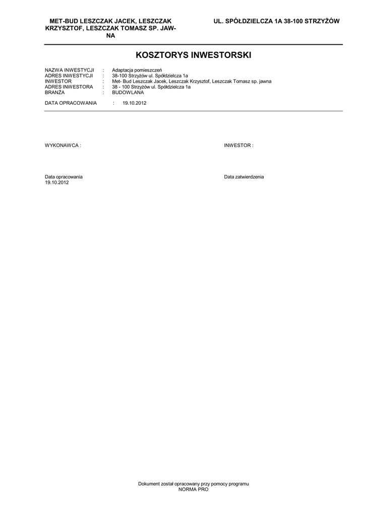 MET-BUD LESZCZAK JACEK, LESZCZAK KRZYSZTOF, LESZCZAK TOMASZ SP. JAWNA UL. SPÓŁDZIELCZA 1A 38-100 STRZYŻÓW KOSZTORYS INWESTORSKI NAZWA INWESTYCJI ADRES INWESTYCJI INWESTOR ADRES INWESTORA BRANŻA DATA OPRACOWANIA : : : : : Adaptacja pomieszczeń 38-100 Strzyżów ul. Spółdzielcza 1a Met- Bud Leszczak Jacek, Leszczak Krzysztof, Leszczak Tomasz sp. jawna 38 - 100 Strzyżów ul. Spółdzielcza 1a BUDOWLANA : 19.10.2012 WYKONAWCA : INWESTOR : Data opracowania 19.10.2012 Data zatwierdzenia Dokument został opracowany przy pomocy programu NORMA PRO adaptacja_pomieszczeń_met-bud.PRD Lp. Podstawa 1 1.1 1.1.1 KNR AT-43 0102-01 1.2 1.2.1 KNR AT-43 0213-01 OBMIAR Opis i wyliczenia ADAPTACJA POMIESZCZEŃ - ROBOTY BUDOWLANE Adaptacja pomieszczeń - wyrównanie ścian płytami gipsowymi Okładziny ścienne z płyt gipsowo-kartonowych montowane na konstrukcji z profili CD 60 mocowanych do podłoża za pomocą uchwytów 449 1.4 1.4.1 KNR 4-04 0301-01 1.4.2 KNR 2-02 1102-01 1102-03 1.5 1.5.1 m2 m2 640 m2 Razem 449.000 RAZEM 449.000 640.000 RAZEM 640.000 449.000 RAZEM 449.000 449.000 RAZEM 449.000 32.000 RAZEM 32.000 640.000 RAZEM 640.000 645.000 RAZEM 645.000 1.000 RAZEM 1.000 6.000 RAZEM 6.000 m2 m2 Malowanie farbą emulsyjną dwukrotnie płyt gipsowych spoinowanych szpachlowa- m2 nych - trzykrotnie Krotność = 1.5 449 m2 Adaptacja pomieszczeń - wyłożenie podłogi posadzką przemysłową Rozebranie podłoża z betonu żwirowego o grubości do 5 cm m3 32 m3 Warstwy wyrównawcze pod posadzki z zaprawy cementowej grubości 50 mm za- m2 tarte na ostro m2 640 1.4.3 KNR AT-23 0201-03 Poszcz m2 Adaptacja pomieszczeń - wykonanie sufitów podwieszanych Sufit podwieszany kasetonowy z wypełnieniem płytami sufitowymi 1.3 Adaptacja pomieszczeń - malowanie ścian 1.3.1 NNRNKB (z.VII) Gruntowanie podłoży preparatami "CERESIT CT 17" i "ATLAS UNI 202 1134-02 GRUNT" - powierzchnie pionowe 449 1.3.2 KNNR 2 1402-05 j.m. Okładziny podłogowe z płytek z kamieni sztucznych o regularnych kształtach na m2 zaprawie klejowej grubowarstwowej; płytki o wymiarach 30x30 cm - płytki przemysłowe gr. 12 mm 645 m2 Adaptacja pomieszczeń - montaż oświetlenia Montaż nowoczesnego oświetlenia wraz z wykonaniem instalacji elektrycznej kpl 1 kpl analiza indywidualna 1.6 1.6.1 Adaptacja pomieszczeń - utworzenie nowych stanowisk relkamowych Stanowiska reklamowe kpl 6 kpl analiza indywidualna -2- Norma PRO Wersja 4.37a Nr seryjny: 28529