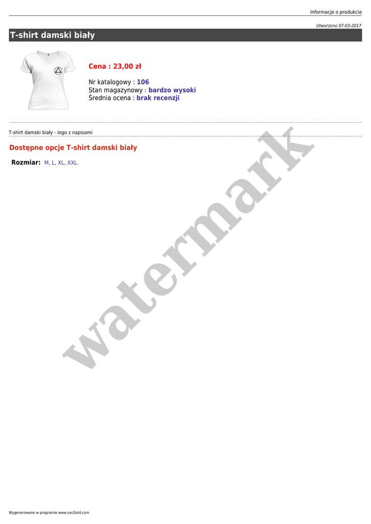 Informacje o produkcie Utworzono 07-03-2017 T-shirt damski biały Cena : 23,00 zł Nr katalogowy : 106 Stan magazynowy : bardzo wysoki Średnia ocena : brak recenzji T-shirt damski biały - logo z napisami w at Rozmiar: M, L, XL, XXL. er m ar k Dostępne opcje T-shirt damski biały Wygenerowano w programie www.oscGold.com