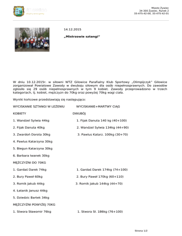 Miasto Żywiec 34-300 Żywiec, Rynek 2 33-475-42-00, 33-475-42-01 14.12.2015 „Mistrzowie sztangi” W dniu 10.12.2015r. w siłowni WTZ Gilowice Parafialny Klub Sportowy „Olimpijczyk” Gilowice zorganizował Powiatowe Zawody w dwuboju siłowym dla osób niepełnosprawnych. Do zawodów zgłosiło się 29 osób niepełnosprawnych w tym 9 kobiet. Zawody przeprowadzono w trzech kategoriach, tj. kobiet, mężczyzn do 70kg oraz powyżej 70kg wagi ciała. Wyniki końcowe przedstawiają się następująco: WYCISKANIE SZTANGI W LEŻENIU KOBIETY WYCISKANIE+MARTWY CIĄG DWUBÓJ 1. Wandzel Sylwia 44kg 1. Fijak Danuta 140 kg (40+100) 2. Fijak Danuta 40kg 2. Wandzel Sylwia 134kg (44+90) 3. Zwardoń Dorota 30kg 3. Pawlus Katarz. 100kg (30+70) 4. Pawlus Katarzyna 30kg 5. Biegun Katarzyna 30kg 6. Barbara Iwanek 30kg MĘŻCZYŹNI DO 70KG 1. Gardaś Darek 74kg 1. Gardaś Darek 174kg (74+100) 2. Bury Paweł 60kg 2. Bury Paweł 170kg (60+110) 3. Romik Jakub 44kg 3. Romik Jakub 144kg (44+70) 4. Łatanik Janusz 44kg 5. Dziedzic Bartek 34kg MĘŻCZYŹNI POWYŻEJ 70KG 1. Stwora Sławomir 76kg 1. Stwora Sł. 186kg (76+100) Strona 1/2 Miasto Żywiec 34-300 Żywiec, Rynek 2 33-475-42-00, 33-475-42-01 2. Hutyra Szczepan 60kg 2. Hutyra Sz. 170kg (60+110) 3. Kąkol Marcin 54kg 3. Kąkol Marcin 154kg (54+100) 4. Jakubiec Bogdan 54kg 5. Plewka Wojciech 54kg 6. Konior Paweł 50kg Zwycięscy w poszczególnych kategoriach otrzymali puchary, zdobywcy trzech pierwszych miejsc zostali nagrodzeni medalami a wszyscy otrzymali dyplomy. Były też nagrody rzeczowe. Była to impreza podsumowująca cykl zawodów organizowanych przez PKS „Olimpijczyk” Gilowice dla osób niepełnosprawnych w 2015 roku. Podziękowania kierujemy do WTZ Gilowice/Milówka i jego pracowników za współpracę przy organizowaniu tych imprez. Strona 2/2 Powered by TCPDF (www.tcpdf.org)