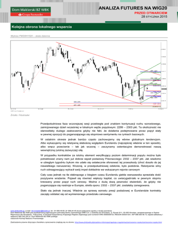 ANALIZA FUTURES NA WIG20 PRZED OTWARCIEM 28 STYCZNIA 2015 Kolejna obrona lokalnego wsparcia Wykres FW20H1520 – skala dzienna Źródło: Fibotrader Przedpołudniowa faza wczorajszej sesji przebiegła pod znakiem kontynuacji ruchu wzrostowego, zainicjowanego dzień wcześniej w lokalnym węźle popytowym: 2299 – 2303 pkt. Ta okoliczność nie stanowiłaby dużego zaskoczenia gdyby nie fakt, że działania podejmowane przez popyt stały w pewnej opozycji do pogarszającego się stopniowo sentymentu na rynkach bazowych. W ostatnim okresie jednak bardzo często zachowujemy się wbrew globalnym tendencjom. Albo wykazujemy się relatywną słabością względem Eurolandu (najczęściej właśnie w ten sposób), albo wręcz przeciwnie – tak jak wczoraj – zaczynamy ostentacyjne demonstrować naszą wewnętrzną (ulotną zazwyczaj) siłę. W przypadku kontraktów za istotny element weryfikujący poziom determinacji popytu można było potraktować znany nam już dobrze węzeł podażowy Fibonacciego: 2332 – 2337 pkt. Jak wiadomo w ubiegłym tygodniu bykom nie udało się ostatecznie sforsować tej przeszkody (choć doszło do jej niewielkiego naruszenia). Wczoraj, w przedpołudniowej odsłonie, było podobnie. Relatywnie silny ruch odreagowujący wytracił swój impet dokładnie we wskazanym rejonie cenowym Cały czas jednak na tle słabnącego z biegiem czasu Eurolandu giełda warszawska sprawiała dość pozytywne wrażenie. Pojawił się również większy kapitał, co uwiarygadniało w pewnym stopniu kreowany przez popyt ruch cenowy. Można z dużą dozą pewności stwierdzić, że gdyby nie pogarszające się nastroje w Europie, strefa oporu: 2332 – 2337 pkt. zostałaby zanegowana. Stało się jednak inaczej. Właśnie za sprawą wzrostu presji podażowej w Eurolandzie kontrakty zaczęły oddalać się od wymienionego przedziału cenowego. www.dmbzwbk.pl, e-mail: [email protected], tel.: 61 856 48 80, 61 856 44 45 (koszt połączenia zgodny z taryfą operatora) Dom Maklerski BZ WBK jest wyodrębnioną organizacyjnie jednostką Banku Zachodniego WBK S.A. z siedzibą we Wrocławiu, ul. Rynek 9/11, 50-950 Wrocław, zarejestrowanego w Sądzie Rejonowym dla Wrocławia - Fabrycznej, VI Wydział Gospodarczy Krajowego Rejestru Sądowego pod numerem KRS 0000008723, REGON 930041341, NIP 896 000 56 73, kapitał zakładowy i wpłacony 992.345.340 zł. Dom Maklerski BZ WBK podlega nadzorowi Komisji Nadzoru Finansowego. Zastrzeżenia prawne dotyczące charakteru opracowania znajdują się na stronie: http://www.dmbzwbk.pl/przydatne-informacje/regulacje-i-regulaminy/zastrzezenia-i-ryzyko/zastrzezenia-i-ryzyko.html Bardzo interesujący przebieg miała także końcowa odsłona wtorkowej sesji. Na wykresie zaczął bowiem krystalizować się niewielki (intradayowy) układ ABCD, spełniający zależność: AB = CD. Projekcje tej symetrycznej formacji (niewidocznej na wykresie w skali dziennej) koncentrowały się w stosunkowo wąskim korytarzu cenowym: 2295 – 2299 pkt. Biorąc pod uwagę prowzrostowy charakter struktury ABCD można było spodziewać się tutaj jakiejś reakcji ze strony popytu. Tym bardziej, że nasza odporność na zawirowania zewnętrzne utrzymywała się cały czas na wysokim poziomie. Ostatecznie popyt uaktywnił się we wskazanym rejonie cenowym, choć z racji relatywnie silnych spadków w Europie i za oceanem, skłonność do inicjowania przez kupujących aktywnych działań odwetowych była ograniczona. Niemniej jednak bykom udało się (po raz kolejny zresztą) wybronić lokalne wsparcie techniczne: 2295 – 2299 pkt. Tak jak nadmieniałem w komentarzach online, negacja układu ABCD mogłaby stać się czynnikiem przybliżającym realizację wariantu kontynuacji ruchu spadkowego, nawet z opcją powrotu kontraktów do bazowego wsparcia: 2227 – 2231 pkt. Analizując lokalne zapory popytowe Fibonacciego nie powinniśmy jednak również zapominać o węźle: 2269 – 2273 pkt. To właśnie w tym obszarze cenowym wypada zniesienie 61.8% ruchu wzrostowego, trwającego od 16 do 23 stycznia, a ponadto grupują się inne, wiarygodne projekcje cenowe. Oznaką całkowitej kapitulacji byków byłoby zatem dopiero sforsowanie w/w przedziału Fibonacciego. O tym fakcie warto pamiętać. Na razie jednak mamy na szali silne argumenty przemawiające za kontynuacją ruchu wzrostowego i tylko jeden czynnik świadczący o możliwości pogłębienia się przeceny. Jeden, ale za to bardzo dużego kalibru i jest nim oczywiście średnioterminowy trend spadkowy. Na tym polu póki co nic się nie zmieniło. Nadal uważam (eksponowałem tę kwestię we wczorajszych opracowaniach), że dopiero trwałe sforsowanie oporu: 2362 – 2369 pkt. wpłynęłoby pozytywnie na wizerunek techniczny wykresu w nieco szerszej perspektywie czasowej. Tymczasem popyt ma ewidentne problemy z pokonaniem swojego przeciwnika w węźle: 2332 – 2337 pkt., choć obiektywnie trzeba przyznać, że obrona wsparcia: 2295 – 2299 pkt. (przy tak fatalnie zachowujących się rynkach bazowych) była wczoraj nie lada wydarzeniem. Dlatego uważam, że istotny w tym kontekście powinien okazać się przebieg dzisiejszej odsłony. Ponieważ na wykresie w skali intradayowej (rozwinę ten wątek w pierwszym opracowaniu online) pojawił się jednak układ ABCD, obóz byków powinien wykorzystać tę szansę i ponowić atak na opór: 2332 – 2337 pkt. Jeśli ten scenariusz nie zrealizuje się w najbliższym czasie, wzrośnie dla odmiany prawdopodobieństwo przejęcia inicjatywy przez podaż. Paweł Danielewicz Analityk techniczny, makler [email protected] www.dmbzwbk.pl, e-mail: [email protected], tel.: 61 856 48 80, 61 856 44 45 (koszt połączenia zgodny z taryfą operatora) Dom Maklerski BZ WBK jest wyodrębnioną organizacyjnie jednostką Banku Zachodniego WBK S.A. z siedzibą we Wrocławiu, ul. Rynek 9/11, 50-950 Wrocław, zarejestrowanego w Sądzie Rejonowym dla Wrocławia - Fabrycznej, VI Wydział Gospodarczy Krajowego Rejestr