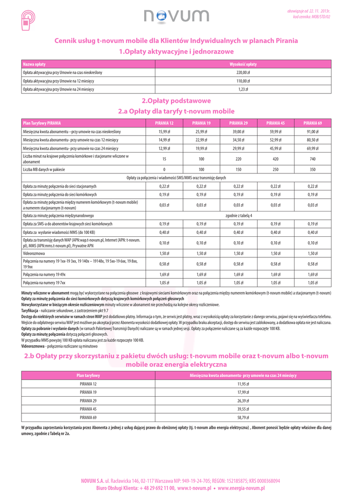 obowiązuje od 22. 11. 2013r. kod cennika: MOB/STD/02 Cennik usług t-novum mobile dla Klientów Indywidualnych w planach Pirania 1.Opłaty aktywacyjne i jednorazowe Nazwa opłaty Wysokość opłaty Opłata aktywacyjna przy Umowie na czas nieokreślony 220,00 zł Opłata aktywacyjna przy Umowie na 12 miesięcy 110,00 zł Opłata aktywacyjna przy Umowie na 24 miesięcy 1,23 zł 2.Opłaty podstawowe 2.a Opłaty dla taryfy t-novum mobile Plan Taryfowy PIRANIA PIRANIA 12 PIRANIA 19 PIRANIA 29 PIRANIA 45 PIRANIA 69 Miesięczna kwota abonamentu –przy umowie na czas nieokreślony 15,99 zł 25,99 zł 39,00 zł 59,99 zł 91,00 zł Miesięczna kwota abonamentu- przy umowie na czas 12 miesięcy 14,99 zł 22,99 zł 34,50 zł 52,99 zł 80,50 zł Miesięczna kwota abonamentu- przy umowie na czas 24 miesięcy 12,99 zł 19,99 zł 29,99 zł 45,99 zł 69,99 zł Liczba minut na krajowe połączenia komórkowe i stacjonarne wliczone w abonament 15 100 220 420 740 Liczba MB danych w pakiecie 0 100 150 250 350 Opłaty za połączenia i wiadomości SMS/MMS oraz transmisję danych Opłata za minutę połączenia do sieci stacjonarnych 0,22 zł 0,22 zł 0,22 zł 0,22 zł 0,22 zł Opłata za minutę połączenia do sieci komórkowych 0,19 zł 0,19 zł 0,19 zł 0,19 zł 0,19 zł Opłata za minutę połączenia między numerem komórkowym (t-novum mobile) a numerem stacjonarnym (t-novum) 0,03 zł 0,03 zł 0,03 zł 0,03 zł 0,03 zł Opłata za minutę połączenia międzynarodowego zgodnie z tabelą 4 Opłata za SMS-a do abonentów krajowych sieci komórkowych 0,19 zł 0,19 zł 0,19 zł 0,19 zł 0,19 zł Opłata za wysłanie wiadomości MMS (do 100 KB) 0,40 zł 0,40 zł 0,40 zł 0,40 zł 0,40 zł Opłata za transmisję danych WAP (APN:wap.t-novum.pl, Internet (APN: t-novum. pl), MMS (APN:mms.t-novum.pl), Prywatne APN 0,10 zł 0,10 zł 0,10 zł 0,10 zł 0,10 zł Videorozmowa 1,50 zł 1,50 zł 1,50 zł 1,50 zł 1,50 zł Połączenia na numery 19 1xx-19 3xx, 19 140x – 19148x, 19 5xx-19 6xx, 19 8xx, 19 9xx 0,58 zł 0,58 zł 0,58 zł 0,58 zł 0,58 zł Połączenia na numery 19 49x 1,69 zł 1,69 zł 1,69 zł 1,69 zł 1,69 zł Połączenia na numery 19 7xx 1,05 zł 1,05 zł 1,05 zł 1,05 zł 1,05 zł Minuty wliczone w abonament mogą być wykorzystane na połączenia głosowe z krajowymi sieciami komórkowym oraz na połączenia między numerem komórkowym (t-novum mobile) a stacjonarnym (t-novum) Opłaty za minutę połączenia do sieci komórkowych dotyczą krajowych komórkowych połączeń głosowych Niewykorzystane w bieżącym okresie rozliczeniowym minuty wliczone w abonament nie przechodzą na kolejne okresy rozliczeniowe. Taryfikacja - naliczanie sekundowe, z zastrzeżeniem pkt 9.7 Dostęp do niektórych serwisów w ramach stron WAP jest dodatkowo płatny. Informacja o tym, że serwis jest płatny, wraz z wysokością opłaty za korzystanie z danego serwisu, pojawi się na wyświetlaczu telefonu. Wejście do odpłatnego serwisu WAP jest możliwe po akceptacji przez Abonenta wysokości dodatkowej opłaty. W przypadku braku akceptacji, dostęp do serwisu jest zablokowany, a dodatkowa opłata nie jest naliczana. Opłaty za pobranie i wysłanie danych (w ramach Pakietowej Transmisji Danych) naliczane są w ramach jednej sesji. Opłaty za połączenie naliczane są za każde rozpoczęte 100 KB. Opłaty za minutę połączenia dotyczą połączeń głosowych. W przypadku MMS powyżej 100 KB opłata naliczana jest za każde rozpoczęte 100 KB. Videorozmowa - połączenia rozliczane są minutowo 2.b Opłaty przy skorzystaniu z pakietu dwóch usług: t-novum mobile oraz t-novum albo t-novum mobile oraz energia elektryczna Plan taryfowy Miesięczna kwota abonamentu- przy umowie na czas 24 miesięcy PIRANIA 12 11,95 zł PIRANIA 19 17,99 zł PIRANIA 29 26,39 zł PIRANIA 45 39,55 zł PIRANIA 69 58,79 zł W przypadku zaprzestania korzystania przez Abonenta z jednej z usług dającej prawo do obniżonej opłaty (tj. t-novum albo energia elektryczna) , Abonent ponosić będzie opłaty właściwe dla danej umowy, zgodnie z Tabelą nr 2a. NOVUM S.A. ul. Racławicka 146, 02-117 Warszawa NIP: 949-19-24-705; REGON: 152185875; KRS 0000368094 Biuro Obsługi Klienta: + 48 29 692 11 00, www.t-novum.pl www.energia-novum.pl obowiązuje od 22. 11. 2013r. kod cennika: MOB/STD/02 2.c Opłaty przy skorzystaniu z pakietu usług: t-novum mobile, t-novum oraz energia elektryczna Plan taryfowy Miesięczna kwota abonamentu- przy umowie na czas 24 miesięcy PIRANIA 12 11,04 zł PIRANIA 19 16,59 zł PIRANIA 29 24,29 zł PIRANIA 45 36,33 zł PIRANIA 69 53,89 zł W przypadku zaprzestania korzystania przez Abonenta z przynamniej jednej z usług dającej prawo do obniżonej opłaty (tj. t-novum lub energia elektryczna) , Abonent ponosić będzie opłaty właściwe dla danej umowy, zgodnie z Tabelą nr 2a lub Tabelą 2b. 3. Pakiety i usługi dodatkowe • Pakiet SMS Nazwa pakietu Liczba SMS Opłata SMS 20 20 3,00 zł SMS 50 50 7,00 zł SMS 100 100 12,00 zł SMS 300 300 27,00 zł Nazwa pakietu Liczba MMS Opłata MMS 10 10 2,50 zł MMS 25 25 5,00 zł MMS 40 40 7,00 zł Nazwa pakietu Liczba MB danych Opłata PTD 100 100 6,00 zł • Pakiet MMS • Pakiet transmisji danych PTD 500 500 21,00 zł PTD 1000 1000 34,00 zł PTD 2000 2000 55,00 zł Pakiet SMS do wykorzystania do wszystkich krajowych sieci za wyjątkiem SMS -ów Premium (o podwyższonej opłacie), w roamingu i międzynarodowych Pakiet MMS do wykorzystania do wszystkich krajowych sieci za wyjątkiem MMS-ów Premium, w roamingu i międzynarodowych Aktywacja nowego pakietu SMS powoduje zawsze zmianę czasu aktywności pakietu na 30 dni. W przypadku niewykorzystania poprzedniego pakietu liczba smsów sumuje się, natomiast czas ważności pakietu nie sumuje się. Aktywacja nowego pakietu MMS powoduje zawsze zmianę czasu aktywności pakietu na 30 dni. W przypadku niewykorzystania poprzedniego pakietu liczba mmsów sumuje się, natomiast czas ważności pakietu nie sumuje się. Aktywacja nowego pakietu