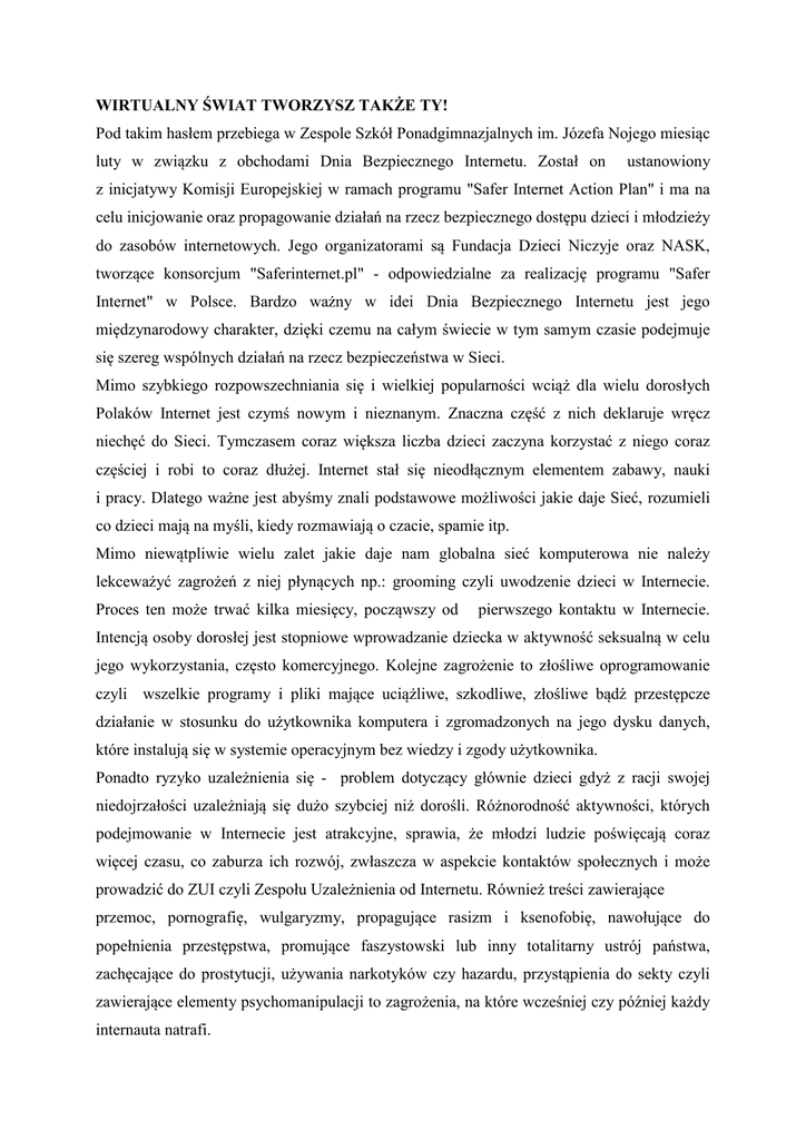 WIRTUALNY ŚWIAT TWORZYSZ TAKŻE TY! Pod takim hasłem przebiega w Zespole Szkół Ponadgimnazjalnych im. Józefa Nojego miesiąc luty w związku z obchodami Dnia Bezpiecznego Internetu. Został on ustanowiony z inicjatywy Komisji Europejskiej w ramach programu "Safer Internet Action Plan" i ma na celu inicjowanie oraz propagowanie działań na rzecz bezpiecznego dostępu dzieci i młodzieży do zasobów internetowych. Jego organizatorami są Fundacja Dzieci Niczyje oraz NASK, tworzące konsorcjum "Saferinternet.pl" - odpowiedzialne za realizację programu "Safer Internet" w Polsce. Bardzo ważny w idei Dnia Bezpiecznego Internetu jest jego międzynarodowy charakter, dzięki czemu na całym świecie w tym samym czasie podejmuje się szereg wspólnych działań na rzecz bezpieczeństwa w Sieci. Mimo szybkiego rozpowszechniania się i wielkiej popularności wciąż dla wielu dorosłych Polaków Internet jest czymś nowym i nieznanym. Znaczna część z nich deklaruje wręcz niechęć do Sieci. Tymczasem coraz większa liczba dzieci zaczyna korzystać z niego coraz częściej i robi to coraz dłużej. Internet stał się nieodłącznym elementem zabawy, nauki i pracy. Dlatego ważne jest abyśmy znali podstawowe możliwości jakie daje Sieć, rozumieli co dzieci mają na myśli, kiedy rozmawiają o czacie, spamie itp. Mimo niewątpliwie wielu zalet jakie daje nam globalna sieć komputerowa nie należy lekceważyć zagrożeń z niej płynących np.: grooming czyli uwodzenie dzieci w Internecie. Proces ten może trwać kilka miesięcy, począwszy od pierwszego kontaktu w Internecie. Intencją osoby dorosłej jest stopniowe wprowadzanie dziecka w aktywność seksualną w celu jego wykorzystania, często komercyjnego. Kolejne zagrożenie to złośliwe oprogramowanie czyli wszelkie programy i pliki mające uciążliwe, szkodliwe, złośliwe bądź przestępcze działanie w stosunku do użytkownika komputera i zgromadzonych na jego dysku danych, które instalują się w systemie operacyjnym bez wiedzy i zgody użytkownika. Ponadto ryzyko uzależnienia się - problem dotyczący głównie dzieci gdyż z racji swojej niedojrzałości uzależniają się dużo szybciej niż dorośli. Różnorodność aktywności, których podejmowanie w Internecie jest atrakcyjne, sprawia, że młodzi ludzie poświęcają coraz więcej czasu, co zaburza ich rozwój, zwłaszcza w aspekcie kontaktów społecznych i może prowadzić do ZUI czyli Zespołu Uzależnienia od Internetu. Również treści zawierające przemoc, pornografię, wulgaryzmy, propagujące rasizm i ksenofobię, nawołujące do popełnienia przestępstwa, promujące faszystowski lub inny totalitarny ustrój państwa, zachęcające do prostytucji, używania narkotyków czy hazardu, przystąpienia do sekty czyli zawierające elementy psychomanipulacji to zagrożenia, na które wcześniej czy później każdy internauta natrafi. A zatem odpowiedzi na pytania: czy Internet jest pozytywnym czy negatywnym elementem współczesnego świata, czy telefony komórkowe niosą za sobą jedynie możliwość komunikacji, czy możemy wierzyć we wszystko, co widzimy w Internecie, czy w przestrzeni online zachowujemy się tak samo jak w świecie realnym, jak nasze zachowanie wpływa na wirtualną rzeczywistość? – zależą tylko i wyłącznie od nas. ZSP im. J. Nojego kolejny raz włączył się do tej ważnej akcji poprzez podjęcie wspólnych działań z Komendą Powiatową Policji w Czarnkowie, rodzicami, pedagogami i swoimi wychowankami. Wierzymy, że każdy nawet najmniejszy wysiłek poczyniony w tym kierunku przyniesie nieocenione korzyści. (źródło: www.dzieckowsieci.pl) Organizatorzy