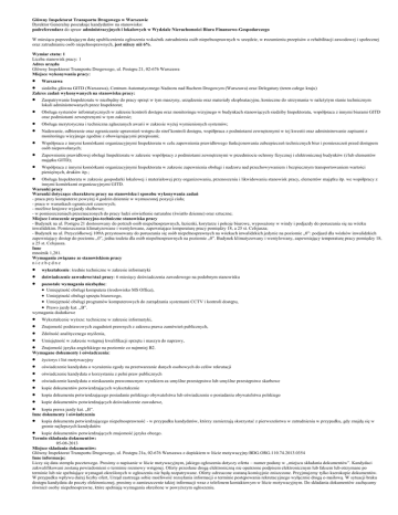 Główny Inspektorat Transportu Drogowego w Warszawie Dyrektor Generalny poszukuje kandydatów na stanowisko: podreferendarz do spraw administracyjnych i lokalowych w Wydziale Nieruchomości Biura Finansowo-Gospodarczego W miesiącu poprzedzającym datę upublicznienia ogłoszenia wskaźnik zatrudnienia osób niepełnosprawnych w urzędzie, w rozumieniu przepisów o rehabilitacji zawodowej i społecznej oraz zatrudnianiu osób niepełnosprawnych, jest niższy niż 6%. Wymiar etatu: 1 Liczba stanowisk pracy: 1 Adres urzędu Główny Inspektorat Transportu Drogowego, ul. Postępu 21, 02-676 Warszawa Miejsce wykonywania pracy: Warszawa siedziba główna GITD (Warszawa), Centrum Automatycznego Nadzoru nad Ruchem Drogowym (Warszawa) oraz Delegatury (teren całego kraju) Zakres zadań wykonywanych na stanowisku pracy: Zaopatrywanie Inspektoratu w niezbędny do pracy sprzęt w tym maszyny, urządzenia oraz materiały eksploatacyjne, konieczne do utrzymania w należytym stanie technicznym lokali administrowanych przez Inspektorat; Obsługa systemów informatycznych w zakresie kontroli dostępu oraz monitoringu wizyjnego w budynkach stanowiących siedziby Inspektoratu, współpraca z innymi biurami GITD oraz podmiotami zewnętrznymi w tym zakresie; Obsługa merytoryczna i techniczna zgłaszanych awarii w zakresie wyżej wymienionych systemów; Nadawanie, odbieranie oraz ograniczanie uprawnień wstępu do stref kontroli dostępu, współpraca z podmiotami zewnętrznymi w tej kwestii oraz administrowanie zapisami z monitoringu wizyjnego zgodnie z obowiązującymi przepisami; Współpraca z innymi komórkami organizacyjnymi Inspektoratu w celu zapewnienia prawidłowego funkcjonowania zabezpieczeń technicznych biur i pomieszczeń przed dostępem osób niepowołanych; Zapewnienie prawidłowej obsługi Inspektoratu w zakresie współpracy z podmiotami zewnętrznymi w przedmiocie ochrony fizycznej i elektronicznej budynków (i/lub elementów majątku GITD); Współpraca z innymi komórkami organizacyjnymi Inspektoratu w zakresie zapewnienia obsługi i nadzoru nad przechowywaniem i bezpiecznym transportowaniem wartości pieniężnych, druków itp.; Obsługa Inspektoratu w zakresie gospodarki lokalowej i materiałowej przy organizowaniu, przenoszeniu i likwidowaniu stanowisk pracy, elementów majątku itp. we współpracy z innymi komórkami organizacyjnymi GITD. Warunki pracy Warunki dotyczące charakteru pracy na stanowisku i sposobu wykonywania zadań - praca przy komputerze powyżej 4 godzin dziennie w wymuszonej pozycji ciała; - praca w warunkach ograniczeń czasowych; - możliwe krajowe wyjazdy służbowe; - w pomieszczeniach przeznaczonych do pracy ludzi oświetlenie naturalne (światło dzienne) oraz sztuczne; Miejsce i otoczenie organizacyjno-techniczne stanowiska pracy - Budynek na ul. Postępu 21 dostosowany do potrzeb osób niepełnosprawnych, łazienki, korytarze i pokoje biurowe, wyposażony w windy i podjazdy do poruszania się na wózku inwalidzkim. Pomieszczenia klimatyzowane i wentylowane, zapewniające temperaturę pracy pomiędzy 18, a 25 st. Celsjusza; - Budynek na ul. Przyczółkowej 109A przystosowany do poruszania się osób niepełnosprawnych na wózkach inwalidzkich jedynie na poziomie „0”: podjazd dla wózków inwalidzkich zapewniający dostęp do poziomu „0”, jedna toaleta dla osób niepełnosprawnych na poziomie „0”. Budynek klimatyzowany i wentylowany, zapewniający temperaturę pracy pomiędzy 18, a 25 st. Celsjusza. Inne mnożnik 1,281. Wymagania związane ze stanowiskiem pracy niezbędne wykształcenie: średnie techniczne w zakresie informatyki doświadczenie zawodowe/staż pracy: 6 miesięcy doświadczenia zawodowego na podobnym stanowisku pozostałe wymagania niezbędne: Umiejętność obsługi komputera (środowisko MS Office), Umiejętność obsługi sprzętu biurowego, Umiejętność obsługi programów komputerowych do zarządzania systemami CCTV i kontroli dostępu, Prawo jazdy kat. „B”. wymagania dodatkowe Wykształcenie wyższe: techniczne w zakresie informatyki, Znajomość podstawowych zagadnień prawnych z zakresu prawa zamówień publicznych, Zdolność analitycznego myślenia, Umiejętność w zakresie wstępnej kwalifikacji sprzętu i maszyn do naprawy, Znajomość języka angielskiego na poziomie co najmniej B2. Wymagane dokumenty i oświadczenia: życiorys i list motywacyjny oświadczenie kandydata o wyrażeniu zgody na przetwarzanie danych osobowych do celów rekrutacji oświadczenie kandydata o korzystaniu z pełni praw publicznych oświadczenie kandydata o nieskazaniu prawomocnym wyrokiem za umyślne przestępstwo lub umyślne przestępstwo skarbowe kopie dokumentów potwierdzających wykształcenie kopia dokumentu potwierdzającego posiadanie polskiego obywatelstwa lub oświadczenie o posiadaniu obywatelstwa polskiego kopie dokumentów potwierdzających doświadczenie zawodowe, kopia prawa jazdy kat. „B”. Inne dokumenty i oświadczenia kopia dokumentu potwierdzającego niepełnosprawność - w przypadku kandydatów, którzy zamierzają skorzystać z pierwszeństwa w zatrudnieniu w przypadku, gdy znajdą się w gronie najlepszych kandydatów kopie dokumentów potwierdzających znajomość języka obcego. Termin składania dokumentów: 05-08-2013 Miejsce składania dokumentów: Główny Inspektorat Transportu Drogowego, ul. Postępu 21a, 02-676 Warszawa z dopiskiem w liście motywacyjny:BDG.ORG.110.74.2013.0354 Inne informacje: Liczy się data stempla pocztowego. Prosimy o napisanie w liście motywacyjnym, jakiego ogłoszenia dotyczy oferta – numer podany w „miejscu składania dokumentów”. Kandydaci zakwalifikowani zostaną powiadomieni o terminie rozmowy wstępnej. Oferty przesłane drogą elektroniczną nie opatrzone podpisem elektronicznym lub faksem lub otrzymane po terminie lub nie spełniające wymagań określonych w ogłoszeniu nie będą rozpatrywane. Oferty odrzucone zostaną komisyjnie zniszczone. Przyjmujemy tylk