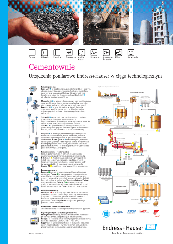 Cementownie Urządzenia pomiarowe Endress+Hauser w ciągu technologicznym Pomiary poziomu: Prosonic S 2 to ultradźwiękowe, bezkontaktowe układy pomiarowe używane m.in. w łamaczach, kruszarkach, silosach i zasobnikach surowców oraz w magazynie klinkieru. Alternatywnie trwałe, kontaktowe przetworniki elektromechaniczne Silopilot M 3 dla zakresów pomiarowych do 70 m. Micropilot M 8 to radarowe, bezkontaktowe przetworniki poziomu surowców, klinkieru, dodatków do cementu (popioły, żużel, gips, piasek), węgla opałowego i paliw alternatywnych (cięte opony). Levelflex M 1 to radar falowodowy w silosach dodatków do cementu, wyrobów gotowych oraz w zbiornikach paliwa podstawowego (pył węglowy) i alternatywnego (oleje, odpady zwierzęce). Solicap M 4 to pojemnościowe, trwałe sygnalizatory poziomu gruboziarnistych lub lepkich materiałów sypkich. Wsparcie sterowania zwałowarką (zrzut i komponowanie surowców na hałdzie) oraz zabezpieczenie przesypów surowców. Solicap S 5 to pojemnościowe, trwałe sygnalizatory poziomu gruboziarnistych lub gorących materiałów sypkich (zrzut z chłodnika klinkieru, zrzut z elektrofiltrów na instalacji odpylania spalin). Soliphant 6 to wibracyjne, uniwersalne sygnalizatory poziomu materiałów drobnoziarnistych, mączki surowcowej, dodatków do cementu i wyrobów gotowych, w tym sterowanie rękawami załadowczymi. Gammapilot M 7 to radiometryczne, bezpieczne detektory scyntylacyjne o bardzo wysokiej czułości do wykrywania blokady podgrzewaczy cyklonowych, do naważania klinkieru na podajnikach taśmowych i do pomiaru poziomu w podgrzewaczach paliw alternatywnych (cięte opony). Pomiary ciśnienia i różnicy ciśnień: Pomiary spadków ciśnienia w młynach, podgrzewaczach cyklonowych i piecu obrotowym za pomocą przetwornika ∆p Deltabar M 1 . Monitorowanie ciśnienia przepływu powietrza (palnik pieca obrotowego, wzruszanie mączki surowcowej, kompresorownie) oraz hydrostatyczne pomiary poziomu wody i płynnych dodatków do cementu za pomocą przetwornika Cerabar M 2 ze stabilnym i trwałym czujnikiem ceramicznym. Pomiary przepływu: Promass 1 to przepływomierz masowy oleju do palnika pieca obrotowego. Promag 2 to przepływomierz elektromagnetyczny wody chłodzącej młyny i sprężarki, dodatków chemicznych do cementu i odczynników na instalacji odazotowania spalin (DeNOx). Rurka spiętrzająca, kryza lub dysza Venturi’ego Deltatop/Deltaset z przetwornikiem ∆p Deltabar S 3 do pomiaru przepływu powietrza, gazów spalinowych i mieszanek pyłowo-powietrznych. Przepływomierze termiczne T-mass: powietrze i oleje smarowe. Pomiary temperatury: Omnigrad S 1 to termopary w pochwie do trudnych warunków procesowych dla pieca klinkierowego, młyna mączki surowcowej, podgrzewaczy cyklonowych, gazów spalinowych i chłodnika klinkieru. Czujniki termorezystancyjne z przetwornikami główkowymi i nalistwowymi iTEMP do pomiaru sprężonego powietrza i olejów smarowych. Komponenty systemów automatyki: Zasilacze, separatory, wskaźniki procesowe i przetworniki sygnałowe. Rejestracja danych i komunikacja obiektowa: Memograph to ekranowy, wielokanałowy rejestrator parametrów procesowych z wizualizacją i funkcjami matematycznymi. Fieldgate to obiektowy serwer sieciowy między aparatura obiektową a sieciami komunikacji Ethernet, HART i PROFIBUS. SupplyCare to aplikacja komputerowa do zarządzania magazynem surowców, półproduktów i wyrobów gotowych, która umożliwia płynną współpracę cementowni z poddostawcami i odbiorcami. www.pl.endress.com