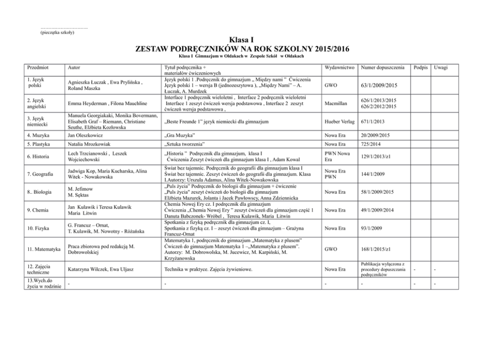 …………………………. (pieczątka szkoły) Klasa I ZESTAW PODRĘCZNIKÓW NA ROK SZKOLNY 2015/2016 Klasa I Gimnazjum w Ołdakach w Zespole Szkół w Ołdakach Przedmiot 1. Język polski Autor Agnieszka Łuczak , Ewa Prylińska , Roland Maszka Tytuł podręcznika + materiałów ćwiczeniowych Język polski 1 .Podręcznik do gimnazjum „ Między nami ” Ćwiczenia Język polski 1 – wersja B (jednozeszytowa ), „Między Nami” – A. Łuczak, A. Murdzek Interface 1 podręcznik wieloletni , Interface 2 podręcznik wieloletni Interface 1 zeszyt ćwiczeń wersja podstawowa , Interface 2 zeszyt ćwiczeń wersja podstawowa , Wydawnictwo Numer dopuszczenia GWO 63/1/2009/2015 Macmillan 626/1/2013/2015 626/2/2012/2015 Podpis Uwagi 2. Język angielski Emma Heyderman , Filona Mauchline 3. Język niemiecki Manuela Georgiakaki, Monika Bovermann, Elisabeth Graf – Riemann, Christiane Seuthe, Elżbieta Kozłowska „Beste Freunde 1” język niemiecki dla gimnazjum Hueber Verlag 671/1/2013 4. Muzyka Jan Oleszkowicz „Gra Muzyka” Nowa Era 20/2009/2015 5. Plastyka Natalia Mrozkowiak „Sztuka tworzenia” Nowa Era 725/2014 6. Historia Lech Trzcianowski , Leszek Wojciechowski „Historia ” Podręcznik dla gimnazjum, klasa I Ćwiczenia Zeszyt ćwiczeń dla gimnazjum klasa I , Adam Kowal PWN Nowa Era 129/1/2013/z1 7. Geografia Jadwiga Kop, Maria Kucharska, Alina Witek - Nowakowska Nowa Era PWN 144/1/2009 8.. Biologia M. Jefimow M. Sęktas Nowa Era 58/1/2009/2015 9. Chemia Jan Kulawik i Teresa Kulawik Maria Litwin Nowa Era 49/1/2009/2014 10. Fizyka G. Francuz – Ornat, T. Kulawik, M. Nowotny - Różańska Nowa Era 93/1/2009 11. Matematyka Praca zbiorowa pod redakcją M. Dobrowolskiej GWO 168/1/2015/z1 12. Zajęcia techniczne Katarzyna Wilczek, Ewa Uljasz Technika w praktyce. Zajęcia żywieniowe. Nowa Era Publikacja wyłączona z procedury dopuszczania podręczników - - 13.Wych.do życia w rodzinie - - - - - - Świat bez tajemnic. Podręcznik do geografii dla gimnazjum klasa I Świat bez tajemnic. Zeszyt ćwiczeń do geografii dla gimnazjum. Klasa I.Autorzy: Urszula Adamus, Alina Witek-Nowakowska „Puls życia” Podręcznik do biologii dla gimnazjum + ćwiczenie „Puls życia" zeszyt ćwiczeń do biologii dla gimnazjum Elżbieta Mazurek, Jolanta i Jacek Pawłowscy, Anna Zdziennicka Chemia Nowej Ery cz. I podręcznik dla gimnazjum Ćwiczenia „Chemia Nowej Ery ” zeszyt ćwiczeń dla gimnazjum część 1 Danuta Babczonek- Wróbel , Teresa Kulawik, Maria Litwin Spotkania z fizyką podręcznik dla gimnazjum cz. I, Spotkania z fizyką cz. I – zeszyt ćwiczeń dla gimnazjum – Grażyna Francuz-Ornat Matematyka 1, podręcznik do gimnazjum „Matematyka z plusem” Ćwiczeń do gimnazjum Matematyka 1 –„Matematyka z plusem”. Autorzy: M. Dobrowolska, M. Jucewicz, M. Karpiński, M. Krzyżanowska