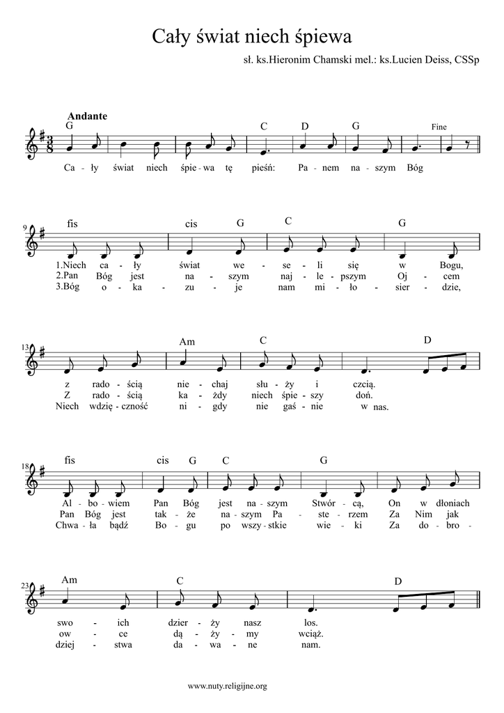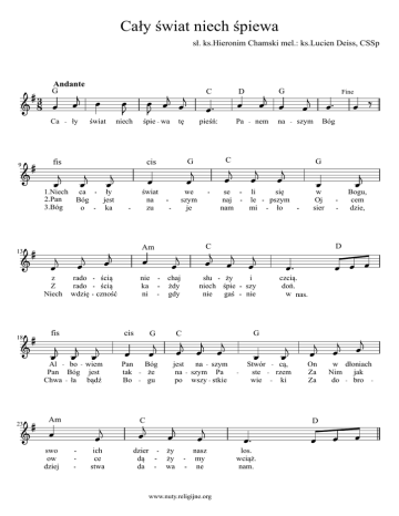 Cały świat niech śpiewa sł. ks.Hieronim Chamski mel.: ks.Lucien Deiss, CSSp Andante G 83 Ca 9 ły świat niech śpie wa tę C D pieśń: Pa cis G C świat na zu we szym je se naj nam fis G nem na Fine szym Bóg G 1.Niech ca 2.Pan Bóg 3.Bóg o ły jest ka li le mi się pszym ło w Oj sier Bogu, cem dzie, D C Am 13 z rado ścią Z rado ścią Niech wdzię czność fis nie ka ni cis G Pan tak Bo Bóg że gu chaj żdy gdy słu ży niech śpie nie gaś i szy nie czcią. doń. w nas. G 18 Al bo wiem Pan Bóg jest Chwa ła bądź Am 23 swo ow dziej C jest na szym na szym Pa po wszy stkie Stwór ste wie C ich ce stwa dzier dą da ży ży wa nasz my ne www.nuty.religijne.org los. wciąż. nam. cą, rzem ki On Za Za w dłoniach Nim jak do bro D