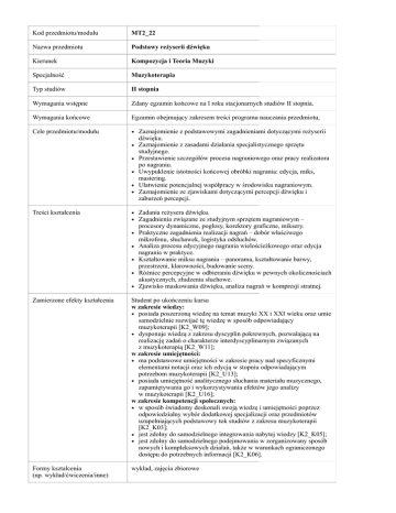 Kod przedmiotu/modułu MT2_22 Nazwa przedmiotu Podstawy reżyserii dźwięku Kierunek Kompozycja i Teoria Muzyki Specjalność Muzykoterapia Typ studiów II stopnia Wymagania wstępne Zdany egzamin końcowe na I roku stacjonarnych studiów II stopnia. Wymagania końcowe Egzamin obejmujący zakresem treści programu nauczania przedmiotu, Cele przedmiotu/modułu • Zaznajomienie z podstawowymi zagadnieniami dotyczącymi reżyserii dźwięku. • Zaznajomienie z zasadami działania specjalistycznego sprzętu • • • • Treści kształcenia studyjnego. Przestawienie szczegółów procesu nagraniowego oraz pracy realizatora po nagraniu. Uwypuklenie istotności końcowej obróbki nagrania: edycja, miks, mastering. Ułatwienie potencjalnej współpracy w środowisku nagraniowym. Zaznajomienie ze zjawiskami dotyczącymi percepcji dźwięku i zaburzeń percepcji. • Zadania reżysera dźwięku. • Zagadnienia związane ze studyjnym sprzętem nagraniowym – procesory dynamiczne, pogłosy, korektory graficzne, miksery. • Praktyczne zagadnienia realizacji nagrań – dobór właściwego mikrofonu, słuchawek, logistyka odsłuchów. • Analiza procesu edycyjnego nagrania wielościeżkowego oraz edycja nagrania w praktyce. • Kształtowanie miksu nagrania – panorama, kształtowanie barwy, przestrzeni, klarowności, budowanie sceny. • Różnice percepcyjne w odbieraniu dźwięku w pewnych okolicznościach akustycznych, złudzenia słuchowe. • Zjawisko maskowania dźwięku, analiza nagrań w kompresji stratnej. Zamierzone efekty kształcenia Student po ukończeniu kursu w zakresie wiedzy: • posiada poszerzoną wiedzę na temat muzyki XX i XXI wieku oraz umie samodzielnie rozwijać tę wiedzę w sposób odpowiadający muzykoterapii [K2_W09]; • dysponuje wiedzą z zakresu dyscyplin pokrewnych, pozwalającą na realizację zadań o charakterze interdyscyplinarnym związanych z muzykoterapią [K2_W11]; w zakresie umiejętności: • ma podstawowe umiejętności w zakresie pracy nad specyficznymi elementami notacji oraz ich edycją w stopniu odpowiadającym potrzebom muzykoterapii [K2_U13]; • posiada umiejętność analitycznego słuchania materiału muzycznego, zapamiętywania go i wykorzystywania efektów jego analizy w muzykoterapii [K2_U16]; w zakresie kompetencji społecznych: • w sposób świadomy doskonali swoją wiedzę i umiejętności poprzez odpowiedzialny wybór dodatkowej specjalizacji oraz przedmiotów uzupełniających podstawowy tok studiów z zakresu muzykoterapii [K2_K03]; • jest zdolny do samodzielnego integrowania nabytej wiedzy [K2_K05]; • jest zdolny do samodzielnego podejmowania w zorganizowany sposób nowych i kompleksowych działań, także w warunkach ograniczonego dostępu do potrzebnych informacji [K2_K06]. Formy kształcenia (np. wykład/ćwiczenia/inne) wykład, zajęcia zbiorowe ! Punkty ECTS (nakład pracy studenta niezbędny do osiągnięcia zamierzonych efektów kształcenia) I Rok 3 4 Punkty ECTS 1 1 Ilość godzin w tygodniu 1 1 zal egz Semestr 1 II Rodzaj zaliczenia Legenda 2 zal – zaliczenie egz – egzamin Kryteria oceny i sposoby weryfikacji Sprawdzian wiedzy praktycznej dotyczącej treści programowych przedmiotu. Literatura • Brice R., Music Engineering. Newnes, Oxford 2001. • Butryn W., Dźwięk cyfrowy. Wydawnictwa Komunikacji i Łączności, Warszawa 2001. • Huber D., Modern Recording Techniques, Focal Press, Burlington 2002. • Jorasz U., Wykłady z psychoakustyki. Poznań 1998. • Katz B., Mastering audio. The art and the science. Focal Press, Burlington 2002. • Owsinski B., The Mixing Engineer's Handbook. Artistpro.com, Vallejo, • • California 1999. Ozimek E., Dźwięk i jego percepcja – aspekty fizyczne i psychoakustyczne. Warszawa-Poznań 2002. Sztekmiler K., Podstawy nagłośnienia i realizacji nagrań, Wydawnictwa Komunikacji i Łączności, Warszawa 2009. Język wykładowy polski, angielski Prowadzący mgr Sebastian Ładyżyński Uwagi