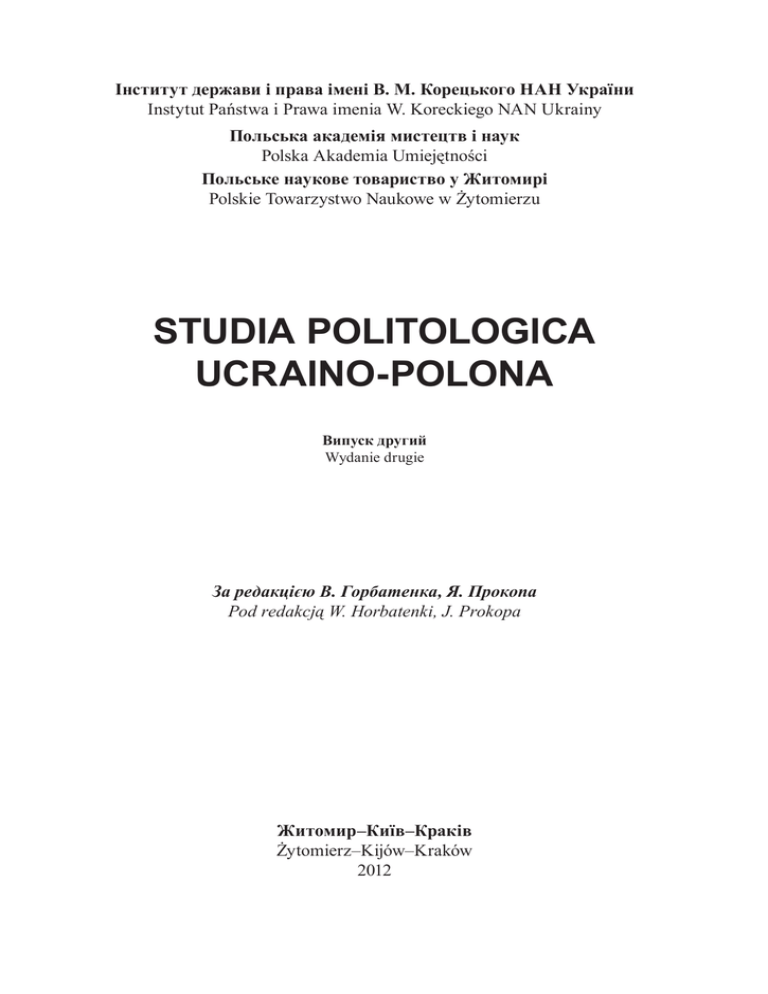 Інститут держави і права імені В. М. Корецького НАН України Instytut Państwa i Prawa imenia W. Koreckiego NAN Ukrainy Польська академія мистецтв і наук Polska Akademia Umiejętności Польське наукове товариство у Житомирі Polskie Towarzystwo Naukowe w Żytomierzu STUDIA POLITOLOGICA UCRAINO-POLONA Випуск другий Wydanie drugie За редакцією В. Горбатенка, Я. Прокопа Pod redakcją W. Horbatenki, J. Prokopa Житомир–Київ–Краків Żytomierz–Kijów–Kraków 2012 ББК 66.0(4Укр)+66.0(4 Пол) УДК 32(477)+32(438) Рекомендовано до друку Вченою радою Інституту держави і права імені В. М. Корецького Національної академії наук України протокол № 9 від 15 листопада 2012 р. У-45 Studia Politologica Ucraino-Polona. Випуск 2. – Житомир-Київ-Краків : ФОП Євенок О. О., 2012. – 206 с. ISBN 976-966-2534-15-3 ББК 66.0(4Укр)+66.0(4 Пол) УДК 32(477)+32(438) Відповідальність за достовірність фактів, цитат, імен та інших даних несуть автори публікацій. ©Польське наукове товариство у Житомирі, 2012 ©Інститут держави і права імені В. М. Корецького Національної академії наук України, 2012 ©Польська академія мистецтв і наук, 2012 Редакційна колегія Володимир Горбатенко, доктор політичних наук, професор, заступник директора Інституту держави і права імені В. М. Корецького НАН України (Київ) – голова від української сторони Ян Прокоп, доктор філологічних наук, професор, академік Польської академії наук і мистецтв (Краків)– голова від польської сторони Анджей А. Зємба, доктор історичних наук, секретар Східноєвропейської комісії Польської академії наук і мистецтв, ад’юнкт Інституту етнології і антропології Ягелонського університету (Краків) – заступник голови редакційної колегії від польської сторони Сергій Рудницький, кандидат філологічних наук, доцент, доцент кафедри філософії Житомирського державного університету імені Івана Франка – заступник голови редакційної колегії від української сторони Оксана Кукуруз, кандидат політичних наук, науковий співробітник Інституту держави і права імені В. М. Корецького НАН України (Київ) – відповідальний секретар від української сторони Агнєшка Кастори, кандидат політичних наук, ад'юнкт Інституту політичних наук і міжнародних відносин Ягелонського університету – відповідальний секретар від польської сторони Ольга Бабкіна, доктор політичних наук, професор, завідувач кафедри політичних наук Інституту політології та права Національного педагогічного університету імені М. П. Драгоманова (Київ) Ірина Баладинська, кандидат педагогічних наук, доцент, голова Польського наукового товариства в Житомирі Роман Бекер, професор, доктор політичних наук, завідувач кафедри теорії політики, декан факультету політології і міжнародних відносин Університету імені Миколи Коперника у Торуні, академік Польської академії наук (Варшава) Валерій Бортніков, доктор політичних наук, професор, завідувач кафедри політичних наук Волинського національного університету імені Лесі Українки (Луцьк) Войцех Кауте, професор, доктор політичних наук, завідувач відділу історії суспільної і політичної думки Силезького університету (Катовіце) Ірена Котович-Борови, кандидат історичних наук, ад’юнкт відділу міжкультурної освіти факультету гуманістичних наук Вищої школи сільського господарства (Варшава) Ірина Кресіна, доктор політичних наук, професор, член-кореспондент Національної академії правових наук України, завідувач відділу правових проблем політології Інституту держави і права імені В. М. Корецького Національно