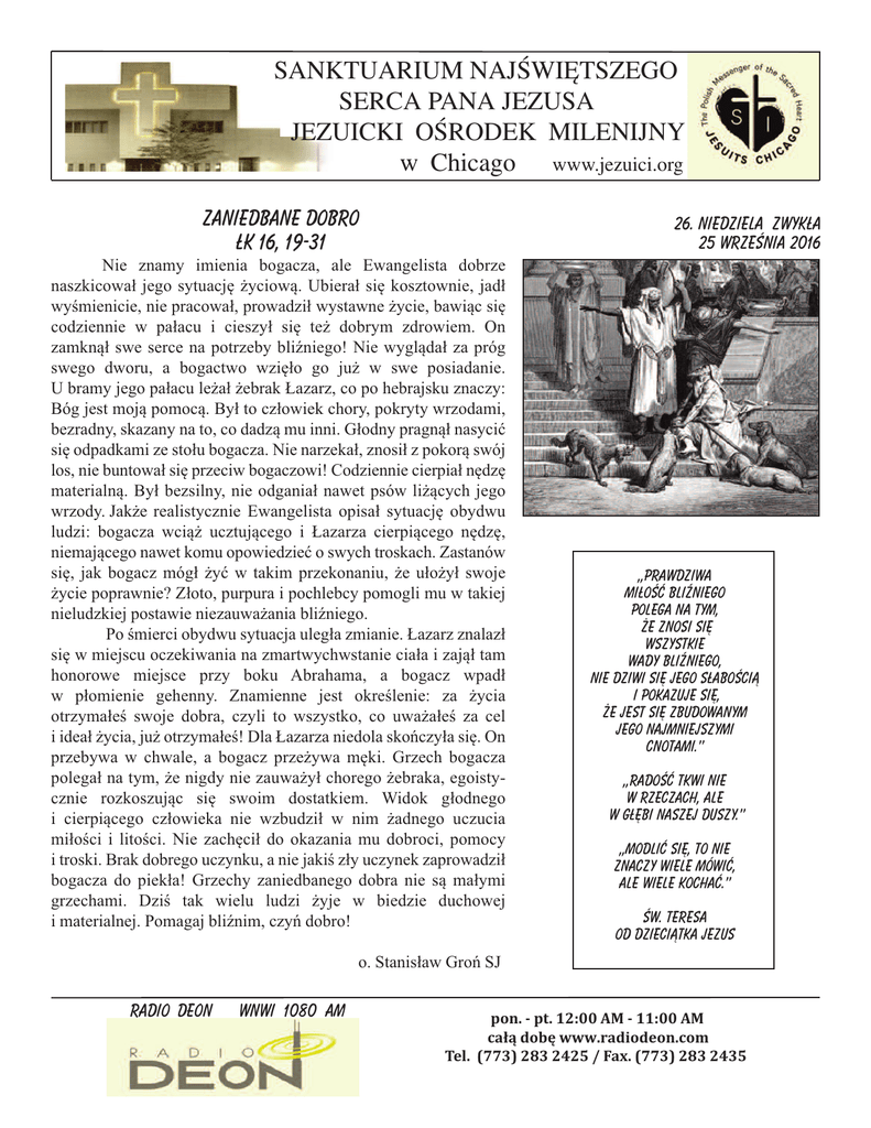 SANKTUARIUM NAJŚWIĘTSZEGO SERCA PANA JEZUSA JEZUICKI OŚRODEK MILENIJNY w Chicago www.jezuici.org Zaniedbane dobro Łk 16, 19-31 Nie znamy imienia bogacza, ale Ewangelista dobrze naszkicował jego sytuację życiową. Ubierał się kosztownie, jadł wyśmienicie, nie pracował, prowadził wystawne życie, bawiąc się codziennie w pałacu i cieszył się też dobrym zdrowiem. On zamknął swe serce na potrzeby bliźniego! Nie wyglądał za próg swego dworu, a bogactwo wzięło go już w swe posiadanie. U bramy jego pałacu leżał żebrak Łazarz, co po hebrajsku znaczy: Bóg jest moją pomocą. Był to człowiek chory, pokryty wrzodami, bezradny, skazany na to, co dadzą mu inni. Głodny pragnął nasycić się odpadkami ze stołu bogacza. Nie narzekał, znosił z pokorą swój los, nie buntował się przeciw bogaczowi! Codziennie cierpiał nędzę materialną. Był bezsilny, nie odganiał nawet psów liżących jego wrzody. Jakże realistycznie Ewangelista opisał sytuację obydwu ludzi: bogacza wciąż ucztującego i Łazarza cierpiącego nędzę, niemającego nawet komu opowiedzieć o swych troskach. Zastanów się, jak bogacz mógł żyć w takim przekonaniu, że ułożył swoje życie poprawnie? Złoto, purpura i pochlebcy pomogli mu w takiej nieludzkiej postawie niezauważania bliźniego. Po śmierci obydwu sytuacja uległa zmianie. Łazarz znalazł się w miejscu oczekiwania na zmartwychwstanie ciała i zajął tam honorowe miejsce przy boku Abrahama, a bogacz wpadł w płomienie gehenny. Znamienne jest określenie: za życia otrzymałeś swoje dobra, czyli to wszystko, co uważałeś za cel i ideał życia, już otrzymałeś! Dla Łazarza niedola skończyła się. On przebywa w chwale, a bogacz przeżywa męki. Grzech bogacza polegał na tym, że nigdy nie zauważył chorego żebraka, egoistycznie rozkoszując się swoim dostatkiem. Widok głodnego i cierpiącego człowieka nie wzbudził w nim żadnego uczucia miłości i litości. Nie zachęcił do okazania mu dobroci, pomocy i troski. Brak dobrego uczynku, a nie jakiś zły uczynek zaprowadził bogacza do piekła! Grzechy zaniedbanego dobra nie są małymi grzechami. Dziś tak wielu ludzi żyje w biedzie duchowej i materialnej. Pomagaj bliźnim, czyń dobro! o. Stanisław Groń SJ RADIO DEON WNWI 1080 AM 26. Niedziela zwykła 25 września 2016 ,,Prawdziwa miłość bliźniego polega na tym, że znosi się wszystkie wady bliźniego, nie dziwi się jego słabością i pokazuje się, że jest się zbudowanym jego najmniejszymi cnotami.” ,,Radość tkwi nie w rzeczach, ale w głębi naszej duszy.” ,,Modlić się, to nie znaczy wiele mówić, ale wiele kochać.” św. Teresa od dzieciątka jezus pon. - pt. 12:00 AM - 11:00 AM całą dobę www.radiodeon.com Tel. (773) 283 2425 / Fax. (773) 283 2435 PORZĄDEK MSZY ŚWIĘTYCH Poniedziałek - pi¹tek: 8:00, 18:00, 19:00 1 piątek miesiąca: 8:00, 18:00 i 19:00 Środa: 19:00 - nowenna do Matki Bożej Nieustającej Pomocy Sobota: 8:00 i 19:00 , tylko w I sobotę miesiąca o 17:00 dla chorych, Niedziela: 8:00 (radiowa), 9:30, 11:00, 13:00, 19:00, 20:30 -=- SpowiedŸ św.: od poniedziałku do soboty - 7:30 i 18:30, w niedzielę - pó³ godziny przed ka¿d¹ Msz¹ Œwiêt¹, W 1. pi¹tek miesi¹ca - od 17:30 do 20:00 Adoracja Najświętszego Sakramentu - od poniedziałku do czwartku - od 18:30 do 19:00 sobota - od 18:00 do 19:00 Sanktuarium Najświętszego Serca Pana Jezusa Jezuicki Ośrodek Milenijny 5835 W. Irving Park Rd.; Chicago, IL 60634, tel. 773 777 7000 fax 773 427 0126 www.jezuici.org e-mail: [email protected] Audycje Radia DEON: tel. 773 283 2425 Fax. 773 283 2435 www. radiodeon.com e-mail: [email protected] Biuro czynne: od poniedziałku do soboty: 8:30 - 9:00, 15:30 - 20:30 niedziela: 8:30 - 15:00 Biblioteka czynna: niedziela: 10:30 - 14:30 Kawiarenka czynna: niedz.: 10:00 - 15:00 Sacred Heart Mission House 4105 N. Avers Ave., Chicago, IL 60618 tel. 773 588 74 76; fax 773 588 65 17 Rektor Sanktuarium i Przełożony Jezuitów o. Tomasz Oleniacz , SJ (773-588-7476 - ext. 224) o. Paweł Kosiński , SJ (773-777-7000 - ext. 121) o. Jerzy Mordarski, SJ (773-588-7476 - ext. 234) o. Jerzy Karpiński, SJ (773-588-7476 - ext. 237) o. Paweł Witon, SJ (773-588-7476 - ext. 227) br. Adam Poręba, SJ (773-777-7000 - ext. 122) Wszelkie ofiary i donacje prosimy kierowaæ na adres Sanktuarium. Donacje s¹ wolne od podatku i mo¿na je odpisywaæ przy rozliczeniu z IRS. TRANSMISJE RADIOWE I INTERNETOWE w internecie pod adresem: http://75.145.184.1/polishmass niedziela: godz 8:00, Radio WCEV 1450 Codziennie przez całą dobę: Kamera internetowa z Sanktuarium (obraz i dźwięk; używać Internet Explorer): www.jezuici.org - link „Transmisje na żywo” – wpisać jako użytkownik i hasło: 5835 INTENCJE MSZY ŚWIĘTYCH Niedziela, 18 IX 8:00 + + Emilia i Marian Lippert 9:30 Zbiorowa 11:00 + Franciszek Bzdek w 2. rocznicę śmierci 13:00 + Marian Rybak oraz za wszystkie dusze rodziny Rybaków i Wojtaszków 19:00 Zbiorowa 20:30 + + Marceli Szydłowski, + + Marianna, Władysław, Grudzień, siostra + Aurelia Biernat, + + Jan i Katarzyna Biernat, + Antoni Pietra oraz zmarli z rodziny Poniedziałek, 26 IX 8:00 + syn + Bogdan w 17. miesięcy po śmierci, o miłosierdzie Boże 18:00 + Zofia Tereszczyk 19:00 Zbiorowa Wtorek, 27 IX - św. Wincentego a Paulo 8:00 + Edward Będziecki z Suwałk w 6. rocznicę śmierci 18:00 + Bronisław Paszkowski z okazji imienin 19:00 Zbiorowa Środa, 28 IX 8:00 za Dobroczyńców Jezuickiego Ośrodka Milenijnego 18:00 + Edward Będziecki w 6. rocznicę śmierci 19:00 Zbiorowa Czwartek, 29 IX - Świętych Archaniołów Michała, Gabriela i Rafała, 8:00 + Marianna Kuźnicka w 1. rocznicę śmierci, o wieczny odpoczynek 18:00 + Stanisław Forc w 1. rocznicę śmierci 19:00 Zbiorowa Piątek, 30 IX 8:00 + Andrzej Serafin w 6. miesięcy po smierci 18:00 + Władysław Ledwoń 19:00 Zbiorowa I Sobota, 1 X - św. Teresy od Dzieciątka Jezus, doktora Kościoła, patronki m