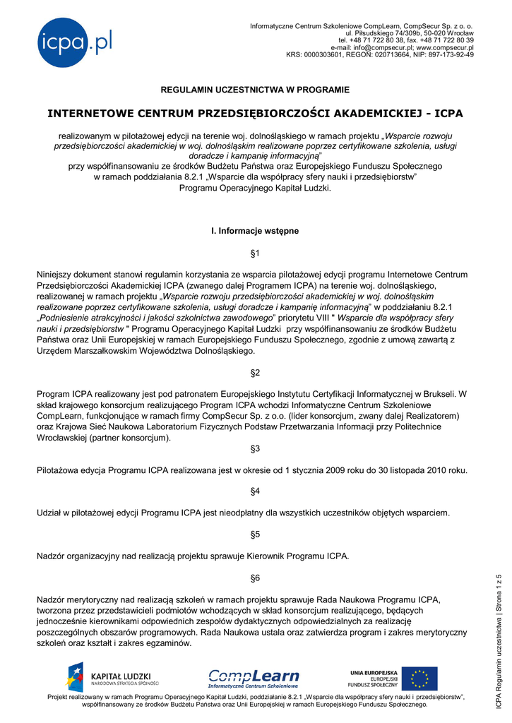 Informatyczne Centrum Szkoleniowe CompLearn, CompSecur Sp. z o. o. ul. Piłsudskiego 74/309b, 50-020 Wrocław tel. +48 71 722 80 38, fax. +48 71 722 80 39 e-mail: [email protected]; www.compsecur.pl KRS: 0000303601, REGON: 020713664, NIP: 897-173-92-49 REGULAMIN UCZESTNICTWA W PROGRAMIE INTERNETOWE CENTRUM PRZEDSIĘBIORCZOŚCI AKADEMICKIEJ - ICPA realizowanym w pilotażowej edycji na terenie woj. dolnośląskiego w ramach projektu „Wsparcie rozwoju przedsiębiorczości akademickiej w woj. dolnośląskim realizowane poprzez certyfikowane szkolenia, usługi doradcze i kampanię informacyjną” przy współfinansowaniu ze środków Budżetu Państwa oraz Europejskiego Funduszu Społecznego w ramach poddziałania 8.2.1 „Wsparcie dla współpracy sfery nauki i przedsiębiorstw” Programu Operacyjnego Kapitał Ludzki. I. Informacje wstępne §1 Niniejszy dokument stanowi regulamin korzystania ze wsparcia pilotażowej edycji programu Internetowe Centrum Przedsiębiorczości Akademickiej ICPA (zwanego dalej Programem ICPA) na terenie woj. dolnośląskiego, realizowanej w ramach projektu „Wsparcie rozwoju przedsiębiorczości akademickiej w woj. dolnośląskim realizowane poprzez certyfikowane szkolenia, usługi doradcze i kampanię informacyjną” w poddziałaniu 8.2.1 „Podniesienie atrakcyjności i jakości szkolnictwa zawodowego” priorytetu VIII " Wsparcie dla współpracy sfery nauki i przedsiębiorstw " Programu Operacyjnego Kapitał Ludzki przy współfinansowaniu ze środków Budżetu Państwa oraz Unii Europejskiej w ramach Europejskiego Funduszu Społecznego, zgodnie z umową zawartą z Urzędem Marszałkowskim Województwa Dolnośląskiego. §2 Program ICPA realizowany jest pod patronatem Europejskiego Instytutu Certyfikacji Informatycznej w Brukseli. W skład krajowego konsorcjum realizującego Program ICPA wchodzi Informatyczne Centrum Szkoleniowe CompLearn, funkcjonujące w ramach firmy CompSecur Sp. z o.o. (lider konsorcjum, zwany dalej Realizatorem) oraz Krajowa Sieć Naukowa Laboratorium Fizycznych Podstaw Przetwarzania Informacji przy Politechnice Wrocławskiej (partner konsorcjum). §3 Pilotażowa edycja Programu ICPA realizowana jest w okresie od 1 stycznia 2009 roku do 30 listopada 2010 roku. §4 Udział w pilotażowej edycji Programu ICPA jest nieodpłatny dla wszystkich uczestników objętych wsparciem. §5 §6 Nadzór merytoryczny nad realizacją szkoleń w ramach projektu sprawuje Rada Naukowa Programu ICPA, tworzona przez przedstawicieli podmiotów wchodzących w skład konsorcjum realizującego, będących jednocześnie kierownikami odpowiednich zespołów dydaktycznych odpowiedzialnych za realizację poszczególnych obszarów programowych. Rada Naukowa ustala oraz zatwierdza program i zakres merytoryczny szkoleń oraz kształt i zakres egzaminów. Projekt realizowany w ramach Programu Operacyjnego Kapitał Ludzki, poddziałanie 8.2.1 „Wsparcie dla współpracy sfery nauki i przedsiębiorstw”, współfinansowany ze środków Budżetu Państwa oraz Unii Europejskiej w ramach Europejskiego Funduszu Społecznego. ICPA Regulamin uczestnictwa | Strona 1 z 5 Nadzór organizacyjny nad realizacją projektu sprawuje Kierownik Programu ICPA. Informatyczne Centrum Szkoleniowe CompLearn, CompSecur Sp. z o. o. ul. Piłsudskiego 74/309b, 50-020 Wrocław tel. +48 71 722 80 38, fax. +48 71 722 80 39 e-mail: [email protected]; www.compsecur.pl KRS: 0000303601, REGON: 020713664, NIP: 897-173-92-49 II. Dane kontaktowe i biuro Programu ICPA §7 Biuro sekretariatu Programu ICPA znajduje pod adresem: ul. Piłsudskiego 74, p. 309 (budynek NOT, III piętro) we Wrocławiu (kod pocztowy 50-020). Biuro czynne jest od poniedziałku do piątku, w godzinach 13-17. Bezpośredni numer telefoniczny biura sekretariatu Programu ICPA to 0 71 722 59 68 (numer faksu to 0 71 722 80 39). §8 Dla obsługi informacyjnej Programu ICPA uruchomiona została infolinia telefoniczna: 0 801 011 647, czynna od poniedziałku do piątku w godzinach od 13 do 17. Kontaktowy adres e-mail Programu to [email protected], a strona internetowa to www.icpa.pl. III. Cel i działania Programu ICPA §9 Ogólnym celem Programu ICPA jest oddziaływanie na rzecz rozwoju przedsiębiorczości akademickiej i zwiększenia współpracy sfer nauki i przedsiębiorstw, w kontekście wymagań nowoczesnej gospodarki opartej na wiedzy, w której szczególnie istotna staje się innowacyjność bazująca na wynikach prac badawczych w dziedzinie technologii informacyjno-komunikacyjnych (ICT), poprzez wsparcie doradczo-szkoleniowe osób wywodzących się ze środowisk akademickich zainteresowanych założeniem działalności gospodarczej, w zakresie przedsiębiorczości akademickiej, komercjalizacji wyników badań i wykorzystania nowoczesnych technologii ICT w biznesie. §10 Program ICPA realizuje cel ogólny poprzez realizację następujących działań: 1. Organizacja bezpłatnych szkoleń w zakresie przedsiębiorczości akademickiej, komercjalizacji wyników badań i wykorzystania nowoczesnych technologii ICT w biznesie dla przedstawicieli środowisk akademickich zainteresowanych założeniem własnej działalności gospodarczej, prowadzonych zdalnie w formie e-learning i zakończonych możliwością uzyskania certyfikatu Europejskiego Instytutu Certyfikacji Informatycznej EITCI (zwanych dalej „Programem szkoleń”). 2. Wdrożenie programu doradczego w zakresie przedsiębiorczości akademickiej, komercjalizacji wyników badań i wykorzystania nowoczesnych technologii ICT w biznesie w ramach nowoczesnego serwisu informacyjnodoradczego, oferującego bezpłatnie usługi bezpośrednich porad i informacji udzielanych przez specjalistów, (zwanego dalej „Serwisem informacyjno-doradczym”). Projekt realizowany w ramach Programu Operacyjnego Kapitał Ludzki, poddziałanie 8.2.1 „Wsparcie dla współpracy sfery nauki i przedsiębiorstw”, współfinansowany ze środków Budżetu Państwa oraz Unii Europejskiej w ramach Europejskie