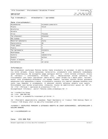 'Alfa Investment - Nieruchomości Doradztwo Finanse' SM10197 Typ transakcji: ul. Grudziądzka 79 Toruń tel. (56) 664 10 25/26 tel.kom +48 888 658 303 mieszkania / sprzedaż Dane nieruchomości: Województwo kujawsko-pomorskie Miasto Toruń Dzielnica Osiedle Ulica Tłoczka Typ własności własność Rok budowy 0 Materiał wykonania płyta Powierzchnia 46 Ilość pokoi 2 Piętro 3 Typ ogrzewania miejskie Rozkładowe tak Kuchnia samodzielna Dodatki balkon Pięter w budynku 4 Zasiedlenie od zaraz Informacje: Mam przyjemność zaoferować Państwu bardzo ładne mieszkanie na sprzedaż. W pobliżu znajduje się wiele sklepów, stacja benzynowa, kwiaciarnia, przedszkole oraz doskonale rozbudowany węzeł komunikacyjny. Na szczególna uwagę zasługuje okolica - wiele terenów zielonych, miejsc do rekreacji i piknikowania, bliskość lasu... Bezsprzecznym atutem położenia tej nieruchomości jest także "sąsiedztwo" zakola Wisły. Lokal składa się z dwóch pokoi, łazienki, kuchni oraz przedpokoju.Mieszkanie nie wymaga remontu. Łazienka została bardzo gustownie wykończona oraz wyposażona w wannę. W mieszkaniu znajduje się również zabudowa kuchenna oraz szafa typu Komandor w przedpokoju. W pokojach zostały położone gładzie oraz panele. Nieruchomość jest bardzo przestronna, słoneczna. Czynsz do administracji wynosi ok. 407 zł. <br /><br />Polecam i zapraszam do prezentacji!!!<br /> Szczegółowych informacji, udzieli Państwu osoba prowadząca:<br /> <br /><b>Martika Szewa <br />Tel. 888-658-304 <br />e-mail: [email protected]</b><br /> <br />Pośrednik odpowiedzialny zawodowo: Paweł Dawidowicz nr licencji 7432 Andrzej Pamin nr licencji 1145 Więcej ofert na www.alfa-investment.pl<br /> <b>UWAGA!!! BEZPŁATNIE POMAGAMY W UZYSKANIU KREDYTU NA ZAKUP NIERUCHOMOŚCI. WSPÓŁPRACUJEMY Z WIELOMA BANKAMI. <br /><b>ZAPRASZAMY</b> Cena: 215 000 PLN Dokument wygenerowany ze strony www.alfa-investment.pl Strona 1