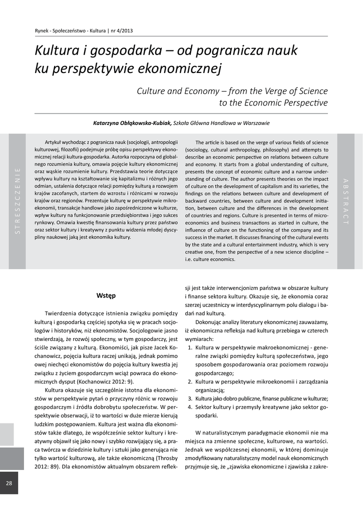Rynek - Społeczeństwo - Kultura | nr 4/2013 Kultura i gospodarka – od pogranicza nauk ku perspektywie ekonomicznej Culture and Economy – from the Verge of Science to the Economic Perspective Artykuł wychodząc z pogranicza nauk (socjologii, antropologii kulturowej, filozofii) podejmuje próbę opisu perspektywy ekonomicznej relacji kultura-gospodarka. Autorka rozpoczyna od globalnego rozumienia kultury, omawia pojęcie kultury ekonomicznej oraz wąskie rozumienie kultury. Przedstawia teorie dotyczące wpływu kultury na kształtowanie się kapitalizmu i różnych jego odmian, ustalenia dotyczące relacji pomiędzy kulturą a rozwojem krajów zacofanych, startem do wzrostu i różnicami w rozwoju krajów oraz regionów. Prezentuje kulturę w perspektywie mikroekonomii, transakcje handlowe jako zapośredniczone w kulturze, wpływ kultury na funkcjonowanie przedsiębiorstwa i jego sukces rynkowy. Omawia kwestię finansowania kultury przez państwo oraz sektor kultury i kreatywny z punktu widzenia młodej dyscypliny naukowej jaką jest ekonomika kultury. Wstęp Twierdzenia dotyczące istnienia związku pomiędzy kulturą i gospodarką częściej spotyka się w pracach socjologów i historyków, niż ekonomistów. Socjologowie jasno stwierdzają, że rozwój społeczny, w tym gospodarczy, jest ściśle związany z kulturą. Ekonomiści, jak pisze Jacek Kochanowicz, pojęcia kultura raczej unikają, jednak pomimo owej niechęci ekonomistów do pojęcia kultury kwestia jej związku z życiem gospodarczym wciąż powraca do ekonomicznych dysput (Kochanowicz 2012: 9). Kultura okazuje się szczególnie istotna dla ekonomistów w perspektywie pytań o przyczyny różnic w rozwoju gospodarczym i źródła dobrobytu społeczeństw. W perspektywie obserwacji, iż to wartości w duże mierze kierują ludzkim postępowaniem. Kultura jest ważna dla ekonomistów także dlatego, że współcześnie sektor kultury i kreatywny objawił się jako nowy i szybko rozwijający się, a praca twórcza w dziedzinie kultury i sztuki jako generująca nie tylko wartość kulturową, ale także ekonomiczną (Throsby 2012: 89). Dla ekonomistów aktualnym obszarem reflek28 The article is based on the verge of various fields of science (sociology, cultural anthropology, philosophy) and attempts to describe an economic perspective on relations between culture and economy. It starts from a global understanding of culture, presents the concept of economic culture and a narrow understanding of culture. The author presents theories on the impact of culture on the development of capitalism and its varieties, the findings on the relations between culture and development of backward countries, between culture and development initiation, between culture and the differences in the development of countries and regions. Culture is presented in terms of microeconomics and business transactions as started in culture, the influence of culture on the functioning of the company and its success in the market. It discusses financing of the cultural events by the state and a cultural entertainment industry, which is very creative one, from the perspective of a new science discipline – i.e. culture economics. sji jest także interwencjonizm państwa w obszarze kultury i finanse sektora kultury. Okazuje się, że ekonomia coraz szerzej uczestniczy w interdyscyplinarnym polu dialogu i badań nad kulturą. Dokonując analizy literatury ekonomicznej zauważamy, iż ekonomiczna refleksja nad kulturą przebiega w czterech wymiarach: 1. Kultura w perspektywie makroekonomicznej - generalne związki pomiędzy kulturą społeczeństwa, jego sposobem gospodarowania oraz poziomem rozwoju gospodarczego; 2. Kultura w perspektywie mikroekonomii i zarządzania organizacją; 3. Kultura jako dobro publiczne, finanse publiczne w kulturze; 4. Sektor kultury i przemysły kreatywne jako sektor gospodarki. W naturalistycznym paradygmacie ekonomii nie ma miejsca na zmienne społeczne, kulturowe, na wartości. Jednak we współczesnej ekonomii, w której dominuje zmodyfikowany naturalistyczny model nauk ekonomicznych przyjmuje się, że „zjawiska ekonomiczne i zjawiska z zakre- ABSTRACT STRESZCZENIE Katarzyna Obłąkowska-Kubiak, Szkoła Główna Handlowa w Warszawie Katarzyna Obłąkowska-Kubiak - Kultura i gospodarka... su zarządzania należy badać w ich specyficznych uwarunkowaniach.” Należy brać pod uwagę czynniki pozaekonomiczne, m.in. kontekst kulturowy. „Badania zjawisk z zakresu procesów gospodarowania nie powinny abstrahować od wiedzy dostarczanej przez inne nauki. Interdyscyplinarność pomaga w bardziej kompleksowym i pełnym wyjaśnianiu zjawisk odzwierciedlając ich często wieloczynnikowy charakter” (Nikiel 2007: 67). Ekonomiści okazują się coraz bardziej wrażliwi na zmienne kulturowe, chociaż dużą trudność napotyka kwestia operacjonalizacji pojęcia kultura. Kultura jest jednym z najbardziej popularnych terminów humanistyki i nauk społecznych (Kaliszewski 2012: 11). Jest pojęciem, które posiada wiele definicji i kategoryzacji na gruncie nauk takich, jak antropologia kulturowa, czy socjologia. Jak kultura rozumiana jest na gruncie ekonomii? W jaki sposób przebiega ekonomiczna refleksja naukowa wokół kultury w powiązaniu z innymi naukami? Poszukiwanie odpowiedzi na te pytania jest kluczowym celem niniejszego artykułu. Wychodzi on z pogranicza nauk (socjologii, antropologii kulturowej, filozofii) i podejmuje próbę opisu perspektywy ekonomicznej relacji kultura–gospodarka. Od globalnego rozumienia kultury do kultury ekonomicznej Naukowa refleksja nad kulturą ma swoją długą tradycję. Socjolog Antonina Kłoskowska pisze za antropologami kulturowymi Alfredem Kroeberem i Clyde’em Kluckhohn’em, iż pojęcie kultura na dobre zagościło w literaturze naukowej od XVIII wieku (Kłoskowska 2007: 19). Kłoskowska przywołuje twierdzenia XVIII-wiecznego filozofa Johanna Herdera, iż „kultura stanowi swoiście l