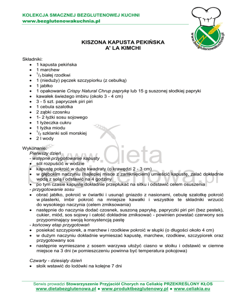 KOLEKCJA SMACZNEJ BEZGLUTENOWEJ KUCHNI www.bezglutenowakuchnia.pl KISZONA KAPUSTA PEKIŃSKA A' LA KIMCHI Składniki: 1 kapusta pekińska 1 marchew 1/3 białej rzodkwi 1 (nieduży) pęczek szczypiorku (z cebulką) 1 jabłko 1 opakowanie Crispy Natural Chrup paprykę lub 15 g suszonej słodkiej papryki kawałek świeżego imbiru (około 3 - 4 cm) 3 - 5 szt. papryczek piri piri 1 cebula szalotka 2 ząbki czosnku 1- 2 łyżki sosu sojowego 1 łyżeczka cukru 1 łyżka miodu 1/2 szklanki soli morskiej 2 l wody Wykonanie: Pierwszy dzień - wstępne przygotowanie kapusty sól rozpuścić w wodzie kapustę pokroić w duże kwadraty (o krawędzi 2 - 3 cm) w głębokim naczyniu (najlepiej misce z zamknięciem) umieścić kapustę, zalać dokładnie wodą z solą i odstawić na 4 godziny po tym czasie kapustę dokładnie przepłukać na sitku i odstawić celem osuszenia - przygotowanie sosu obrać jabłko, pokroić w ćwiartki i usunąć gniazdo z nasionami, cebulę szalotkę pokroić w plasterki, imbir pokroić na mniejsze kawałki i wszystkie te składniki wrzucić do wysokiego naczynia (celem zmiksowania) następnie do naczynia dodać czosnek, suszoną paprykę, papryczki piri piri (bez pestek), cukier, miód, sos sojowy i całość dokładnie zmiksować - powinien powstać czerwony sos przypominający swoją konsystencją pastę - końcowy etap przygotowań posiekać szczypiorek, a marchew i rzodkiew pokroić w słupki (o długości około 4 cm) w dużym naczyniu dokładnie wymieszać kapustę, marchew, rzodkiew, szczypiorek oraz przygotowany sos następnie wymieszane z sosem warzywa ułożyć ciasno w słoiku i odstawić w ciemne miejsce na 3 dni (w pomieszczeniu powinna być temperatura pokojowa) Czwarty - dziesiąty dzień słoik wstawić do lodówki na kolejne 7 dni Serwis prowadzi Stowarzyszenie Przyjaciół Chorych na Celiakię PRZEKREŚLONY KŁOS www.dietabezglutenowa.pl ● www.produktbezglutenowy.pl ● www.celiakia.eu