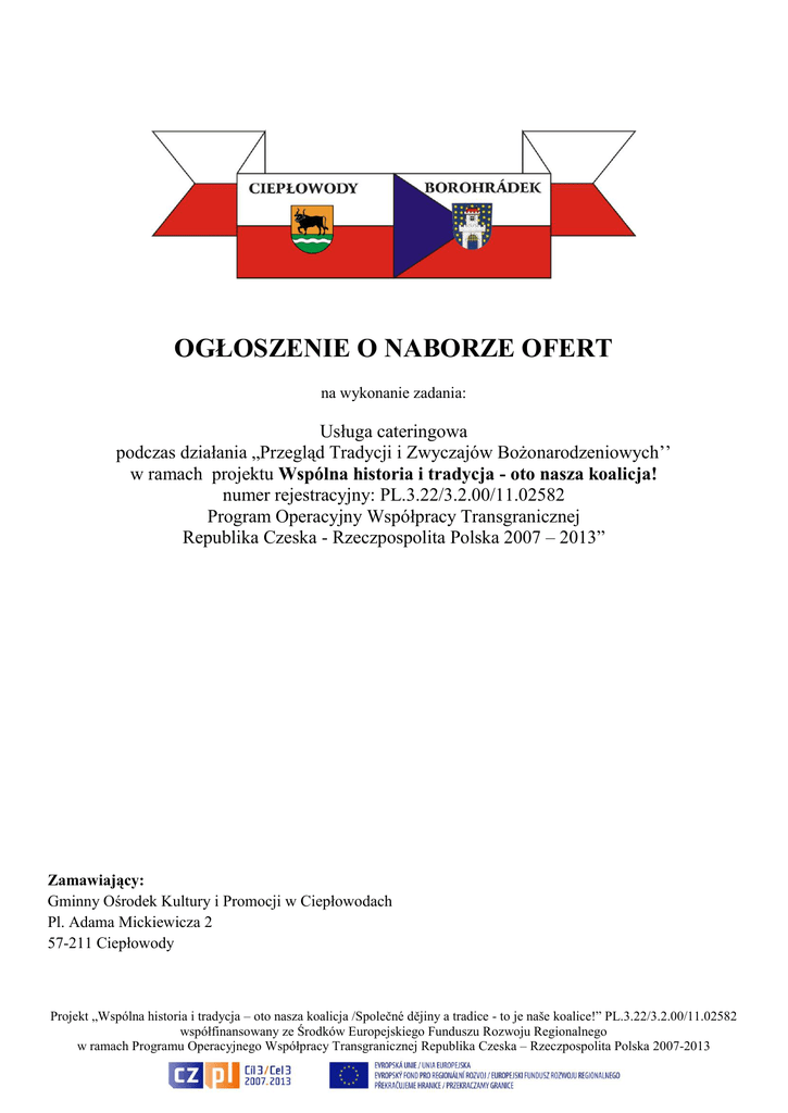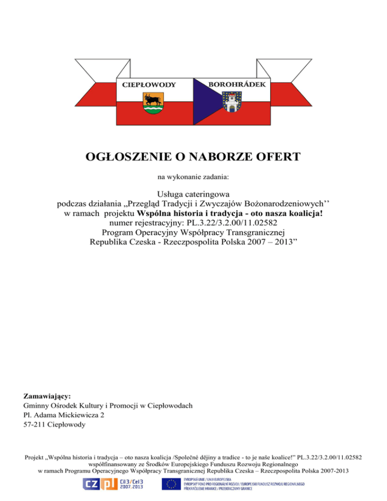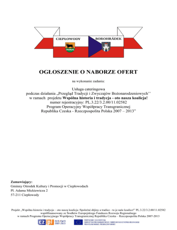 OGŁOSZENIE O NABORZE OFERT na wykonanie zadania: Usługa cateringowa podczas działania „Przegląd Tradycji i Zwyczajów Bożonarodzeniowych’’ w ramach projektu Wspólna historia i tradycja - oto nasza koalicja! numer rejestracyjny: PL.3.22/3.2.00/11.02582 Program Operacyjny Współpracy Transgranicznej Republika Czeska - Rzeczpospolita Polska 2007 – 2013” Zamawiający: Gminny Ośrodek Kultury i Promocji w Ciepłowodach Pl. Adama Mickiewicza 2 57-211 Ciepłowody Projekt „Wspólna historia i tradycja – oto nasza koalicja /Společné dějiny a tradice - to je naše koalice!” PL.3.22/3.2.00/11.02582 współfinansowany ze Środków Europejskiego Funduszu Rozwoju Regionalnego w ramach Programu Operacyjnego Współpracy Transgranicznej Republika Czeska – Rzeczpospolita Polska 2007-2013 1. Zamawiający Gminny Ośrodek Kultury i Promocji w Ciepłowodach, Pl. Adama Mickiewicza 2, 57-211 Ciepłowody. Osobą upoważnioną do kontaktów z oferentami jest: Edyta Zielonka, tel. 74 80 03 274, mobile: 509 791 690, e-mail: [email protected] 2. Opis przedmiotu zamówienia: Przedmiotem zamówienia jest usługa cateringowa dla 150 osób podczas działania Przegląd Tradycji i Zwyczajów Bożonarodzeniowych „Przy wigilijnym stole” 16.12.2012r. w ramach projektu „Wspólna historia i tradycja – oto nasza koalicja/Společné dějiny a tradice - to je naše koalice!”, PL.3.22/3.2.00/11.02582, współfinansowanego ze Środków Europejskiego Funduszu Rozwoju Regionalnego w ramach Programu Operacyjnego Współpracy Transgranicznej Republika Czeska – Rzeczpospolita Polska 2007-2013. Usługa obejmuje przygotowanie potraw: pierogi z kapustą i grzybami, pierogi z kaszą gryczaną, barszcz z uszkami, krokiety z kapustą i grzybami, śledź pod pierzynką, rolmopsy, kapusta z grochem, kluski z makiem, kutia, schab ze śliwką, ryba po grecku, karp smażony, karp w galarecie, kompot z suszu, sałatka jarzynowa, bigos i dostarczenie ich na miejsce imprezy, tj. Hala Sportowa przy Zespole Szkół Samorządowych w Ciepłowodach w dniu 16.12.2012r. do godz. 14.00. 3. Termin realizacji: 16.12.2012r. 4. Warunki dopuszczające W postępowaniu mogą wziąć udział (złożyć ofertę) oferenci nie wykluczeni na podstawie art. 24 ustawy Prawo zamówień publicznych oraz spełniający warunki zawarte w art. 22 ust. 1 tejże ustawy. Potwierdzeniem spełnienia tych warunków jest złożenie pisemnego oświadczenia stanowiącego załącznik do formularza ofertowego. 5. Informacje dotyczące składania ofert 5.1 Postać oferty Oferta musi być napisana w języku polskim, wszystkie podpisy muszą być czytelne i złożone przez osobę uprawnioną do występowania w imieniu wykonawcy usługi, wszystkie dokumenty, składające się na ofertę, muszą być przedstawione w formie oryginałów lub kserokopii poświadczonych „za zgodność z oryginałem”. Wykonawca ma prawo złożyć tylko jedną ofertę. Do oferty muszą być dołączone następujące dokumenty: - oświadczenie o spełnianiu warunków udziału w postępowaniu, określone w art. 22 ust. 1 ustawy Prawo zamówień publicznych. 5.2. Termin i miejsce składania ofert Oferty w zamkniętych kopertach ze wskazaniem jakiej usługi oferta dotyczy oraz podanym adresem zwrotnym należy dostarczyć do dnia 29.11.2012r., do godz. 12:00 do siedziby Gminnego Ośrodka Kultury i Promocji w Ciepłowodach, Pl. A. Mickiewicza 2, 57-211 Ciepłowody. Oferty wniesione po terminie nie będą rozpatrywane. Dla ofert przesłanych pocztą lub przesyłką kurierską liczy się data i godzina ich fizycznego dostarczenia do siedziby zamawiającego. 5.3. Kryteria oceny złożonych ofert: Oferty będą oceniane na podstawie następujących kryteriów: 100 % - cena. Przy wyborze oferty Zamawiający będzie się kierował regułą: spełnia albo nie spełnia. 5.4. Ogłoszenie wyników Ogłoszenie o wyborze wykonawców poszczególnych usług zostanie zamieszczone na tablicy ogłoszeń w siedzibie zamawiającego. Niezależnie od tego wszyscy oferenci zostaną niezwłocznie powiadomieni o wynikach drogą elektroniczną lub telefonicznie. Zamawiający zastrzega sobie prawo do anulowania ogłoszenia o naborze ofert bez podania przyczyny Zatwierdzam: Projekt „Wspólna historia i tradycja – oto nasza koalicja /Společné dějiny a tradice - to je naše koalice!” PL.3.22/3.2.00/11.02582 współfinansowany ze Środków Europejskiego Funduszu Rozwoju Regionalnego w ramach Programu Operacyjnego Współpracy Transgranicznej Republika Czeska – Rzeczpospolita Polska 2007-2013 OFERTA W ODPOWIEDZI NA OGŁOSZENIE O NABORZE OFERT na wykonanie zadania: Usługa cateringowa podczas działania „Przegląd Tradycji i Zwyczajów Bożonarodzeniowych’’ w ramach projektu Wspólna historia i tradycja - oto nasza koalicja! numer rejestracyjny: PL.3.22/3.2.00/11.02582 POWT Republika Czeska - Rzeczpospolita Polska 2007 – 2013” ..........................., ....................................... miejscowość, data ........................................................ dane oferenta Zamawiający Gminny Ośrodek Kultury i Promocji w Ciepłowodach Pl. Adama Mickiewicza 2 57-211 Ciepłowody W odpowiedzi na ogłoszenie opublikowane przez Gminny Ośrodek Kultury i Promocji w Ciepłowodach na wykonania zadania „Usługa cateringowa dla 150 osób podczas działania „Przegląd Tradycji i Zwyczajów Bożonarodzeniowych” w ramach projektu Wspólna historia i tradycja – oto nasza koalicja! Numer rejestracyjny: PL.3.22/3.2.00/11.02582 POWT Republika Czeska – Rzeczpospolita Polska 2007 – 2013”, przedkładam niniejszą ofertę, oświadczając jednocześnie, że zrealizuję zamówienie zgodnie z wszystkimi warunkami zawartymi w ogłoszeniu oraz informuję, że akceptuję w całości wszystkie warunki zawarte w dokumentacji zapytania ofertowego jako wyłączną podstawę procedury. 1. Oferta została złożona przez: Nazwisko / nazwa oferenta: Adres Oferenta Telefon kontaktowy 2. Oferuję w