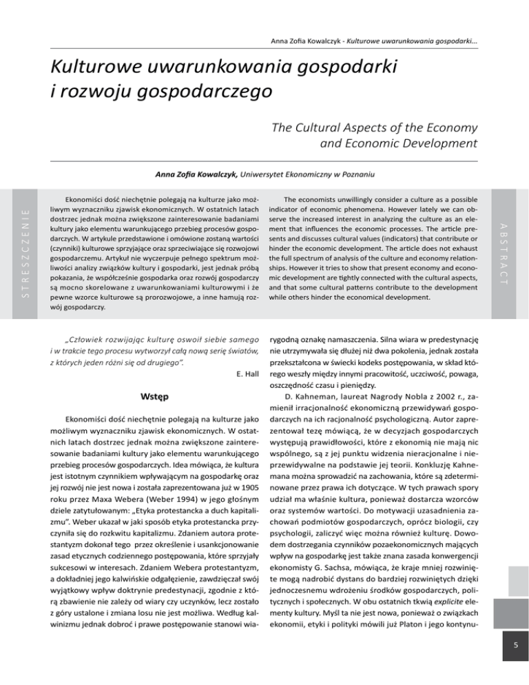 Anna Zofia Kowalczyk - Kulturowe uwarunkowania gospodarki... Kulturowe uwarunkowania gospodarki i rozwoju gospodarczego The Cultural Aspects of the Economy and Economic Development Ekonomiści dość niechętnie polegają na kulturze jako możliwym wyznaczniku zjawisk ekonomicznych. W ostatnich latach dostrzec jednak można zwiększone zainteresowanie badaniami kultury jako elementu warunkującego przebieg procesów gospodarczych. W artykule przedstawione i omówione zostaną wartości (czynniki) kulturowe sprzyjające oraz sprzeciwiające się rozwojowi gospodarczemu. Artykuł nie wyczerpuje pełnego spektrum możliwości analizy związków kultury i gospodarki, jest jednak próbą pokazania, że współcześnie gospodarka oraz rozwój gospodarczy są mocno skorelowane z uwarunkowaniami kulturowymi i że pewne wzorce kulturowe są prorozwojowe, a inne hamują rozwój gospodarczy. The economists unwillingly consider a culture as a possible indicator of economic phenomena. However lately we can observe the increased interest in analyzing the culture as an element that influences the economic processes. The article presents and discusses cultural values (indicators) that contribute or hinder the economic development. The article does not exhaust the full spectrum of analysis of the culture and economy relationships. However it tries to show that present economy and economic development are tightly connected with the cultural aspects, and that some cultural patterns contribute to the development while others hinder the economical development. „Człowiek rozwijając kulturę oswoił siebie samego i w trakcie tego procesu wytworzył całą nową serię światów, z których jeden różni się od drugiego”. E. Hall rygodną oznakę namaszczenia. Silna wiara w predestynację nie utrzymywała się dłużej niż dwa pokolenia, jednak została przekształcona w świecki kodeks postępowania, w skład którego weszły między innymi pracowitość, uczciwość, powaga, oszczędność czasu i pieniędzy. D. Kahneman, laureat Nagrody Nobla z 2002 r., zamienił irracjonalność ekonomiczną przewidywań gospodarczych na ich racjonalność psychologiczną. Autor zaprezentował tezę mówiącą, że w decyzjach gospodarczych występują prawidłowości, które z ekonomią nie mają nic wspólnego, są z jej punktu widzenia nieracjonalne i nieprzewidywalne na podstawie jej teorii. Konkluzję Kahnemana można sprowadzić na zachowania, które są zdeterminowane przez prawa ich dotyczące. W tych prawach spory udział ma właśnie kultura, ponieważ dostarcza wzorców oraz systemów wartości. Do motywacji uzasadnienia zachowań podmiotów gospodarczych, oprócz biologii, czy psychologii, zaliczyć więc można również kulturę. Dowodem dostrzegania czynników pozaekonomicznych mających wpływ na gospodarkę jest także znana zasada konwergencji ekonomisty G. Sachsa, mówiąca, że kraje mniej rozwinięte mogą nadrobić dystans do bardziej rozwiniętych dzięki jednoczesnemu wdrożeniu środków gospodarczych, politycznych i społecznych. W obu ostatnich tkwią explicite elementy kultury. Myśl ta nie jest nowa, ponieważ o związkach ekonomii, etyki i polityki mówili już Platon i jego kontynu- Wstęp Ekonomiści dość niechętnie polegają na kulturze jako możliwym wyznaczniku zjawisk ekonomicznych. W ostatnich latach dostrzec jednak można zwiększone zainteresowanie badaniami kultury jako elementu warunkującego przebieg procesów gospodarczych. Idea mówiąca, że kultura jest istotnym czynnikiem wpływającym na gospodarkę oraz jej rozwój nie jest nowa i została zaprezentowana już w 1905 roku przez Maxa Webera (Weber 1994) w jego głośnym dziele zatytułowanym: „Etyka protestancka a duch kapitalizmu”. Weber ukazał w jaki sposób etyka protestancka przyczyniła się do rozkwitu kapitalizmu. Zdaniem autora protestantyzm dokonał tego przez określenie i usankcjonowanie zasad etycznych codziennego postępowania, które sprzyjały sukcesowi w interesach. Zdaniem Webera protestantyzm, a dokładniej jego kalwińskie odgałęzienie, zawdzięczał swój wyjątkowy wpływ doktrynie predestynacji, zgodnie z którą zbawienie nie zależy od wiary czy uczynków, lecz zostało z góry ustalone i zmiana losu nie jest możliwa. Według kalwinizmu jednak dobroć i prawe postępowanie stanowi wia- ABSTRACT STRESZCZENIE Anna Zofia Kowalczyk, Uniwersytet Ekonomiczny w Poznaniu 5 Rynek - Społeczeństwo - Kultura | nr 2/2012 ator – Arystoteles, podejmując próby zharmonizowania tych czynników. Próbami takimi są teoria sprawiedliwości Platona i koncepcja wspólnoty politycznej Arystotelesa (Jasiński 2007: 24). Wiele lat później także David Landes w rozważaniach nad znaczeniem kultury doszedł do wniosku, że Max Weber miał rację. Autor stwierdza, że: „studiując historię rozwoju gospodarczego, nie sposób oprzeć się wrażeniu, że kultura przesądza prawie o wszystkim” (Landes 2003: 42). Należy tutaj zaznaczyć, że poza kulturą istnieje jeszcze wiele innych uwarunkowań o charakterze ekonomicznym wpływających na gospodarkę. Czynniki, które determinują rozwój gospodarczy to na przykład: stabilne warunki makroekonomiczne, przejrzyste i sprawne instytucja rządowe, adekwatna infrastruktura, wykształcona siła robocza, wysokiej jakości system ochrony zdrowia. Zastanawiając się nad poziomem rozwoju gospodarczego danego narodu należy wziąć pod uwagę choćby uwarunkowania klimatyczne oraz geograficzne i zasoby bogactw naturalnych. Większość państw „bogatych” leży w strefie umiarkowanej, a większość krajów najbiedniejszych położona jest w tropikach. Wyjątki od tej reguły skłaniają jednak do głębszych analiz i przemyśleń. Rosja na przykład leży na tej samej szerokości geograficznej co Kanada i rozwinięte państwa Europy Północnej. Niemniej jednak celem niniejszego artykułu jest zaprezentowanie zależności pomiędzy czynnikami kulturowymi a 