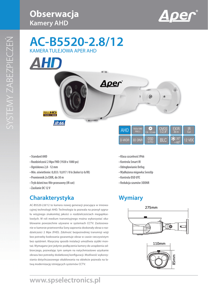 Obserwacja SYSTEMY ZABEZPIECZEŃ Kamery AHD AC-B5520-2.8/12 KAMERA TULEJOWA APER AHD • Standard AHD • Rozdzielczość 2 Mpx FHD (1920 x 1080 px) • Ogniskowa 2,8 - 12 mm • Min. oświetlenie: 0,033 / 0,017 / 0 lx (kolor/cz-b/IR) • Promiennik 2x EXIR, do 30 m • Tryb dzień/noc filtr przesuwny (IR cut) • Zasilanie DC 12 V • Klasa szczelność IP66 • Kontrola Smart IR • Odmgławianie Defog • Wydłużona migawka SensUp • Kontrola OSD UTC • Redukcja szumów 3DDNR Charakterystyka Wymiary AC-B5520-2.8/12 to kamera nowej generacji pracująca w innowacyjnej technologii AHD. Technologia ta pozwala na przesył sygnału wizyjnego znakomitej jakości o rozdzielczościach megapikselowlych. W roli medium transmisyjnego można wykorzystać okablowanie powszechnie używane w systemach CCTV. Zastosowanie w kamerze przetwornika Sony zapewnia doskonały obraz o rozdzielczości 2 Mpx (FHD). Zdolność bezpośredniej transmisji wizji bez potrzeby kodowania gwarantuje obraz w czasie rzeczywistym bez opóźnień. Klasyczny sposób instalacji umożliwia szybki montaż. Wymagane jest jedynie podłączenia kamery do urządzenia odbiorczego, pozwalając tym samym na natychmiastowe uzyskanie obrazu bez potrzeby dodatkowej konfiguracji. Możliwość wykorzystania dotychczasowego okablowania na obiekcie pozwala na łatwą modernizację istniejących systemów CCTV. www.spselectronics.pl Dane techniczne - AC-B5520-2.8/12 PARAMETRY KAMERY Standard wizyjny Rozdzielczość Minimalne oświetlenie AHD / PAL (przełączany) 1080P (1920 x 1080 px) 0,033 / 0,017 / 0 lx (kolor/cz-b/IR) Obiektyw Promiennik podczerwieni Przełączanie dzień/noc Wyjścia wizyjne Joystick 2,8 - 12 mm 2x EXIR zasięg do 30 m Mechanicznie przesuwany filtr podczerwieni (IR Cut) BNC, 1,0 Vp-p,75 Ω Kablowy (wbudowany) Obudowa Tulejowa Klasa szczelności IP66 PRZETWORNIK Typ przetwornika Sony CMOS Rozmiar przetwornika Liczba pikseli 1/2,8'' 2,43 Mpx (1984 x 1225 px) Skanowanie obrazu Progresywne Synchronizacja obrazu Wewnętrzna Elektroniczna migawka Automatyczna / ręczna (1/25 ~ 1/50.000 s) Wydłużona migawka x2 ~ x30 Stosunek sygnał/szum > 50 dB Szeroka dynamika D-WDR FUNKCJE Regulacja jasności 0 ~ 100 Automatyczne wzmacnianie AGC: 0 ~ 15 Redukcja szumów 3DDNR / 2DDNR Kompensacja odświetlenia BLC / HLC Redukcja mgły Defog Wyostrzanie obrazu 0 ~ 10 Korekcja gamma Równoważenie bieli 0,45 Domyślne (AWB) / automatyczne (ATW) / pomieszczenie (Indoor) / plener (Outdoor) / ręczne (Manual) Powiększenie cyfrowe Digital Zoom Orientowanie obrazu Normalne / odbicie / odwrócenie / obrócenie Maski prywatności 4 strefy Detekcja ruchu 4 strefy Tryby dzień/noc Auto. / kolorowy / czarno-biały / Czujnik Sterowanie promiennikiem Smart IR Menu ekranowe OSD Sterowanie UTC Języki menu polski / angielski / chiński / niemiecki / francuski / włoski / hiszpański / rosyjski / portugalski / niderlandzki / turecki INNE Pobór mocy Temperatury pracy Wilgotność pracy Waga Wymiary (śr. x wys.) Centrala - ul. Krakowiaków 80/98, 02-255 Warszawa; tel. 22 518 31 50, fax 22 518 31 70, e-mail: [email protected] Dział Obsługi Klienta i Zamówień - tel. 22 518 31 60, tel. 22 518 31 53, tel. 22 518 31 49, tel. 22 518 31 43, e-mail: [email protected] Serwis - ul. Krakowiaków 80/98, 02-255 Warszawa; tel. 22 518 31 68, fax 22 518 31 48, e-mail: [email protected] Pomoc Techniczna - tel. 22 518 31 61, tel. 22 518 31 59, tel. 22 518 31 57, tel. 22 518 31 54, e-mail: [email protected] DC 12 V (±10%) Maks. 4,8 W -30˚C ~ +60˚C 0 ~ 90 % 730 g 110 x 275 mm Dystrybutor Zasilanie