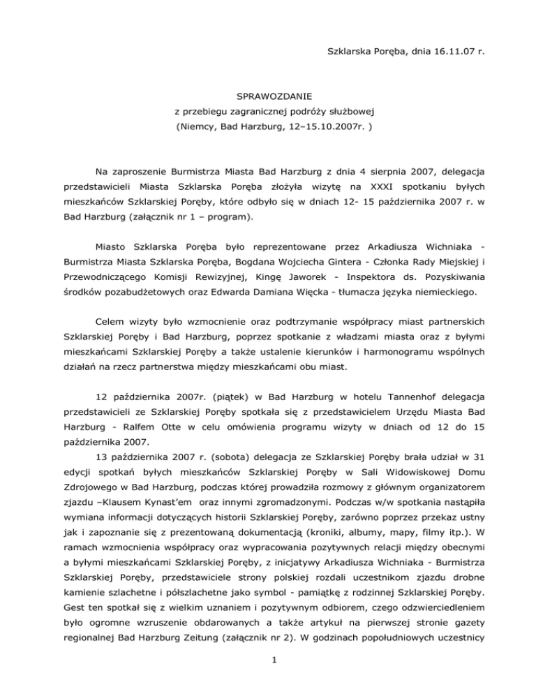 Szklarska Poręba, dnia 16.11.07 r. SPRAWOZDANIE z przebiegu zagranicznej podróży służbowej (Niemcy, Bad Harzburg, 12–15.10.2007r. ) Na zaproszenie Burmistrza Miasta Bad Harzburg z dnia 4 sierpnia 2007, delegacja przedstawicieli Miasta Szklarska Poręba złożyła wizytę na XXXI spotkaniu byłych mieszkańców Szklarskiej Poręby, które odbyło się w dniach 12- 15 października 2007 r. w Bad Harzburg (załącznik nr 1 – program). Miasto Szklarska Poręba było reprezentowane przez Arkadiusza Wichniaka Burmistrza Miasta Szklarska Poręba, Bogdana Wojciecha Gintera - Członka Rady Miejskiej i Przewodniczącego Komisji Rewizyjnej, Kingę Jaworek - Inspektora ds. Pozyskiwania środków pozabudżetowych oraz Edwarda Damiana Więcka - tłumacza języka niemieckiego. Celem wizyty było wzmocnienie oraz podtrzymanie współpracy miast partnerskich Szklarskiej Poręby i Bad Harzburg, poprzez spotkanie z władzami miasta oraz z byłymi mieszkańcami Szklarskiej Poręby a także ustalenie kierunków i harmonogramu wspólnych działań na rzecz partnerstwa między mieszkańcami obu miast. 12 października 2007r. (piątek) w Bad Harzburg w hotelu Tannenhof delegacja przedstawicieli ze Szklarskiej Poręby spotkała się z przedstawicielem Urzędu Miasta Bad Harzburg - Ralfem Otte w celu omówienia programu wizyty w dniach od 12 do 15 października 2007. 13 października 2007 r. (sobota) delegacja ze Szklarskiej Poręby brała udział w 31 edycji spotkań byłych mieszkańców Szklarskiej Poręby w Sali Widowiskowej Domu Zdrojowego w Bad Harzburg, podczas której prowadziła rozmowy z głównym organizatorem zjazdu –Klausem Kynast’em oraz innymi zgromadzonymi. Podczas w/w spotkania nastąpiła wymiana informacji dotyczących historii Szklarskiej Poręby, zarówno poprzez przekaz ustny jak i zapoznanie się z prezentowaną dokumentacją (kroniki, albumy, mapy, filmy itp.). W ramach wzmocnienia współpracy oraz wypracowania pozytywnych relacji między obecnymi a byłymi mieszkańcami Szklarskiej Poręby, z inicjatywy Arkadiusza Wichniaka - Burmistrza Szklarskiej Poręby, przedstawiciele strony polskiej rozdali uczestnikom zjazdu drobne kamienie szlachetne i półszlachetne jako symbol - pamiątkę z rodzinnej Szklarskiej Poręby. Gest ten spotkał się z wielkim uznaniem i pozytywnym odbiorem, czego odzwierciedleniem było ogromne wzruszenie obdarowanych a także artykuł na pierwszej stronie gazety regionalnej Bad Harzburg Zeitung (załącznik nr 2). W godzinach popołudniowych uczestnicy 1 delegacji zapoznali się z infrastrukturą miejską oraz głównymi atrakcjami turystycznymi miasta (m.in. odpowiednik polskiego zakładu estetyki i oczyszczania miasta, park sportowy ze stadionem hippicznym, polem golfowym, boiskiem do piłki nożnej i strzelnicami sportowymi). W trzecim dniu delegacji tj. 14 października 2007 r. (niedziela), reprezentanci naszego miasta wraz z Przewodniczącym Rady Miasta w Bad Harzburg – Wolfgangiem Kullig’em wzięli udział w mszy świętej w kościele katolickim w Bad Harzburg. Następnie uczestniczyli w otwarciu wystawy w „Schreiberhauer Heimatstube” - muzeum pamięci byłych mieszkańców Szklarskiej Poręby, gdzie zgromadzono wiele pamiątek związanych ze Szklarską Porębą z XIX wieku i początku XX wieku. O godzinie 11.30 w Miejskim Ratuszu, Dieter Lipka – przedstawiciel Bad Harzburg, zainaugurował wystawę prac malarskich byłych mieszkańców naszego miasta zainspirowaną motywem „małej ojczyzny” u stóp Szrenicy. Strona niemiecka wystąpiła z zaproszeniem dla artystów tworzących w Szklarskiej Porębie do eksponowania prac w Ratuszu Miejskim w Bad Harzburg. 15 października 2007 r. (poniedziałek) reprezentanci strony polskiej, w Miejskim Ratuszu przeprowadzili rozmowy z Burmistrzem Miasta Bad Harzburg -Ralfem Abrahms’em oraz Ralfem Otte, podczas rozmowy poruszono następujące tematy: 1. projektu tablicy lub kamienia poświęconego byłym mieszkańcom Szklarskiej Poręby oraz jego ewentualnej lokalizacji 2. pomocy w zgromadzeniu wkładu własnego niezbędnego do realizacji planowanego projektu współfinansowanego z funduszy strukturalnych Unii Europejskiej dotyczącego renowacji zabytkowego cmentarza ewangelickiego z XIX wieku w Szklarskiej Porębie Dolnej. Szacunkowy koszt pełnej realizacji projektu wynosi 1 milion euro, przy czym wymagany wkład własny beneficjenta to przynajmniej 15% wartości całkowitej projektu. 3. programu wymiany kulturalnej, oświatowej i sportowej między mieszkańcami miast partnerskich oraz wspólnego udziału w istotnych wydarzeniach obu miast partnerskich 4. pomocy w pozyskaniu środków finansowych na opłatę wpisową (15 tysięcy euro) dla szklarskoporębskiego maratonu narciarskiego Bieg Piastów w związku z możliwością wstąpienia do prestiżowej Światowej Federacji Narciarskiej - Worldloppet Ski Federation, zrzeszającej w sumie 14 najlepszych biegów narciarskich z Europy, Azji, Ameryki i Australii, w tym najznamienitszy- szwedzki Vasaloppet. 5. projektu stworzenia miejsc promocji i informacji o miastach partnerskich na stacjach kolejowych Szklarskiej Poręby, w tym jednej poświęconej miastu Bad Harzburg Podczas rozmów ustalono iż obie strony, tj. Burmistrzowie Arkadiusz Wichniak i Ralf Brahms, podczas sesji obrad rad miejskich przedstawią omawiane kwestie w kontekście budowania budżetów miast na rok 2008 i przyszłe lata. Kontynuowane będą dalsze prace robocze. 2