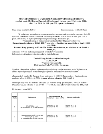 POWIADOMIENIE O WYBORZE NAJKORZYSTNIEJSZEJ OFERTY zgodnie z art. 92.2 Prawo Zamówień Publicznych Ustawa z dn. 29 stycznia 2004 r (Dz. U. z 2010 Nr 113, poz. 759 z późn. zmianami) Nasz znak: GAI.271.2.2013 Proszowice dn. 13.05.2013 rok W związku z prowadzonym postępowaniem na podstawie przepisów ustawy z dnia 29 stycznia 2004 roku Prawo Zamówień Publicznych (Dz.U. z 2010 roku, nr 113, poz. 759 z późn. zmianami) w trybie przetargu nieograniczonego da zadania pn.: "Remonty dróg w ramach usuwania skutków klęsk żywiołowych: Remont drogi gminne nr K 160 290 Proszowice – Opatkowice na odcinku w km 0+000,0 – 0+750,0; Remont drogi gminnej nr K 160 224 Bobin – Dalechowice, na odcinku w km 0+460 – 1+650,0.", dokonano wyboru najkorzystniejszych ofert dla w/w zadania. Informujemy, iż najkorzystniejsze oferty złożyła Firma: Zakład Usług Rolniczych i Budowlanych AGROBUD Wiesław Nowakowski, Piotrkowice Małe 97, 32-104 Koniusza. Zgodnie z kryterium wyboru najkorzystniejszej oferty – najniższa cena, w/w Wykonawca złożył najkorzystniejsze oferty oferując najniższą cenę spośród złożonych ofert. dla zadania 1 (części 1): Remont drogi gminne nr K 160 290 Proszowice – Opatkowice na odcinku w km 0+000,0 – 0+750,0 tj. cena ofertowa brutto 318 120,49 zł oraz najniższą cenę dla zadania 2 (Część 2): Remont drogi gminnej nr K 160 224 Bobin – Dalechowice, na odcinku w km 0+460 – 1+650,0. tj. cena ofertowa brutto: 412 137,15 zł Kryterium – cena 100% Numer oferty Wykonawca 1 STRABAG Sp. z o.o. ul. Parzniewska 10, 05-800 Pruszków 2 Przedsiębiorstwo Robót Inżynieryjno Drogowych Sp. z o.o. ul. Racławicka 41b, 32-200 Miechów Liczba punktów w kryterium - cena 100% Łączna punktacja Zadanie nr 1: 76 Zadanie nr 2: 70 Zadanie nr 1: 76 Zadanie nr 2: 70 Zadanie nr 1: 97 Zadanie nr 2: 94 Zadanie nr 1: 97 Zadanie nr 2: 94 1 MOTA ENGIL Central Europe S.A. ul. Wadowicka 8W, 30-415 Kraków Zadanie nr 1: 81 Zadanie nr 2: 73 Zadanie nr 1: 81 Zadanie nr 2: 73 4 SKANSKA S.A. ul. Józefa Zajączka 9, 01-518 Warszawa Zadanie nr 1: 73 Zadanie nr 2: 73 Zadanie nr 1: 73 Zadanie nr 2: 73 5 PROBUD Zakład Usług Budowlano – Projektowych, Spółdzielnia Rzemieślnicza, ul. Krakowska 7, 32-100 Proszowice Zadanie nr 1: 85 Zadanie nr 2: 79 Zadanie nr 1: 85 Zadanie nr 2: 79 6 Zakład Usług Rolniczych i Budowlanych AGROBUD Wiesław Nowakowski Piotrkowice Małe 97, 32-104 Koniusza Zadanie nr 1: 100 Zadanie nr 2: 100 Zadanie nr 1: 100 Zadanie nr 2: 100 3 2