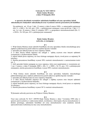 Uchwała Nr XXV/205/12 Rada Gminy Branice z dnia 19 listopada 2012 w sprawie określenia warunków udzielania bonifikat od ceny sprzedaży lokali mieszkalnych i budynków mieszkalnych oraz wysokości stawek procentowych bonifikat Na podstawie art. 18 ust. 2 pkt. 15 ustawy z dnia 8 marca 1990 r. o samorządzie gminnym (Dz. U. z 2001 r. Nr 142, poz. 1591, z późniejszymi zmianami ) oraz art.68 ust. 1 pkt 1 i 7, ust. 1a i ust. 1b ustawy z dnia 21 sierpnia 1997 r. o gospodarce nieruchomościami (Dz. U. z 2010 r. Nr 102 poz. 651 z późniejszymi zmianami) Rada Gminy Branice uchwala, co następuje : § 1. 1. Wójt Gminy Branice może udzielić bonifikaty od ceny sprzedaży lokalu mieszkalnego przy zapłacie jednorazowej jeżeli nabywca spełnia łącznie warunki: 1/ sprzedaż jest dokonywana na rzecz najemcy lokalu, 2/ w dniu zbycia lokalu najemca nie zalegał z opłatą czynszu oraz innymi opłatami związanymi z użytkowaniem lokalu, 3/ najem lokalu przez najemcę, na rzecz którego następuje zbycie, trwał przez co najmniej 36 miesięcy. 2. Stawka procentowa bonifikaty wynosi 50% wartości nieruchomości z zastrzeżeniem treści ust. 3. 3. Jeśli sprzedaż lokalu następuje na rzecz najemcy, który jest repatriantem w rozumieniu art. 1 ust. 2 ustawy z dnia 9 listopada 2000 r. (Dz. U. z 2004 r. Nr 53, poz. 532 z późniejszymi zmianami), stawka procentowa bonifikaty wynosi 90% wartości nieruchomości. § 2. 1. Wójt Gminy może udzielić bonifikaty od ceny sprzedaży budynku mieszkalnego jednorodzinnego przy zapłacie jednorazowej jeżeli nabywca spełnia łącznie warunki : 1/ sprzedaż jest dokonywana na rzecz najemcy budynku, 2/ w dniu zbycia budynku najemca nie zalegał z zapłatą czynszu oraz innymi opłatami związanymi z użytkowaniem budynku, 3/ najem budynku przez najemcę, na rzecz którego następuje zbycie, trwał przez co najmniej 36 miesięcy. 2. Stawka procentowa bonifikaty wynosi 50 % wartości nieruchomości. § 3. Wykonanie uchwały powierza się Wójtowi Gminy Branice. § 4. Traci moc uchwała Nr XLV /209/98 Rady Gminy Branice z dnia 7 kwietnia 1998 roku w sprawie pierwszeństwa w nabywaniu lokali, zwolnienia z obowiązku zbycia nieruchomości w drodze przetargu, udzielania bonifikat od ceny nieruchomości oraz ustalenia stawek oprocentowania rozłożonej na raty ceny nieruchomości. § 5. Uchwała podlega publikacji w Dzienniku Urzędowym Województwa Opolskiego i wchodzi w życie po upływie 14 dni od dnia opublikowania z mocą obowiązującą od dnia 1 lipca 2013 r.