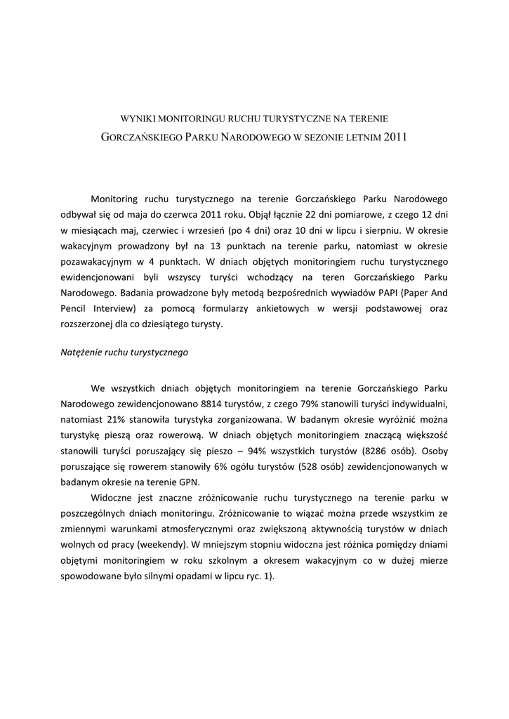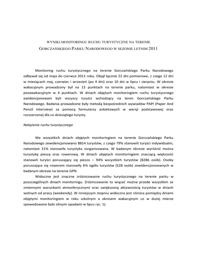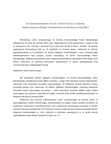 WYNIKI MONITORINGU RUCHU TURYSTYCZNE NA TERENIE GORCZAŃSKIEGO PARKU NARODOWEGO W SEZONIE LETNIM 2011 Monitoring ruchu turystycznego na terenie Gorczaoskiego Parku Narodowego odbywał się od maja do czerwca 2011 roku. Objął łącznie 22 dni pomiarowe, z czego 12 dni w miesiącach maj, czerwiec i wrzesieo (po 4 dni) oraz 10 dni w lipcu i sierpniu. W okresie wakacyjnym prowadzony był na 13 punktach na terenie parku, natomiast w okresie pozawakacyjnym w 4 punktach. W dniach objętych monitoringiem ruchu turystycznego ewidencjonowani byli wszyscy turyści wchodzący na teren Gorczaoskiego Parku Narodowego. Badania prowadzone były metodą bezpośrednich wywiadów PAPI (Paper And Pencil Interview) za pomocą formularzy ankietowych w wersji podstawowej oraz rozszerzonej dla co dziesiątego turysty. Natężenie ruchu turystycznego We wszystkich dniach objętych monitoringiem na terenie Gorczaoskiego Parku Narodowego zewidencjonowano 8814 turystów, z czego 79% stanowili turyści indywidualni, natomiast 21% stanowiła turystyka zorganizowana. W badanym okresie wyróżnid można turystykę pieszą oraz rowerową. W dniach objętych monitoringiem znaczącą większośd stanowili turyści poruszający się pieszo – 94% wszystkich turystów (8286 osób). Osoby poruszające się rowerem stanowiły 6% ogółu turystów (528 osób) zewidencjonowanych w badanym okresie na terenie GPN. Widoczne jest znaczne zróżnicowanie ruchu turystycznego na terenie parku w poszczególnych dniach monitoringu. Zróżnicowanie to wiązad można przede wszystkim ze zmiennymi warunkami atmosferycznymi oraz zwiększoną aktywnością turystów w dniach wolnych od pracy (weekendy). W mniejszym stopniu widoczna jest różnica pomiędzy dniami objętymi monitoringiem w roku szkolnym a okresem wakacyjnym co w dużej mierze spowodowane było silnymi opadami w lipcu ryc. 1). Ryc. 1 Zróżnicowanie natężenia ruchu turystycznego w dniach objętych monitoringiem w 2011 r. Przestrzenne zróżnicowanie ruchu turystycznego Przestrzenne zróżnicowanie ruchu w poszczególnych dniach badania wskazuje duże podobieostwa w zależności od warunków atmosferycznych, tego czy pomiar prowadzony był w dzieo powszedni czy w weekend oraz czy są to miesiące wakacyjne czy pozawakacyjne. Przy korzystnych warunkach do uprawiania turystyki górskiej największe natężenie ruchu obserwowane jest na odcinkach szlaku czerwonego, a zwłaszcza Obidowiec – Turbacz – Kiczora (ryc. 2). W weekendy zwiększa się ilośd turystów na szlaku niebieskim Hucisko – Turbacz oraz zielonym Tobołczyk – Obidowiec. Związane jest to z popularnością punktów wejściowych do GPN. Najwięcej turystów, niezmiennie we wszystkich badaniach, rozpoczyna wędrówkę od strony Koninek, a udział tych punktów w strukturze wejśd znacząco rośnie w dniach weekendowych, co spowodowane jest najbardziej rozbudowaną infrastrukturą turystyczną w tym miejscu. Natomiast przy mniej sprzyjających warunkach atmosferycznych niewielka grupa turystów decyduje się na wyjście w wyższe partie gór (z wyjątkiem grup zorganizowanych, które często pomimo deszczu nie rezygnują z wycieczek), co decyduje o największym w tych dniach natężeniu na szlakach spacerowych (głównie krótkich) w dolnych ich partiach. Ryc. 2 Dobowe natężenie ruchu turystycznego w Gorczaoskim Parku Narodowym w dniach objętych monitoringiem w 2011 roku. Podsumowanie Analiza ruchu turystycznego w GPN pozwoliła na sformułowanie wielu prawidłowości determinujących jego zróżnicowanie czasowe oraz zróżnicowanie przestrzenne. Zróżnicowanie wielkości ruchu w czasie należy rozpatrywad w kontekście cykli sezonowych (w kontekście sezonu letniego), miesięcznych oraz tygodniowych, chod dominujące znaczenie mają panujące warunki atmosferyczne w dniu badania i w przeddzieo badania. Najwięcej turystów odwiedza GPN w miesiącach wakacyjnych. Jednak znacznie wyższe wartości natężenia średniego ruchu dobowego obserwowane są w sierpniu. Wtedy to udział turystki zorganizowanej zmniejsza się przy znaczącej dominacji turystów indywidualnych. Z pośród miesięcy pozawakacyjnych największe natężenie obserwowane jest w maju. Wtedy w dni powszednie zaobserwowad można wiele wycieczek szkolnych, a w weekendy (zwłaszcza w niedzielę) zaznacza się bardzo duży wzrost turystów indywidualnych, w tym również rowerzystów (22.05.2011 – stanowili ponad 17% ogółu turystów). We wszystkich badanych miesiącach turyści wybierają głównie dni weekendowe do odwiedzenia GPN. Tendencja ta jest nieco mniej widoczna w okresie wakacyjnym, zwłaszcza w kontekście niedziel.