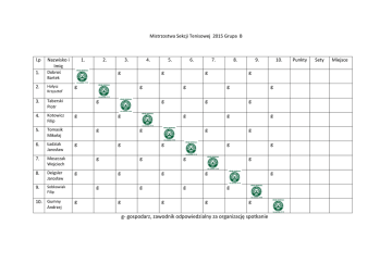 Mistrzostwa Sekcji Tenisowej 2015 Grupa B l.p Nazwisko i Imię 1. Dobroś Bartek 2. Hołysz Krzysztof 3. Taberski Piotr 4. Kotowicz Filip 5. Tomasik Mikołaj 6. Ładziak Jarosław 7. Moszczak Wojciech 8. Deigsler Jarosław 9. Sobkowiak Filip 10. Gumny 1. 2. 3. 4. g g g g g g g g g g g g g g g g g g g g g g g g g g 10. g g g 9. g g g 8. g g g 7. g g g 6. g g g 5. g g g g Andrzej g- gospodarz, zawodnik odpowiedzialny za organizację spotkanie Punkty Sety Miejsce 1.Dobroś Bartosz 2.Hołysz Krzysztof 3.Taberski Piotr 4.Kotowicz Filip 5.Tomasik Mikołaj 6.Ładziak Jarosław 7.Moszczak Wojciech 8.Deigsler Jarosław 9.Sobkowiak Filip 10.Gumny Andrzej 502 919 715 693 555 334 886 696 768 602 634 376 533 785 453 796 959 893 604 339 534 604 561 121 531 866 999 506 077 724 [email protected]@wp.pl [email protected] [email protected] [email protected] [email protected] [email protected] [email protected] [email protected] [email protected] 1. System rozgrywek ligowych: We wszystkie meczach obowiązuje następująca formuła rozegrania meczu: - w secie 1 i 2 przy stanie 6:6 obowiązuje tie-break do 7 punktów - w secie 3 obowiązuje rozegranie super tie-break do 10 punktów 2. Punktacja: -za mecz wygrany 2:0 w setach - 3 punkty -za mecz wygrany 2:1 w setach - 2 punkty -za mecz przegrany 1:2 w setach - 1 punkt -za mecz przegrany 0:2 w setach oraz przez walkower - 0 punktów 3.Obowiązują przepisy gry w tenisa oraz kodeks etyki postępowania zawodnika PZT. Szczegółowy regulamin rozgrywek http://kswarta.pl/tenis 4.Rezerwację i wynik przekazujemy organizatorowi -602 258 573 5.Piłka: sugerowana marka – Wilson, tretorn, dunlop, head, prince, babolat W okresie 01.05-30.08.2015 opłata za wynajęcie kortu na mecz - 0zł (bez limitu czasowego spotkania) Powodzenia … Pozdrawiam Jacek Gąsiorek