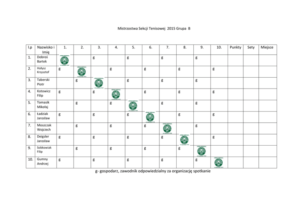 g- gospodarz, zawodnik odpowiedzialny za organizację spotkanie