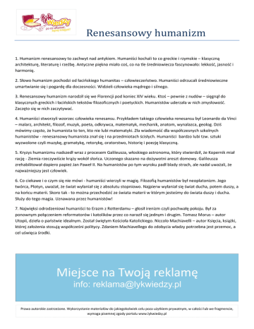 Renesansowy humanizm 1. Humanizm renesansowy to zachwyt nad antykiem. Humaniści kochali to co greckie i rzymskie – klasyczną architekturę, literaturę i rzeźbę. Antyczne piękno miało coś, co na tle średniowiecza fascynowało: lekkośd, jasnośd i harmonię. 2. Słowo humanizm pochodzi od łacioskiego humanitas – człowieczeostwo. Humaniści odrzucali średniowieczne umartwianie się i pogardę dla doczesności. Widzieli człowieka mądrego i silnego. 3. Renesansowy humanizm narodził się we Florencji pod koniec XIV wieku. Ktoś – pewnie z nudów – sięgnął do klasycznych greckich i łacioskich tekstów filozoficznych i poetyckich. Humanistów uderzała w nich zmysłowośd. Zaczęto się w nich zaczytywad. 4. Humaniści stworzyli wzorzec człowieka renesansu. Przykładem takiego człowieka renesansu był Leonardo da Vinci – malarz, architekt, filozof, muzyk, poeta, odkrywca, matematyk, mechanik, anatom, wynalazca, geolog. Dziś mówimy często, że humanista to ten, kto nie lubi matematyki. Zła wiadomośd dla współczesnych szkolnych humanistów - renesansowy humanista znał się i na przedmiotach ścisłych. Humaniści bardzo lubi tzw. sztuki wyzwolone czyli muzykę, gramatykę, retorykę, oratorstwo, historię i poezję klasyczną. 5. Kryzys humanizmu nadszedł wraz z procesem Galileusza, włoskiego astronoma, który stwierdził, że Kopernik miał rację - Ziemia rzeczywiście krąży wokół słooca. Uczonego skazano na dożywotni areszt domowy. Galileusza zrehabilitował dopiero papież Jan Paweł II. Na humanistów po tym wyroku padł blady strach, ale nadal uważali, że najważniejszy jest człowiek. 6. Co ciekawe i o czym się nie mówi - humaniści wierzyli w magię. Filozofią humanistów był neoplatonizm. Jego twórca, Plotyn, uważał, że świat wyłaniał się z absolutu stopniowo. Najpierw wyłaniał się świat ducha, potem duszy, a na koocu materii. Skoro tak - to można przechodzid ze świata materii w którym jesteśmy do świata duszy i ducha. Służy do tego magia. Uznawana przez humanistów! 7. Najwięksi odrodzeniowi humaniści to Erazm z Rotterdamu – głosił irenizm czyli pochwałę pokoju. Był za ponownym połączeniem reformatorów i katolików przez co naraził się jednym i drugim. Tomasz Morus – autor Utopii, dzieła o paostwie idealnym. Został świętym Kościoła Katolickiego. Niccolo Machiavelli – autor Księcia, książki, której założenia stosują współcześni politycy. Zdaniem Machiavellego do zdobycia władzy potrzebna jest przemoc, a cel uświęca środki. Prawa autorskie zastrzeżone. Wykorzystanie materiałów do jakiegokolwiek celu poza użytkiem prywatnym, w całości lub we fragmencie, wymaga pisemnej zgody portalu www.lykwiedzy.pl