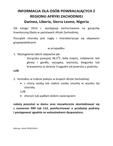 INFORMACJA DLA OSÓB POWRACAJĄCYCH Z REGIONU AFRYKI ZACHODNIEJ Gwinea, Liberia, Sierra Leone, Nigeria Od lutego 2014 r. występują zachorowania na gorączkę krwotoczną Ebola w państwach Afryki Zachodniej. Początek choroby jest nagły i charakteryzuje się objawami grypopodobnymi. w przypadku: 1. Wystąpienia takich objawów jak: Gorączka powyżej 38.50C, bóle mięśni, osłabienie, ból głowy i gardła, wysypka, wymioty, biegunka lub krwawienia w okresie 3 tygodni od powrotu z podróży LUB 2. Kontaktu w trakcie pobytu w krajach Afryki Zachodniej: z chorą osobą lub ciałem osoby zmarłej w wyniku tej choroby LUB chorym lub padłym dzikim zwierzęciem należy pozostać w domu oraz niezwłocznie skontaktować się z numerem 999 lub 112, poinformować o przebytej podróży i postępować zgodnie ze wskazówkami dyspozytora. Wersja z dnia 29.08.2014 r.