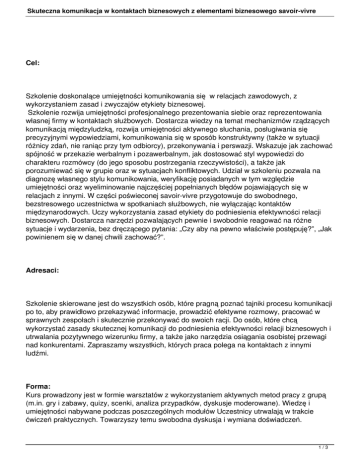 Skuteczna komunikacja w kontaktach biznesowych z elementami biznesowego savoir-vivre Cel: Szkolenie doskonalące umiejętności komunikowania się w relacjach zawodowych, z wykorzystaniem zasad i zwyczajów etykiety biznesowej. Szkolenie rozwija umiejętności profesjonalnego prezentowania siebie oraz reprezentowania własnej firmy w kontaktach służbowych. Dostarcza wiedzy na temat mechanizmów rządzących komunikacją międzyludzką, rozwija umiejętności aktywnego słuchania, posługiwania się precyzyjnymi wypowiedziami, komunikowania się w sposób konstruktywny (także w sytuacji różnicy zdań, nie raniąc przy tym odbiorcy), przekonywania i perswazji. Wskazuje jak zachować spójność w przekazie werbalnym i pozawerbalnym, jak dostosować styl wypowiedzi do charakteru rozmówcy (do jego sposobu postrzegania rzeczywistości), a także jak porozumiewać się w grupie oraz w sytuacjach konfliktowych. Udział w szkoleniu pozwala na diagnozę własnego stylu komunikowania, weryfikację posiadanych w tym względzie umiejętności oraz wyeliminowanie najczęściej popełnianych błędów pojawiających się w relacjach z innymi. W części poświeconej savoir-vivre przygotowuje do swobodnego, bezstresowego uczestnictwa w spotkaniach służbowych, nie wyłączając kontaktów międzynarodowych. Uczy wykorzystania zasad etykiety do podniesienia efektywności relacji biznesowych. Dostarcza narzędzi pozwalających pewnie i swobodnie reagować na różne sytuacje i wydarzenia, bez dręczącego pytania: „Czy aby na pewno właściwie postępuję?”, „Jak powinienem się w danej chwili zachować?”. Adresaci: Szkolenie skierowane jest do wszystkich osób, które pragną poznać tajniki procesu komunikacji po to, aby prawidłowo przekazywać informacje, prowadzić efektywne rozmowy, pracować w sprawnych zespołach i skutecznie przekonywać do swoich racji. Do osób, które chcą wykorzystać zasady skutecznej komunikacji do podniesienia efektywności relacji biznesowych i utrwalania pozytywnego wizerunku firmy, a także jako narzędzia osiągania osobistej przewagi nad konkurentami. Zapraszamy wszystkich, których praca polega na kontaktach z innymi ludźmi. Forma: Kurs prowadzony jest w formie warsztatów z wykorzystaniem aktywnych metod pracy z grupą (m.in. gry i zabawy, quizy, scenki, analiza przypadków, dyskusje moderowane). Wiedzę i umiejętności nabywane podczas poszczególnych modułów Uczestnicy utrwalają w trakcie ćwiczeń praktycznych. Towarzyszy temu swobodna dyskusja i wymiana doświadczeń. 1/3 Skuteczna komunikacja w kontaktach biznesowych z elementami biznesowego savoir-vivre Informacje zwrotne przekazywane przez prowadzącego oraz pozostałych Uczestników dają możliwość lepszego poznania siebie oraz nakreślają kierunek zmian, mających na celu pozbycie się niekorzystnych nawyków oraz wzmocnienie silnych stron (utrwalenie właściwych postaw i zachowań). Warsztaty uzupełnia atrakcyjna prezentacja multimedialna. Program szkolenia: 1. Komunikowanie i jego rola w życiu zawodowym (w tym odpowiedzialność w procesie komunikacji) 2. Typy i style oraz kanały i formy komunikacji w środowisku biznesowym 3. Komunikacja werbalna i niewerbalna 4. Narzędzia skutecznego komunikowania (aktywne słuchanie, umiejętne formułowanie pytań, informacja zwrotna, asertywność, dostosowanie stylu komunikacji oraz argumentacji do typu rozmówcy i jego poziomu kompetencji, itp.) 5. Sztuka perswazji i techniki wpływu społecznego 6. NLP w służbie skutecznej komunikacji 7. Komunikacja w grupie i komunikacja jeden na jeden 8. Negocjacje i praca w zespole 9. Prezentacje i wystąpienia publiczne (przygotowanie i prowadzenie) 10. Pośrednie formy komunikacji i ich wykorzystanie w biznesie (korespondencja, telefon, e-mail) 11. Bariery w komunikacji i sposoby ich przełamywania 12. Porozumiewanie się w sytuacjach trudnych – rodzaje i przyczyny konfliktów, metody postępowania w przypadku różnicy zdań 13. Etykieta codzienna i etykieta biznesu 14. Kultura słowa i gestu w relacjach biznesowych 15. Wizerunek własny biznesmena/bizneswoman (siła pierwszego wrażenia, garderoba, wygląd zewnętrzny) Program szkolenia obejmuje 32h 2/3 Skuteczna komunikacja w kontaktach biznesowych z elementami biznesowego savoir-vivre Powrót 3/3