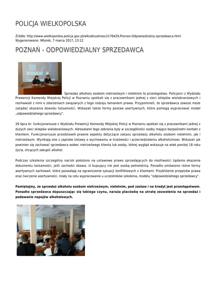 POLICJA WIELKOPOLSKA Źródło: http://www.wielkopolska.policja.gov.pl/wlk/aktualnosci/176429,Poznan-Odpowiedzialny-sprzedawca.html Wygenerowano: Wtorek, 7 marca 2017, 13:12 POZNAŃ - ODPOWIEDZIALNY SPRZEDAWCA Sprzedaż alkoholu osobom nietrzeźwym i nieletnim to przestępstwo. Policjanci z Wydziału Prewencji Komendy Miejskiej Policji w Poznaniu spotkali się z pracownikami jednej z sieci sklepów wielobranżowych i rozmawiali z nimi o zdarzeniach związanych z tego rodzaju łamaniem prawa. Przypomnieli, że sprzedawca zawsze może zażądać okazania dowodu tożsamości. Wskazali także formy postaw asertywnych, które pomogą wypracować model „odpowiedzialnego sprzedawcy". 26 lipca br. funkcjonariusze z Wydziału Prewencji Komendy Miejskiej Policji w Poznaniu spotkali się z pracownikami jednej z dużych sieci sklepów wielobranżowych. Adresatami tego zebrania były w szczególności osoby mające bezpośredni kontakt z klientem. Funkcjonariusze przedstawili prawne aspekty dotyczące zakazu sprzedaży alkoholu osobom nieletnim, jak i nietrzeźwym. Wynikają one z zapisów Ustawy o wychowaniu w trzeźwości i przeciwdziałaniu alkoholizmowi. Wskazali jak powinien się zachować sprzedawca wobec nietrzeźwego klienta lub osoby, której wygląd wskazuje na wiek poniżej 18 roku życia, chcących zakupić alkohol. Podczas szkolenia szczególny nacisk położono na ustawowe prawo sprzedających do możliwości żądania okazania dokumentu tożsamości, jeśli zachodzi obawa, iż kupujący nie jest osobą pełnoletnią. Ponadto omówiono różne formy asertywnych zachowań, które pozwalają na ograniczenie sytuacji konfliktowych z klientami. Przybliżenie przepisów prawa oraz ćwiczenie asertywności, miały na celu wypracowanie u uczestników szkolenia, modelu ''odpowiedzialnego sprzedawcy". Pamiętajmy, że sprzedaż alkoholu osobom nietrzeźwym, nieletnim, pod zastaw i na kredyt jest przestępstwem. Ponadto sprzedawca dopuszczając się takiego czynu, naraża placówkę na utratę zezwolenia na sprzedaż i podawanie napojów alkoholowych. Ocena: 0/5 (0) Tweetnij