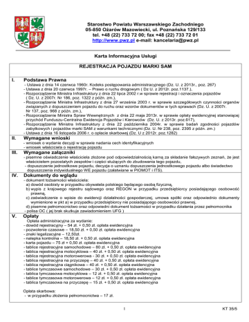 Starostwo Powiatu Warszawskiego Zachodniego 05-850 Ożarów Mazowiecki, ul. Poznańska 129/133 tel. +48 (22) 733 72 00; fax +48 (22) 733 72 01 http://www.pwz.pl e-mail: [email protected] Karta Informacyjna Usługi REJESTRACJA POJAZDU MARKI SAM I. Podstawa Prawna - Ustawa z dnia 14 czerwca 1960r. Kodeks postępowania administracyjnego (Dz. U. z 2013r., poz. 267) - Ustawa z dnia 20 czerwca 1997r. – Prawo o ruchu drogowym ( Dz U. z 2012r. poz.1137.), - Rozporządzenie Ministra Infrastruktury z dnia 22 lipca 2002 r.w sprawie rejestracji i oznaczenia pojazdów ( Dz. U. z 2007r. Nr 186, poz. 1322 z późn. zm.), - Rozporządzenie Ministra Infrastruktury z dnia 27 września 2003 r. w sprawie szczegółowych czynności organów związanych z dopuszczeniem pojazdu do ruchu oraz wzorów dokumentów w tych sprawach (Dz. U. z 2007r. Nr 137, poz. 968 z późn. zm.), - Rozporządzenie Ministra Spraw Wewnętrznych z dnia 22 maja 2013r. w sprawie opłaty ewidencyjnej stanowiącej przychód Funduszu-Centralna Ewidencja Pojazdów i Kierowców (Dz. U. z 2013r. poz.617), - Rozporządzenie Ministra Infrastruktury z dnia 22 października 2004r. w sprawie badań zgodności pojazdów zabytkowych i pojazdów marki SAM z warunkami technicznymi (Dz. U. Nr 238, poz. 2395 z późn. zm.) - Ustawa z dnia 16 listopada 2006 r. o opłacie skarbowej (Dz. U z 2012r. poz.1282) II. Wymagane wnioski - wniosek o wydanie decyzji w sprawie nadania cech identyfikacyjnych - wniosek właściciela o rejestrację pojazdu III. Wymagane załączniki - pisemne oświadczenie właściciela złożone pod odpowiedzialnością karną za składanie fałszywych zeznań, że jest właścicielem pozostałych zespołów i części służących do zbudowania tego pojazdu, - dopuszczenie jednostkowe pojazdu, decyzja o uznaniu dopuszczenia jednostkowego pojazdu albo świadectwo dopuszczenia indywidualnego WE pojazdu (załatwiane w PIOMOT i ITS). IV. Dokumenty do wglądu - dokument tożsamości właściciela: a) dowód osobisty w przypadku obywatela polskiego będącego osobą fizyczną, b) wypis z krajowego rejestru sądowego oraz REGON w przypadku przedsiębiorcy posiadającego osobowość prawną, c) zaświadczenie o wpisie do ewidencji działalności gospodarczej, umowa spółki oraz odpowiednio dokumenty wymienione w pkt a) w przypadku przedsiębiorcy nie posiadającego osobowości prawnej, d) pisemne pełnomocnictwo oraz odpowiedni dokument tożsamości w przypadku działania przez pełnomocnika - polisa OC ( jej brak skutkuje zawiadomieniem UFG ) V. Opłaty Opłata administracyjna za wydanie: - dowód rejestracyjny – 54 zł. + 0,50 zł. opłata ewidencyjna - pozwolenie czasowe – 18,50 zł. + 0,50 zł. opłata ewidencyjna - znaki legalizacyjne – 12,50zł. - nalepka kontrolna – 18,50 zł. + 0,50 zł. opłata ewidencyjna - karta pojazdu – 75 zł + 0,50 zł. opłata ewidencyjna - tablice rejestracyjne samochodowe – 80 zł. + 0,50 zł. opłata ewidencyjna - tablica rejestracyjna motocyklowa – 40 zł. + 0,50 zł. opłata ewidencyjna - tablica rejestracyjna motorowerowa - 30 zł. + 0,50 zł. opłata ewidencyjna - tablica rejestracyjna na przyczepę – 40 zł. + 0,50 zł. opłata ewidencyjna - tablica rejestracyjna ciągnikowa – 40 zł. + 0,50 zł. opłata ewidencyjna - tablice tymczasowe samochodowe – 30 zł. + 0,50 zł. opłata ewidencyjna - tablica tymczasowa motocyklowa – 12 zł. + 0,50 zł. opłata ewidencyjna - tablice tymczasowa motorowerowa – 12 zł. + 0,50 zł. opłata ewidencyjna - tablica tymczasowa na przyczepę – 15 zł. + 0,50 zł. opłata ewidencyjna Opłata skarbowa: - w przypadku złożenia pełnomocnictwa – 17 zł. 1 KT 35/5 Opłaty komunikacyjne można uiścić w kasie Starostwa w godz. pon. 8.00 – 17.00 wt. – pt 8.00 – 16.00 lub na konto Starostwa: GETIN NOBLE BANK S.A. ul. Przyokopowa 33, 01-208 Warszawa 09 1560 0013 2371 4055 3000 0009 Opłaty skarbowe można uiścić w kasie Starostwa na rachunek bankowy Starostwa: GETIN NOBLE BANK S.A. ul. Przyokopowa 33, 01-208 Warszawa 68 1560 0013 2371 4055 3000 0014 lub na rachunek bankowy Urzędu Miejskiego w Ożarowie Mazowieckim PKO BP S.A Nr: 31 1020 1185 0000 4102 0019 1726 VI. Termin załatwienia sprawy 1.Niezwłocznie – sprawy nie wymagające zbierania dowodów, informacji lub wyjaśnień 2.Do 1 miesiąca – sprawy wymagające postępowania wyjaśniającego 3.Do 2 miesięcy – sprawy szczególnie skomplikowane VII. Miejsce załatwienia sprawy Starostwo Powiatu Warszawskiego Zachodniego Wydział Komunikacji i Transportu pokój 28 – rejestracja – godziny przyjęć pon. 8.00 – 16.30 wt. – pt 8.00 – 15.30 pokój 27 – odbiór stałego dowodu rejestracyjnego - godziny przyjęć pon. 8.00 – 17.00 wt. – pt 8.00 – 16.00 informacja – tel. 022 / 733-73-01 Dla mieszkańców Łomianek powyższą sprawę należy załatwić w Filii WKiT w Łomiankach ul. Staszica 2 godziny przyjęć: poniedziałek 10.00 – 18.00 przyjmowanie wniosków o rejestrację pojazdów do godziny 17.30 wtorek-piątek 8.00 – 16.00 przyjmowanie wniosków o rejestrację pojazdów do godziny 15.30 tel.022 / 751-18-55 VIII. Tryb odwoławczy Odwołanie wnosi się do Samorządowego Kolegium Odwoławczego w Warszawie za pośrednictwem Starosty Warszawskiego Zachodniego w terminie 14 dni od dnia doręczenia decyzji IX. Uwagi - Pojazd marki SAM to pojazd zbudowany przy wykorzystaniu nadwozia, podwozia lub ramy konstrukcji własnej. - Dopuszczenie jednostkowe pojazdu jest udzielane za opłatą , w drodze decyzji administracyjnej , przez Dyrektora Transportowego Dozoru Technicznego - Badanie potwierdzające spełnienie warunków i wymagań technicznych w celu dopuszczenia jednostkowego pojazdu jest wykonywane przez jednostkę uprawnioną - Powyższe badanie jest przeprowadzane po wcześniejszym nabiciu numeru identyfikacyjnego w Stacji Kontroli Pojazdów na podstawie wydanej decyzji Starosty Powiatu Warszawskiego Zachodniego - Rejestracja pojazdu marki SAM ma formę decyzji a