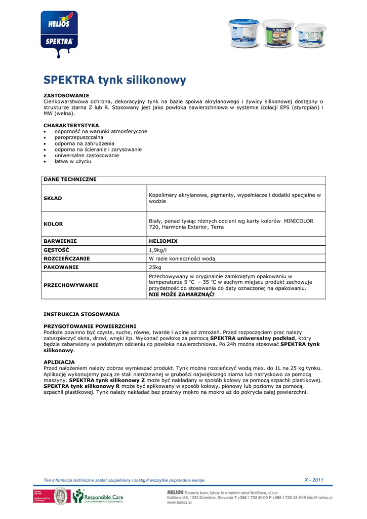 SPEKTRA tynk silikonowy ZASTOSOWANIE Cienkowarstwowa ochrona, dekoracyjny tynk na bazie spoiwa akrylanowego i żywicy silikonowej dostępny o strukturze ziarna Z lub R. Stosowany jest jako powłoka nawierzchniowa w systemie izolacji EPS (styropian) i MW (wełna). CHARAKTERYSTYKA • odporność na warunki atmosferyczne • paroprzepuszczalna • odporna na zabrudzenia • odporna na ścieranie i zarysowanie • uniwersalne zastosowanie • łatwa w użyciu DANE TECHNICZNE SKŁAD Kopolimery akrylanowe, pigmenty, wypełniacze i dodatki specjalne w wodzie KOLOR Biały, ponad tysiąc różnych odcieni wg karty kolorów MINICOLOR 720, Harmonia Exterior, Terra BARWIENIE HELIOMIX GĘSTOŚĆ 1,9kg/l ROZCIEŃCZANIE W razie konieczności wodą PAKOWANIE 25kg PRZECHOWYWANIE Przechowywany w oryginalnie zamkniętym opakowaniu w temperaturze 5 °С – 35 °С w suchym miejscu produkt zachowuje przydatność do stosowania do daty oznaczonej na opakowaniu. NIE MOŻE ZAMARZNĄĆ! INSTRUKCJA STOSOWANIA PRZYGOTOWANIE POWIERZCHNI Podłoże powinno być czyste, suche, równe, twarde i wolne od zmrożeń. Przed rozpoczęciem prac należy zabezpieczyć okna, drzwi, wnęki itp. Wykonać powłokę za pomocą SPEKTRA uniwersalny podkład, który będzie zabarwiony w podobnym odcieniu co powłoka nawierzchniowa. Po 24h można stosować SPEKTRA tynk silikonowy. APLIKACJA Przed nałożeniem należy dobrze wymieszać produkt. Tynk można rozcieńczyć wodą max. do 1L na 25 kg tynku. Aplikację wykonujemy pacą ze stali nierdzewnej w grubości największego ziarna lub natryskowo za pomocą maszyny. SPEKTRA tynk silikonowy Z może być nakładany w sposób kołowy za pomocą szpachli plastikowej. SPEKTRA tynk silikonowy R może być aplikowany w sposób kołowy, pionowy lub poziomy za pomocą szpachli plastikowej. Tynk należy nakładać bez przerwy mokro na mokro aż do pokrycia całej powierzchni. Ten informacje techniczne został uzupełniony i zastąpił wszsytkie poprzednie wersje. X - 2011 WARUNKI PODCZAS NANOSZENIA Temperatura tynku, powietrza, powierzchni minimum +5 °C i maksimum +35 °C. wilgotność względna nie może przekraczać 80 %. Tynk nie może być nanoszony w warunkach bezpośredniego nasłonecznienia, wiatru, mgły czy deszczu. SUSZENIE (T = + 20 ºC, Wilg. Wzgl.= 65 %) Suchy na dotyk po 6-10 godzinach lub po 24 godzinach odporny na deszcz. Niska temperatura lub wyższa wilgotność może spowodować wydłużenie procesu schnięcia i utwardzenia. ZUŻYCIE 2,5 mm Z: 2,0 mm Z: 1,5 mm R: 2,0 mm R: 1,5 mm Z: około około około około około 3,5 3,4 2,8 3,0 2,7 kg/m2 kg/m2 kg/m2 kg/m2 kg/m2 CZYSZCZENIE NARZĘDZI Wodą niezwłocznie po użyciu. SYSTEM TERMICZNEJ IZOLACJI SYSTEM IZOLACJI MW (wełna) SYSTEM IZOLACJI EPS (styropian) Klej SPEKTRA klej do wełny mineralnej SPEKTRA klej do styropianu Materiał izolacyjny z kotwami Wełna mineralna Kotwy zgodne z europejskim zezwoleniem ETA-08/0078 SPEKTRA klej do wełny mineralnej SPEKTRA siatka zbrojeniowa z włókna szklanego SPEKTRA uniwersalna farba podkładowa SPEKTRA tynk silikonowy Styropian Kotwy zgodne z europejskim zezwoleniem ETA-08/0122 SPEKTRA klej do styropianu SPEKTRA siatka zbrojeniowa z włókna szklanego SPEKTRA uniwersalna farba podkładowa SPEKTRA tynk silikonowy Siatka zbrojeniowa Powłoka podkład Powłoka nawierzchniowa * Dla ciemnych kolorów zbliżonym kolorze SPEKTRA tynk silikonowy zalecamy użycie SPEKTRA uniwersalny podkład o UWAGI • • • • SPEKTRA tynk silikonowy zawiera środek, który zapobiega rozwój glonów i pleśni w warunkach atmosferycznych. Nie zalecamy nakładania ciemniejszych odcieni niż Y poniżej 25. Ciemniejsze kolory mają zdolność do akumulowania temperatury w wyniku czego powłoka może pękać. Zaleca się używania tej samej partii produktu lub wiadra dla całej jednej powierzchni. Możliwe są niewielkie odchylenia odcieni w stosunku do karty (materiały naturalne. Ten informacje techniczne został uzupełniony i zastąpił wszsytkie poprzednie wersje. X - 2011