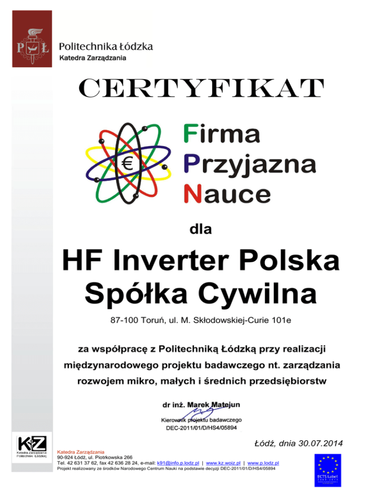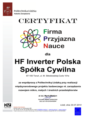 Katedra Zarządzania CERTYFIKAT dla HF Inverter Polska Spółka Cywilna 87-100 Toruń, ul. M. Skłodowskiej-Curie 101e za współpracę z Politechniką Łódzką przy realizacji międzynarodowego projektu badawczego nt. zarządzania rozwojem mikro, małych i średnich przedsiębiorstw Łódź, dnia 30.07.2014 Katedra Zarządzania 90-924 Łódź, ul. Piotrkowska 266 Tel. 42 631 37 62, fax 42 636 28 24, e-mail: [email protected] | www.kz.woiz.pl | www.p.lodz.pl Projekt realizowany ze środków Narodowego Centrum Nauki na podstawie decyzji DEC-2011/01/D/HS4/05894
