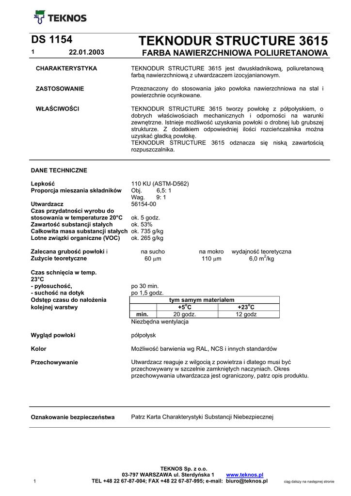 DS 1154 1 TEKNODUR STRUCTURE 3615 22.01.2003 FARBA NAWIERZCHNIOWA POLIURETANOWA CHARAKTERYSTYKA TEKNODUR STRUCTURE 3615 jest dwuskładnikową, poliuretanową farbą nawierzchniową z utwardzaczem izocyjanianowym. ZASTOSOWANIE Przeznaczony do stosowania jako powłoka nawierzchniowa na stal i powierzchnie ocynkowane. WŁAŚCIWOŚCI TEKNODUR STRUCTURE 3615 tworzy powłokę z półpołyskiem, o dobrych właściwościach mechanicznych i odporności na warunki zewnętrzne. Istnieje możliwość uzyskania powłoki o drobnej lub grubszej strukturze. Z dodatkiem odpowiedniej ilości rozcieńczalnika można uzyskać gładką powłokę. TEKNODUR STRUCTURE 3615 odznacza się niską zawartością rozpuszczalnika. DANE TECHNICZNE Lepkość Proporcja mieszania składników Utwardzacz Czas przydatności wyrobu do stosowania w temperaturze 20°C Zawartość substancji stałych Całkowita masa substancji stałych Lotne związki organiczne (VOC) 110 KU (ASTM-D562) Obj. 6,5: 1 Wag. 9: 1 56154-00 ok. 5 godz. ok. 53% ok. 735 g/kg ok. 265 g/kg Zalecana grubość powłoki i Zużycie teoretyczne na sucho 60 µm Czas schnięcia w temp. 23°C - pyłosuchość, - suchość na dotyk Odstęp czasu do nałożenia kolejnej warstwy po 30 min. po 1,5 godz. na mokro 110 µm wydajność teoretyczna 6,0 m2/kg tym samym materiałem +5oC +23oC 20 godz. 12 godz min. Niezbędna wentylacja Wygląd powłoki półpołysk Kolor Możliwość barwienia wg RAL, NCS i innych standardów Przechowywanie Utwardzacz reaguje z wilgocią z powietrza i dlatego musi być przechowywany w szczelnie zamkniętych naczyniach. Okres przechowywania utwardzacza jest ograniczony, patrz opis produktu. Oznakowanie bezpieczeństwa Patrz Karta Charakterystyki Substancji Niebezpiecznej 1 TEKNOS Sp. z o.o. 03-797 WARSZAWA ul. Sterdyńska 1 www.teknos.pl TEL +48 22 67-87-004; FAX +48 22 67-87-995; e-mail: [email protected] ciąg dalszy na następnej stronie TEKNODUR STRUCTURE 3615 SPOSÓB STOSOWANIA Przygotowanie podłoża DS. 1154-1 strona 2 Usunąć z podłoża wszelkie zanieczyszczenia, które mogą niekorzystnie wpływać na proces przygotowania podłoża i malowania. Usunąć również rozpuszczalne w wodzie sole stosując odpowiednie metody, (ISO 12944-4). Powierzchnię należy oczyścić zależnie od rodzaju podłoża. Czas i miejsce przygotowywania powinny być dobrane tak, ażeby powierzchnia przed malowaniem nie była brudna i wilgotna (ISO 12944-4). Warunki podczas nakładania Powierzchnia przeznaczona do malowania musi być sucha. Temperatura otaczającego powietrza, malowanej powierzchni i farby powinna być wyższa niż +10oC, a wilgotność względna powietrza poniżej 80% zarówno podczas nakładania jak i w okresie schnięcia wyrobu. Mycie sprzętu Teknosolv 6220-00 Nakładanie Przed użyciem dokładnie wymieszać. Po 15 min od momentu dodania utwardzacza wzrasta lepkość produktu. Po tym czasie uzyskuje się końcową lepkość do nakładania metodą natrysku. Informacje zawarte w arkuszu danych opierają się o badania laboratoryjne i doświadczenia praktyczne. Są to wyłącznie dane informacyjne i zależą np. od koloru i połysku. Nie mając wpływu na stosowanie i warunki nanoszenia możemy brać odpowiedzialność wyłącznie za jakość wyrobu i gwarantować, że odpowiada on naszym normom. Nie bierzemy również odpowiedzialności za straty lub uszkodzenia powstałe w wyniku nanoszenia wyrobów niezgodnie z zaleceniami lub niewłaściwego ich użycia. 2 18 marca 2004