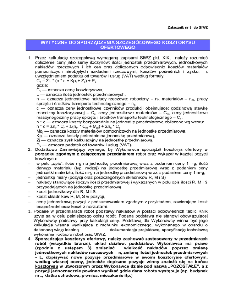 Załącznik nr 8 do SIWZ WYTYCZNE DO SPORZĄDZENIA SZCZEGÓŁOWEGO KOSZTORYSU OFERTOWEGO 1. Przez kalkulację szczegółową wymaganą zapisami SIWZ pkt. XIX, należy rozumieć obliczenie ceny jako sumy iloczynów: ilości jednostek przedmiarowych, jednostkowych nakładów rzeczowych i ich cen oraz doliczonych odpowiednio kosztów materiałów pomocniczych nieobjętych nakładami rzeczowymi, kosztów pośrednich i zysku, z uwzględnieniem podatku od towarów i usług (VAT) według formuły: Ck = ΣL * (n * c + Kpj + Zj ) + PV gdzie: Ck — oznacza cenę kosztorysowa, L — oznacza ilość jednostek przedmiarowych, n — oznacza jednostkowe nakłady rzeczowe: robocizny – nr, materiałów – nm, pracy sprzętu i środków transportu technologicznego – ns, c — oznacza ceny jednostkowe czynników produkcji obejmujące: godzinową stawkę robocizny kosztorysowej – Cr, ceny jednostkowe materiałów – Cm, ceny jednostkowe maszynogodziny pracy sprzętu i środków transportu technologicznego – Cs, n * c — oznacza koszty bezpośrednie na jednostkę przedmiarową obliczone wg wzoru: n * c = Σnr * Cr + Σ(nm * Cm + Mpj) + Σns * Cs Mpj — oznacza koszty materiałów pomocniczych na jednostkę przedmiarową, Kpj — oznacza koszty pośrednie na jednostkę przedmiarową, Zj — oznacza zysk kalkulacyjny na jednostkę przedmiarową, PV — oznacza podatek od towarów i usług (VAT). 2. Dodatkowo Zamawiający wymaga, by Wykonawca sporządził kosztorys ofertowy w porządku zgodnym z załączonym przedmiarem robót oraz wykazał w każdej pozycji kosztorysu: w polu „opis”: ilość r-g na jednostkę przedmiarową wraz z podaniem ceny 1 r-g; ilość danego materiału (typ, rodzaj) na jednostkę przedmiarową wraz z podaniem ceny jednostki materiału; ilość m-g na jednostkę przedmiarową wraz z podaniem ceny 1 m-g; jednostkę miary (pozycji oraz poszczególnych składników R, M i S) nakłady stanowiące iloczyn ilości przedmiarowej i wykazanych w polu opis ilości R, M i S przypadających na jednostkę przedmiarową koszt jednostkowy dla R, M i S, koszt składników R, M, S w pozycji, cenę jednostkową pozycji z podsumowaniem zgodnym z przykładem, zawierające koszt bezpośredni oraz koszt z narzutami. 3. Podane w przedmiarach robót podstawy nakładów w postaci odpowiednich tablic KNR użyte są w celu pełniejszego opisu robót. Podana podstawa nie stanowi obowiązującej Wykonawcy podstawy przy kalkulacji ceny. Podstawą dla Wykonawcy winna być jego kalkulacja własna wynikająca z rachunku ekonomicznego, wykonanego w oparciu o dokonaną wizję lokalną i dokumentację projektową, specyfikację techniczną wykonania i odbioru robót oraz SIWZ. 4. Sporządzając kosztorys ofertowy, należy zachować zastosowany w przedmiarach robót (wszystkie branże), układ działów, poddziałów. Wykonawca ma prawo (zgodnie z ustępem 3) zmieniać wielkość nakładów poprzez zmianę jednostkowych nakładów rzeczowych – n, zmianę ilości jednostek przedmiarowych - L, dopisywać nowe pozycje przedmiarowe w swoim kosztorysie ofertowym, według własnej oceny, jednakże dopisane pozycje winny znaleźć się na końcu kosztorysu w utworzonym przez Wykonawcę dziale pod nazwą „POZOSTAŁE”, a z pozycji jednoznacznie powinno wynikać gdzie dana robota występuje (np. budynek nr.., klatka schodowa, piwnica, mieszkanie itp.) 5. W kosztorysie ofertowym, po każdym dziale musi znajdować się podsumowanie. W podsumowaniu należy wykazać ceny składników R, M i S przed naliczeniem narzutów oraz po naliczeniu każdego z wykazanych narzutów oraz zsumowanych cen tych składników. Zamawiający nie narzuca miejsca naliczenia podatku od towarów i usług (VAT) np. po każdej pozycji, po dziale czy tylko na końcu kosztorysu. 6. Poniżej przedstawiona tabelka pokazuje przykładową pozycję kosztorysową, wzór podsumowania pozycji, działu oraz kosztorysu. Dane zawarte w tabeli i podsumowaniu (podstawa, ilość, nakłady, ceny, narzuty itp.) przyjęto tylko do wyjaśnienia opisu zawartego powyżej. Wzór nie zawiera w podsumowaniu pozycji ani działu, podatku od towaru i usług (VAT), Wykonawca zgodnie z pkt. 5 może go w tych podsumowaniach wykazać.