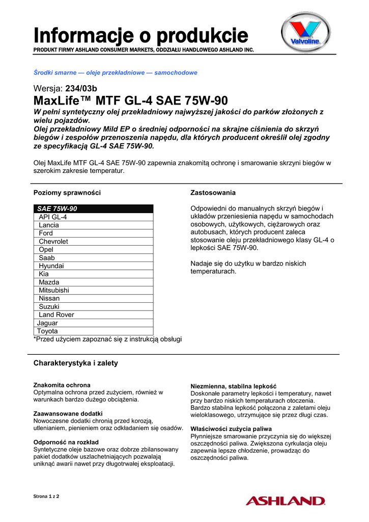 Informacje o produkcie PRODUKT FIRMY ASHLAND CONSUMER MARKETS, ODDZIAŁU HANDLOWEGO ASHLAND INC. Środki smarne — oleje przekładniowe — samochodowe Wersja: 234/03b MaxLife™ MTF GL-4 SAE 75W-90 W pełni syntetyczny olej przekładniowy najwyższej jakości do parków złożonych z wielu pojazdów. Olej przekładniowy Mild EP o średniej odporności na skrajne ciśnienia do skrzyń biegów i zespołów przenoszenia napędu, dla których producent określił olej zgodny ze specyfikacją GL-4 SAE 75W-90. Olej MaxLife MTF GL-4 SAE 75W-90 zapewnia znakomitą ochronę i smarowanie skrzyni biegów w szerokim zakresie temperatur. Poziomy sprawności Zastosowania SAE 75W-90 API GL-4 Lancia Ford Chevrolet Opel Saab Hyundai Kia Mazda Mitsubishi Nissan Suzuki Land Rover Jaguar Toyota *Przed użyciem zapoznać się z instrukcją obsługi Odpowiedni do manualnych skrzyń biegów i układów przeniesienia napędu w samochodach osobowych, użytkowych, ciężarowych oraz autobusach, których producent zaleca stosowanie oleju przekładniowego klasy GL-4 o lepkości SAE 75W-90. Nadaje się do użytku w bardzo niskich temperaturach. Charakterystyka i zalety Znakomita ochrona Optymalna ochrona przed zużyciem, również w warunkach bardzo dużego obciążenia. Zaawansowane dodatki Nowoczesne dodatki chronią przed korozją, utlenianiem, pienieniem oraz odkładaniem się osadów. Odporność na rozkład Syntetyczne oleje bazowe oraz dobrze zbilansowany pakiet dodatków uszlachetniających pozwalają uniknąć awarii nawet przy długotrwałej eksploatacji. Strona 1 z 2 Niezmienna, stabilna lepkość Doskonałe parametry lepkości i temperatury, nawet przy bardzo niskich temperaturach otoczenia. Bardzo stabilna lepkość połączona z zaletami oleju wieloklasowego, utrzymujące się przez długi czas. Właściwości zużycia paliwa Płynniejsze smarowanie przyczynia się do większej oszczędności paliwa. Zwiększona cyrkulacja oleju zapewnia lepsze chłodzenie, prowadząc do oszczędności paliwa. Informacje o produkcie PRODUKT FIRMY ASHLAND CONSUMER MARKETS, ODDZIAŁU HANDLOWEGO ASHLAND INC. Bezpieczeństwo Niniejszy produkt prawdopodobnie nie stwarza znaczącego zagrożenia dla zdrowia lub bezpieczeństwa, o ile jest używany prawidłowo w odpowiednim zastosowaniu. Kartę charakterystyki (MSDS) można uzyskać na życzenie od lokalnego dystrybutora lub pobrać ją z witryny pod adresem http://msds.ashland.com Ochrona środowiska Zużyty olej należy oddawać do odpowiedniego punktu zbiórki. Nie spuszczać do ścieków, gleby lub cieków wodnych. Charakterystyczne właściwości Charakterystyka typowych właściwości jest oparta na aktualnie produkowanym preparacie. W przyszłości produkcja będzie zgodna ze specyfikacjami Valvoline™, natomiast mogą wystąpić zmiany tej charakterystyki. MaxLife MTF GL-4 Klasa lepkości SAE Lepkość, mm2/s w temperaturze 100 ºC. ASTM D-445 Lepkość, mm2/s w temperaturze 100 ºC. Po ścięciu (CEC: L-45-T-93). Lepkość, mm2/s w temperaturze 40 ºC. ASTM D-445 Wskaźnik lepkości ASTM D-2270 Lepkość, mPa.s -40°C. ASTM D-2983 Temperatura krzepnięcia, ºC ASTM D-5950 Ciężar właściwy w temperaturze 15.6°C. ASTM D-4052 Temperatura zapłonu, PMCC, ºC. ASTM D-93 People Who Know Use Valvoline™ Działając w ponad 100 krajach na całym świecie, firma Valvoline to wiodący sprzedawca, dystrybutor i producent wysokiej jakości produktów i usług samochodowych i przemysłowych. Do produktów tej firmy należą smary samochodowe, m. in. MaxLife™ — pierwszy olej silnikowy o formule przeznaczonej specjalnie do pojazdów o wyższym przebiegu; płyny przekładniowe, oleje przekładniowe, smary hydrauliczne, chemikalia motoryzacyjne, produkty specjalne; smary oraz produkty do układu chłodzenia. Aby uzyskać więcej informacji na temat produktów i usług firmy Valvoline, odwiedź www.valvolineeurope.com Autor: AdG Zastępuje – 234/02b 75W-90 17.3 Nie ulega pogorszeniu 106.3 180 <150.000 -36 0.875 160 Niniejsze informacje dotyczą wyłącznie produktów wytwarzanych w następujących lokalizacjach: Europa *Znak towarowy będący własnością osoby trzeciej ™ Znak towarowy Ashland lub przedsiębiorstw zależnych, zarejestrowany w różnych krajach © 2012, Ashland Uważa się, że wszelkie informacje oraz dane przedstawione w niniejszym dokumencie są dokładne i wiarygodne, ale nie mogą być traktowane jako gwarancja, gwarancja wyraźna lub dorozumiana, gwarancja przydatności handlowej lub przydatności do określonego celu, lub reprezentacja, wyraźna lub dorozumiana, za którą Ashland Inc. i jej spółki zależne ponoszą odpowiedzialność prawną. Strona 2 z 2
