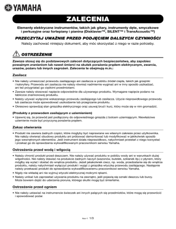 ZALECENIA Elementy elektryczne instrumentów, takich jak gitary, instrumenty dęte, smyczkowe i perkusyjne oraz fortepiany i pianina (Disklavier™, SILENT™ i TransAcoustic™) PRZECZYTAJ UWAŻNIE PRZED PODJĘCIEM DALSZYCH CZYNNOŚCI Należy zachować niniejszy dokument, aby móc skorzystać z niego w razie potrzeby. OSTRZEŻENIE Zawsze stosuj się do podstawowych zaleceń dotyczących bezpieczeństwa, aby zapobiec poważnym zranieniom lub nawet śmierci na skutek porażenia prądem elektrycznym, zwarcia, urazów, pożaru lub innych zagrożeń. Zalecenia te obejmują m.in.: Zasilacz • Nie należy umieszczać przewodu zasilającego ani zasilacza w pobliżu źródeł ciepła, takich jak grzejniki i kaloryfery. Przewodu ani zasilacza nie należy również nadmiernie wyginać ani w inny sposób uszkadzać, ani też przygniatać go ciężkimi przedmiotami. • Zawsze należy stosować napięcie odpowiednie dla używanego produktu. Wymagane napięcie podano na tabliczce znamionowej produktu. • Należy używać wyłącznie wskazanego przewodu zasilającego lub zasilacza. Użycie nieprawidłowego przewodu lub zasilacza może spowodować uszkodzenie lub przegrzanie produktu. • Okresowo sprawdzaj stan gniazdka elektrycznego oraz usuwaj brud i kurz, który może się w nim gromadzić. (Produkty z przewodem zasilającym z uziemieniem) • Upewnij się, że przewód jest podłączony do odpowiedniego gniazda z bolcem uziemiającym. Niewłaściwe uziemienie może być przyczyną porażenia prądem. Zakaz otwierania • Produkt nie zawiera żadnych części, które mogłyby być naprawiane we własnym zakresie przez użytkownika. Nie należy otwierać obudowy produktu ani próbować demontować lub modyfikować w jakikolwiek sposób jego wewnętrznych elementów. Jeśli instrument działa nieprawidłowo, natychmiast przestań z niego korzystać i przekaż go do sprawdzenia wykwalifikowanym pracownikom serwisu Yamaha. Ostrzeżenia przed wodą i wilgocią • Należy chronić produkt przed deszczem. Nie należy używać produktu w pobliżu wody ani w warunkach dużej wilgotności. Nie należy stawiać na produkcie żadnych naczyń (wazonów, butelek, szklanek itp.) z płynem, który mógłby się wylać i dostać do wnętrza produktu. Jeżeli jakakolwiek ciecz, np. woda, przedostanie się do wnętrza produktu, należy natychmiast wyłączyć produkt i wyjąć z gniazdka wtyczkę przewodu zasilającego. Następnie należy przekazać produkt do sprawdzenia wykwalifikowanemu pracownikowi serwisu Yamaha. • Nigdy nie wkładaj ani nie wyjmuj wtyczki elektrycznej mokrymi rękami. • Należy unikać lub zaprzestać używania produktu na zewnątrz, jeśli pojawią się oznaki deszczu lub burzy. Może bowiem dojść do uderzenia pioruna, którego skutki mogą być śmiertelne. Ostrzeżenie przed ogniem • Nie należy ustawiać na instrumencie świeczek ani innych palących się przedmiotów, które mogą się przewrócić i spowodować pożar. Aco-1 1/3 Ostrzeżenia dotyczące baterii (produkty zasilane bateriami) • Należy przestrzegać zaleceń przedstawionych poniżej. Nieprzestrzeganie ich może spowodować wybuch, pożar, przegrzanie lub wyciek elektrolitu. – Nie modyfikuj baterii ani nie rozbieraj jej na części. – Nie usuwaj baterii przez ich spalenie. – Nie należy próbować ładować baterii, które nie są do tego celu przeznaczone. – Nie przechowuj baterii razem z metalowymi przedmiotami, takimi jak naszyjniki, spinki do włosów, monety i klucze. – Używaj tylko wskazanego rodzaju baterii. – Używaj nowych baterii, tego samego rodzaju, modelu oraz pochodzących od tego samego producenta. – Zawsze sprawdzaj, czy baterie są włożone zgodnie z oznaczeniami biegunów +/-. – Jeżeli bateria się wyczerpie lub produkt nie jest używany przez dłuższy czas, należy wyjąć baterie z produktu. – W przypadku korzystania z baterii Ni-MH posługuj się dołączoną do nich instrukcją. Podczas ładowania zawsze stosuj odpowiednie urządzenie ładujące. • Baterie przechowuj poza zasięgiem dzieci, które mogłyby je przypadkiem połknąć. • Jeżeli baterie przeciekają, unikaj kontaktu z wyciekającym płynem. Jeżeli elektrolit dostanie się do oczu, zetknie z ustami lub skórą, zmyj go natychmiast wodą i skontaktuj się z lekarzem. Elektrolity działają korozyjnie i mogą powodować oparzenia lub utratę wzroku. Niepokojące objawy • W przypadku wystąpienia jednego z następujących problemów należy natychmiast wyłączyć produkt i wyjąć wtyczkę elektryczną z gniazdka. W przypadku korzystania z baterii należy wyjąć je wszystkie z produktu. Następnie należy przekazać produkt do sprawdzenia pracownikowi serwisu Yamaha. – Przewód zasilający lub wtyczka zużyły się lub uszkodziły. – Pojawiają się nietypowe zapachy lub dym. – Do wnętrza produktu wpadł jakiś przedmiot. – Podczas korzystania z produktu następuje nagły zanik dźwięku. PRZESTROGA Zawsze należy przestrzegać opisanych poniżej podstawowych zaleceń dotyczących bezpieczeństwa, aby zapobiec uszkodzeniu ciała własnego lub innych osób oraz uszkodzeniu urządzenia lub innego mienia. Zalecenia te obejmują m.in.: Zasilacz • Nie należy podłączać produktu do gniazdka elektrycznego za pomocą rozgałęziacza. Takie podłączenie może obniżyć jakość dźwięku lub spowodować przegrzanie się gniazdka. • Podczas wyciągania wtyczki elektrycznej z gniazdka produktu lub gniazdka ściennego zawsze należy trzymać za wtyczkę, nie za przewód. Pociąganie za przewód może spowodować jego uszkodzenie. • Należy wyciągać wtyczkę elektryczną z gniazdka ściennego, jeśli produkt nie jest używany przez dłuższy czas oraz podczas burzy. Lokalizacja • Jeśli produkt ma otwory wentylacyjne, nie należy umieszczać w ich pobliżu żadnych przedmiotów. Mogłoby to utrudnić właściwe chłodzenie wewnętrznych elementów produktu i spowodować jego przegrzanie. •
