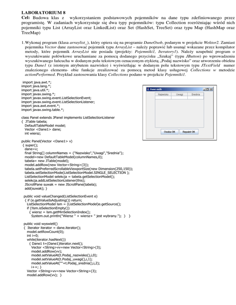 actionPerformed. Przykład zastosowania klasy Collections podano w projekcie Pojemniki1.