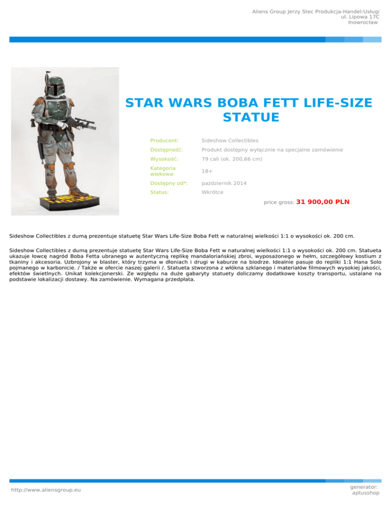 Aliens Group Jerzy Stec Produkcja-Handel-Usługi ul. Lipowa 17C Inowrocław STAR WARS BOBA FETT LIFE-SIZE STATUE Producent: Sideshow Collectibles Dostępność: Produkt dostępny wyłącznie na specjalne zamówienie Wysokość: 79 cali (ok. 200,66 cm) Kategoria wiekowa: 18+ Dostępny od*: pażdziernik 2014 Status: Wkrótce price gross: 31 900,00 PLN Sideshow Collectibles z dumą prezentuje statuetę Star Wars Life-Size Boba Fett w naturalnej wielkości 1:1 o wysokości ok. 200 cm. Sideshow Collectibles z dumą prezentuje statuetę Star Wars Life-Size Boba Fett w naturalnej wielkości 1:1 o wysokości ok. 200 cm. Statueta ukazuje łowcę nagród Boba Fetta ubranego w autentyczną replikę mandaloriańskiej zbroi, wyposażonego w hełm, szczegółowy kostium z tkaniny i akcesoria. Uzbrojony w blaster, który trzyma w dłoniach i drugi w kaburze na biodrze. Idealnie pasuje do repliki 1:1 Hana Solo pojmanego w karbonicie. / Także w ofercie naszej galerii /. Statueta stworzona z włókna szklanego i materiałów filmowych wysokiej jakości, efektów świetlnych. Unikat kolekcjonerski. Ze względu na duże gabaryty statuety doliczamy dodatkowe koszty transportu, ustalane na podstawie lokalizacji dostawy. Na zamówienie. Wymagana przedpłata. http://www.aliensgroup.eu generator: aptusshop
