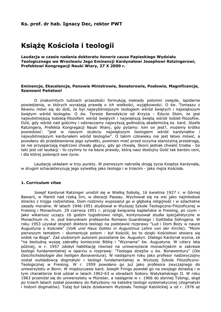 Teologicznego we Wrocławiu Jego Eminencji Kardynałowi Josephowi Ratzingerowi,