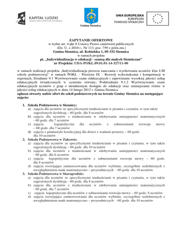 Gmina Siennica ZAPYTANIE OFERTOWE w trybie art. 4 pkt 8 Ustawy Prawo zamówień publicznych (Dz. U. z 2010 r., Nr 113, poz. 759 z późn.zm.) Gmina Siennica, ul. Kobielska 1, 05-332 Siennica w ramach projektu pt. „Indywidualizacja w edukacji - szansą dla małych Sienniczan” nr Projektu: UDA-POKL.09.01.01-14-327/11-00 w ramach realizacji projektu „Indywidualizacja procesu nauczania i wychowania uczniów klas I-III szkoły podstawowej" w ramach POKL - Priorytet IX - Rozwój wykształcenia i kompetencji w regionach, Działanie 9.1 Wyrównywanie szans edukacyjnych i zapewnianie wysokiej jakości usług edukacyjnych świadczonych w systemie oświaty; Poddziałanie 9.1.2 Wyrównywanie szans edukacyjnych uczniów z grup o utrudnionym dostępie do edukacji oraz zmniejszanie różnic w jakości usług edukacyjnych w dniu 14 lutego 2012 r. Gmina Siennica ogłasza otwarty nabór ofert do szkół podstawowych na terenie Gminy Siennica na następujące zajęcia: 1. Szkoła Podstawowa w Siennicy: a) zajęcia dla uczniów ze specyficznymi trudnościami w pisaniu i czytaniu, w tym także zagrożonych dysleksją – 60 godz. dla 8 uczniów b) zajęcia dla uczniów z trudnościami w zdobywaniu umiejętności matematycznych - 60 godz. dla 7 uczniów c) zajęcia logopedyczne dla uczniów z zaburzeniami rozwoju mowy – 60 godz. dla 7 uczniów d) zajęcia z gimnastyki korekcyjnej dla dzieci z wadami postawy – 60 godz. dla 10 uczniów 2. Szkoła Podstawowa w Żakowie: a) zajęcia dla uczniów ze specyficznymi trudnościami w pisaniu i czytaniu, w tym także zagrożonych dysleksją – 60 godz. dla 10 uczniów b) zajęcia dla uczniów z trudnościami w zdobywaniu umiejętności matematycznych - 60 godz. dla 6 uczniów c) zajęcia logopedyczne dla uczniów z zaburzeniami rozwoju mowy – 60 godz. dla 8 uczniów d) zajęcia rozwijające zainteresowania dla uczniów wybitnie, szczególnie uzdolnionych z uwzględnieniem nauk matematyczno – przyrodniczych - 60 godz. dla 10 uczniów 3. Szkoła Podstawowa w Starogrodzie: a) zajęcia dla uczniów ze specyficznymi trudnościami w pisaniu i czytaniu, w tym także zagrożonych dysleksją – 60 godz. dla 8 uczniów b) zajęcia dla uczniów z trudnościami w zdobywaniu umiejętności matematycznych - 60 godz. dla 7 uczniów c) zajęcia logopedyczne dla uczniów z zaburzeniami rozwoju mowy – 60 godz. 6 uczniów d) zajęcia rozwijające zainteresowania dla uczniów wybitnie, szczególnie uzdolnionych z uwzględnieniem nauk matematyczno – przyrodniczych - 60 godz. dla 10 uczniów Gmina Siennica 4. Szkoła Podstawowa w Grzebowilku: a) zajęcia dla uczniów ze specyficznymi trudnościami w pisaniu i czytaniu, w tym także zagrożonych dysleksją – 60 godz. dla 6 uczniów b) zajęcia logopedyczne dla uczniów z zaburzeniami rozwoju mowy – 60 godz. 4 uczniów c) zajęcia z gimnastyki korekcyjnej dla dzieci z wadami postawy – 60 godz. 10 uczniów d) zajęcia rozwijające zainteresowania dla uczniów wybitnie, szczególnie uzdolnionych z uwzględnieniem nauk matematyczno – przyrodniczych - 90 godz. 8 uczniów Opis stanowisk: 1. Nauczyciel prowadzący zajęcia specjalistyczne dla uczniów z trudnościami w czytaniu i pisaniu, w tym zagrożonych dysleksją Zakres zadań i odpowiedzialności: a) Prowadzenie zajęć w grupach w ramach projekt, b) Tworzenie planu zajęć specjalistycznych dla dzieci z trudnościami w czytaniu i pisaniu, w tym zagrożonych dysleksją, c) Współpraca z koordynatorem szkolnym i z koordynatorem projektu, d) Prowadzenie konsultacji z rodzicami uczestników, e) Wykonywanie zadań zleconych przez koordynatora na rzecz projektu w szczególności związanego z monitorowaniem i ewaluacją, sprawozdaniem oraz promocją zajęć specjalistycznych dla dzieci z trudnościami w czytaniu i pisaniu, w tym zagrożonych dysleksją. Wymagania i umiejętności niezbędne, związane ze stanowiskiem prowadzącego zajęcia specjalistyczne dla uczniów z trudnościami w czytaniu i pisaniu, w tym zagrożonych dysleksją: a) pełna zdolność do czynności prawnych oraz korzystanie z pełni praw publicznych, b) niekaralność, c) wykształcenie wyższe, pedagogiczne zgodne ze specyfiką prowadzonych zajęć, d) kwalifikacje do prowadzenia zajęć specjalistycznych dla dzieci z trudnościami w czytaniu i pisaniu, w tym zagrożonych dysleksją, e) doświadczenie zawodowe w pracy dydaktyczno-wychowawczej minimum 3 lata, f) dostępność do prowadzenia zajęć bezpośrednio przed lub po zakończeniu zajęć dydaktycznych przez uczniów. 2. Nauczyciel prowadzący zajęcia rozwijające zainteresowania uczniów wybitnie uzdolnionych ze szczególnym uwzględnieniem nauk matematyczno-przyrodniczych Zakres zadań i odpowiedzialności: a) Prowadzenie zajęć w grupach w ramach projektu, b) Tworzenie planu zajęć rozwijających zainteresowania uczniów wybitnie uzdolnionych ze szczególnym uwzględnieniem nauk matematyczno-przyrodniczych, c) Współpraca z koordynatorem szkolnym i z koordynatorem projektu, d) Prowadzenie konsultacji z rodzicami uczestników, e) Wykonywanie zadań zleconych przez koordynatora na rzecz projektu w szczególności związanego z monitorowaniem i ewaluacją, sprawozdaniem oraz promocją zajęć rozwijających zainteresowania uczniów wybitnie uzdolnionych ze szczególnym uwzględnieniem nauk matematyczno-przyrodniczych. Wymagania i umiejętności niezbędne, związane ze stanowiskiem prowadzącego zajęcia rozwijające zainteresowania uczniów wybitnie uzdolnionych ze szczególnym uwzględnieniem nauk matematyczno-przyrodniczych Projekt „Indywidualizacja w edukacji – szansą dla małych Sienniczan” w ramach Programu Operacyjnego Kapitał Ludzki współfinansowany ze środków Europejskiego Funduszu Społecznego Gmina Siennica a) b) c) d) pełna zdolność do czynności prawnych oraz korzystanie z pełni praw publicznych, niekaralność, wykształcenie wyższe, pedagogiczne zgodne ze specyfiką prowadzonych zajęć, kwalifikacje do pr
