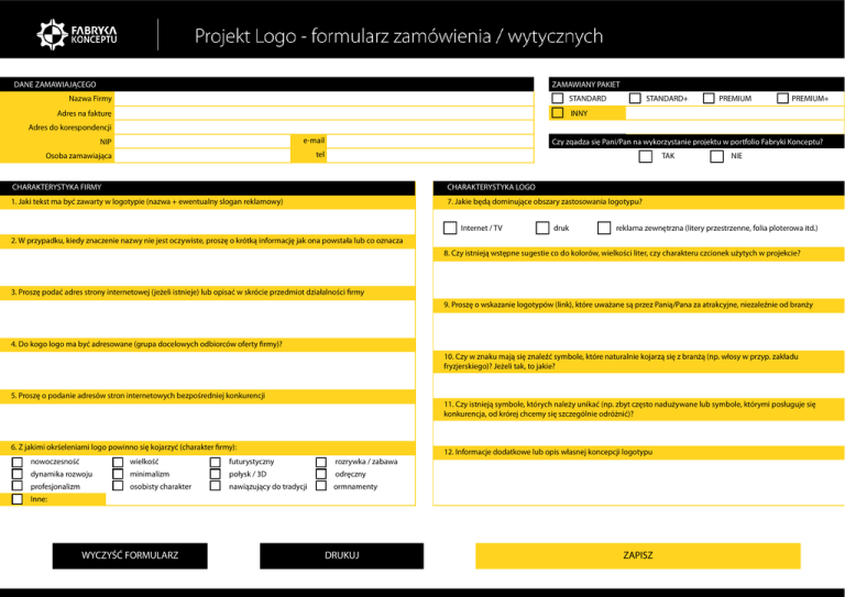 DANE ZAMAWIAJĄCEGO ZAMAWIANY PAKIET Nazwa Firmy STANDARD Adres na fakturę STANDARD+ PREMIUM PREMIUM+ INNY Adres do korespondencji NIP e-mail Osoba zamawiająca tel Czy zgadza się Pani/Pan na wykorzystanie projektu w portfolio Fabryki Konceptu? TAK CHARAKTERYSTYKA FIRMY CHARAKTERYSTYKA LOGO 1. Jaki tekst ma być zawarty w logotypie (nazwa + ewentualny slogan reklamowy) 7. Jakie będą dominujące obszary zastosowania logotypu? Internet / TV druk NIE reklama zewnętrzna (litery przestrzenne, folia ploterowa itd.) 2. W przypadku, kiedy znaczenie nazwy nie jest oczywiste, proszę o krótką informację jak ona powstała lub co oznacza 8. Czy istnieją wstępne sugestie co do kolorów, wielkości liter, czy charakteru czcionek użytych w projekcie? 3. Proszę podać adres strony internetowej (jeżeli istnieje) lub opisać w skrócie przedmiot działalności firmy 9. Proszę o wskazanie logotypów (link), które uważane są przez Panią/Pana za atrakcyjne, niezaleźnie od branży 4. Do kogo logo ma być adresowane (grupa docelowych odbiorców oferty firmy)? 10. Czy w znaku mają się znaleźć symbole, które naturalnie kojarzą się z branżą (np. włosy w przyp. zakładu fryzjerskiego)? Jeżeli tak, to jakie? 5. Proszę o podanie adresów stron internetowych bezpośredniej konkurencji 11. Czy istnieją symbole, których należy unikać (np. zbyt często nadużywane lub symbole, którymi posługuje się konkurencja, od krórej chcemy się szczególnie odróżnić)? 6. Z jakimi okrśeleniami logo powinno się kojarzyć (charakter firmy): nowoczesność wielkość futurystyczny rozrywka / zabawa dynamika rozwoju minimalizm połysk / 3D odręczny profesjonalizm osobisty charakter nawiązujący do tradycji ormnamenty 12. Informacje dodatkowe lub opis własnej koncepcji logotypu Inne: WYCZYŚĆ FORMULARZ DRUKUJ ZAPISZ
