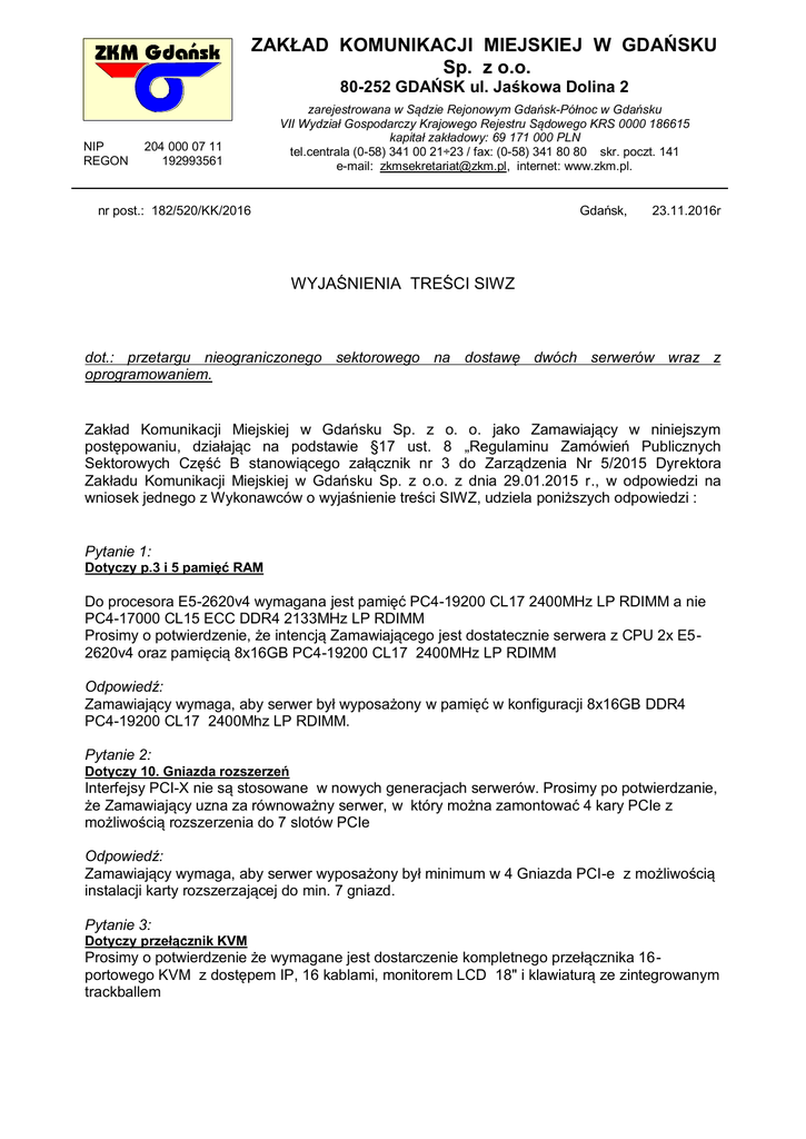 ZAKŁAD KOMUNIKACJI MIEJSKIEJ W GDAŃSKU Sp. z o.o. 80-252 GDAŃSK ul. Jaśkowa Dolina 2 NIP REGON 204 000 07 11 192993561 zarejestrowana w Sądzie Rejonowym Gdańsk-Północ w Gdańsku VII Wydział Gospodarczy Krajowego Rejestru Sądowego KRS 0000 186615 kapitał zakładowy: 69 171 000 PLN tel.centrala (0-58) 341 00 21÷23 / fax: (0-58) 341 80 80 skr. poczt. 141 e-mail: [email protected], internet: www.zkm.pl. Gdańsk, nr post.: 182/520/KK/2016 23.11.2016r WYJAŚNIENIA TREŚCI SIWZ dot.: przetargu nieograniczonego sektorowego na dostawę dwóch serwerów wraz z oprogramowaniem. Zakład Komunikacji Miejskiej w Gdańsku Sp. z o. o. jako Zamawiający w niniejszym postępowaniu, działając na podstawie §17 ust. 8 „Regulaminu Zamówień Publicznych Sektorowych Część B stanowiącego załącznik nr 3 do Zarządzenia Nr 5/2015 Dyrektora Zakładu Komunikacji Miejskiej w Gdańsku Sp. z o.o. z dnia 29.01.2015 r., w odpowiedzi na wniosek jednego z Wykonawców o wyjaśnienie treści SIWZ, udziela poniższych odpowiedzi : Pytanie 1: Dotyczy p.3 i 5 pamięć RAM Do procesora E5-2620v4 wymagana jest pamięć PC4-19200 CL17 2400MHz LP RDIMM a nie PC4-17000 CL15 ECC DDR4 2133MHz LP RDIMM Prosimy o potwierdzenie, że intencją Zamawiającego jest dostatecznie serwera z CPU 2x E52620v4 oraz pamięcią 8x16GB PC4-19200 CL17 2400MHz LP RDIMM Odpowiedź: Zamawiający wymaga, aby serwer był wyposażony w pamięć w konfiguracji 8x16GB DDR4 PC4-19200 CL17 2400Mhz LP RDIMM. Pytanie 2: Dotyczy 10. Gniazda rozszerzeń Interfejsy PCI-X nie są stosowane w nowych generacjach serwerów. Prosimy po potwierdzanie, że Zamawiający uzna za równoważny serwer, w który można zamontować 4 kary PCIe z możliwością rozszerzenia do 7 slotów PCIe Odpowiedź: Zamawiający wymaga, aby serwer wyposażony był minimum w 4 Gniazda PCI-e z możliwością instalacji karty rozszerzającej do min. 7 gniazd. Pytanie 3: Dotyczy przełącznik KVM Prosimy o potwierdzenie że wymagane jest dostarczenie kompletnego przełącznika 16portowego KVM z dostępem IP, 16 kablami, monitorem LCD 18" i klawiaturą ze zintegrowanym trackballem Odpowiedź: Zamawiający wymaga dostarczenia przełącznika KVM wg zapisów SIWZ. Nie jest wymagane dostarczenie monitora LCD, klawiatury oraz urządzenia wskazującego. Zamawiający wymaga dostarczenia przełącznika wraz z okablowaniem. Przełącznik musi mieć możliwość podłączenia monitora, klawiatury oraz myszki. Przedmiotowa zmiana nie powoduje zmiany terminu składania ofert. Wykonawcy są zobowiązani uwzględnić powyższe zmiany, które stanowią integralną cześć SIWZ, podczas sporządzania ofert. Treść pozostałych zapisów Specyfikacji Istotnych Warunków Zamówienia pozostaje bez zmian.