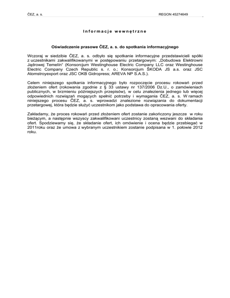 ČEZ, a. s. REGON 45274649 Informacje wewnętrzne Oświadczenie prasowe ČEZ, a. s. do spotkania informacyjnego Wczoraj w siedzibie ČEZ, a. s. odbyło się spotkanie informacyjne przedstawicieli spółki z uczestnikami zakwalifikowanymi w postępowaniu przetargowym: „Dobudowa Elektrowni Jądrowej Temelín“ (Konsorcjum Westinghouse Electric Company LLC oraz Westinghouse Electric Company Czech Republic s. r. o.; Konsorcjum ŠKODA JS a.s. oraz JSC Atomstroyexport oraz JSC OKB Gidropress; AREVA NP S.A.S.). Celem niniejszego spotkania informacyjnego było rozpoczęcie procesu rokowań przed złożeniem ofert (rokowania zgodnie z § 33 ustawy nr 137/2006 Dz.U., o zamówieniach publicznych, w brzmieniu późniejszych przepisów), w celu znalezienia jednego lub więcej odpowiednich rozwiązań mogących spełnić potrzeby i wymagania ČEZ, a. s. W ramach niniejszego procesu ČEZ, a. s. wprowadzi znalezione rozwiązania do dokumentacji przetargowej, która będzie służyć uczestnikom jako podstawa do opracowania oferty. Zakładamy, że proces rokowań przed złożeniem ofert zostanie zakończony jeszcze w roku bieżącym, a następnie wszyscy zakwalifikowani uczestnicy zostaną wezwani do składania ofert. Spodziewamy się, że składanie ofert, ich omówienie i ocena będzie przebiegać w 2011roku oraz że umowa z wybranym uczestnikiem zostanie podpisana w 1. połowie 2012 roku.